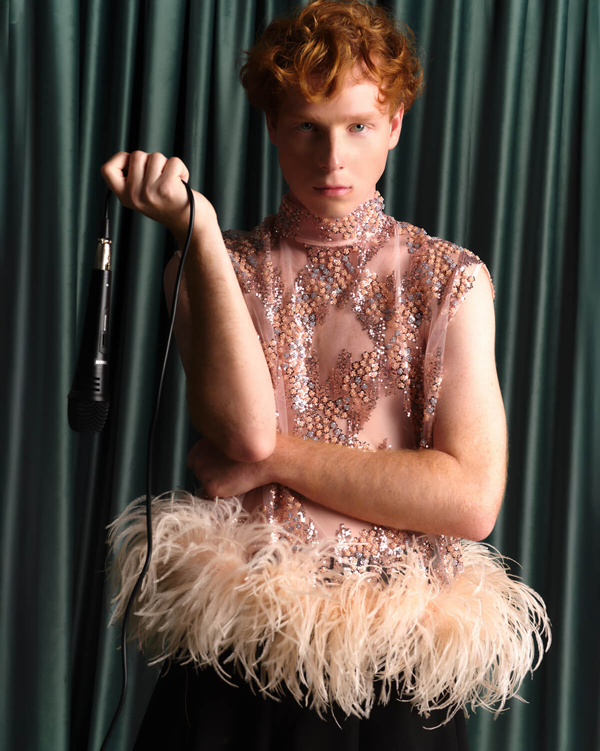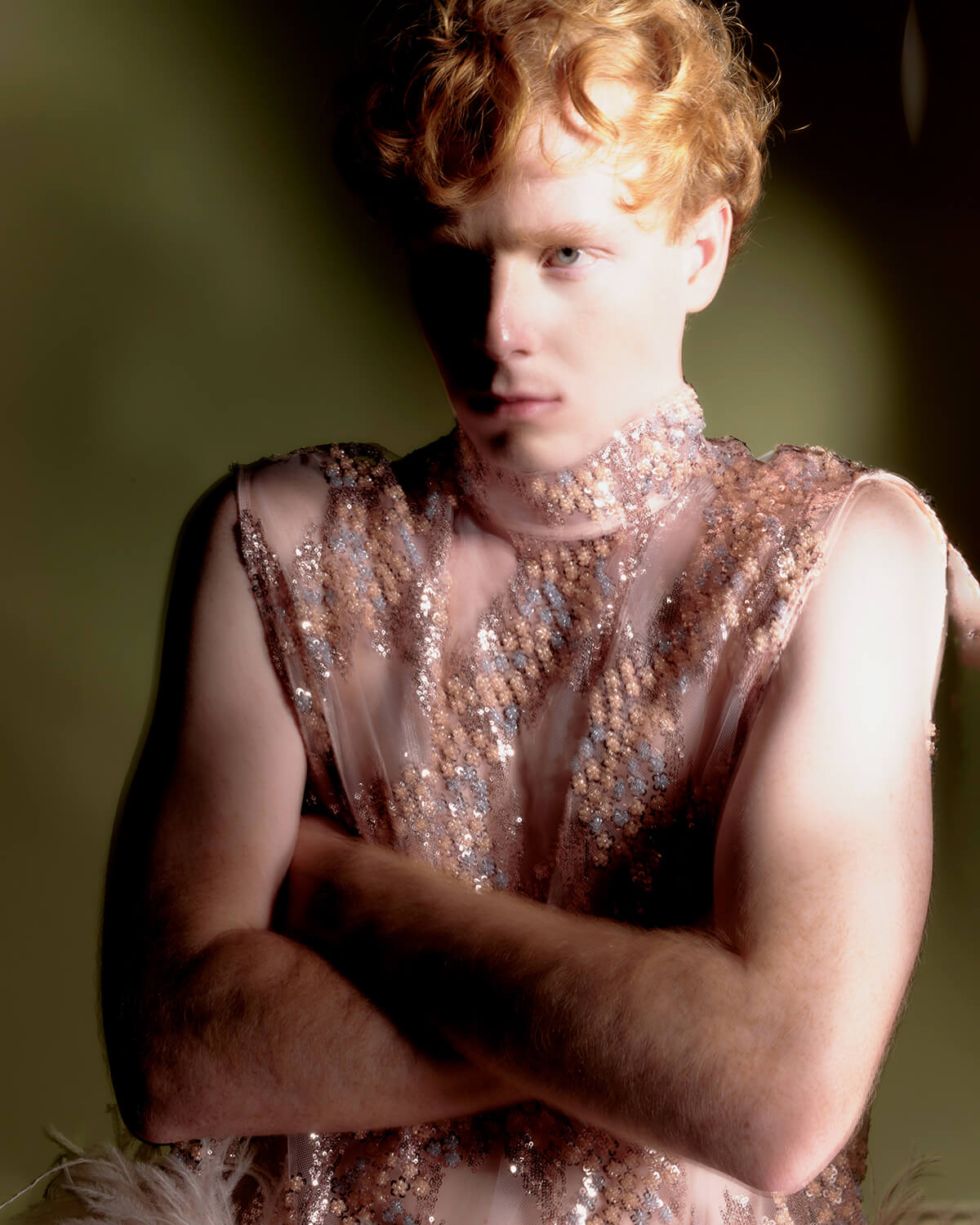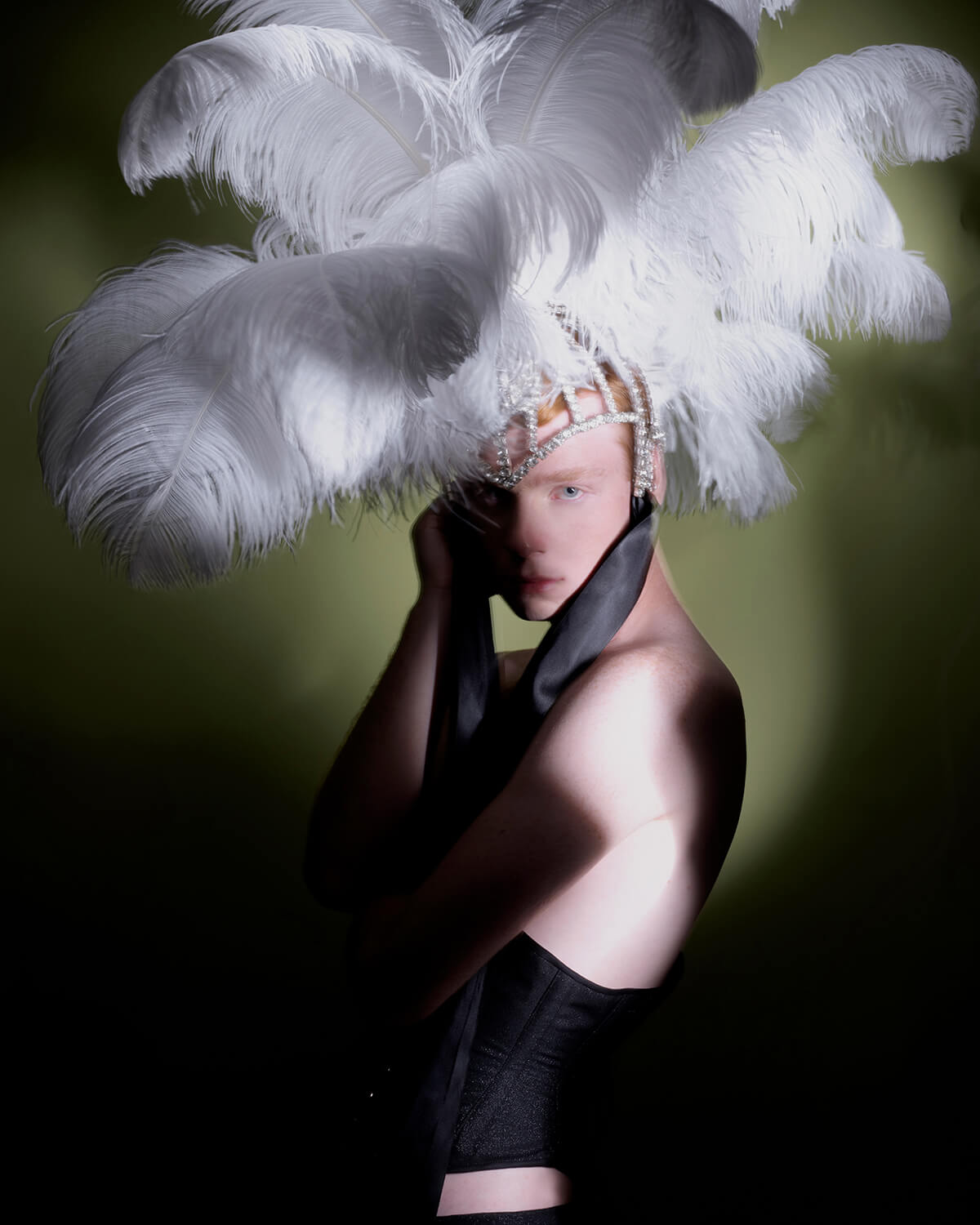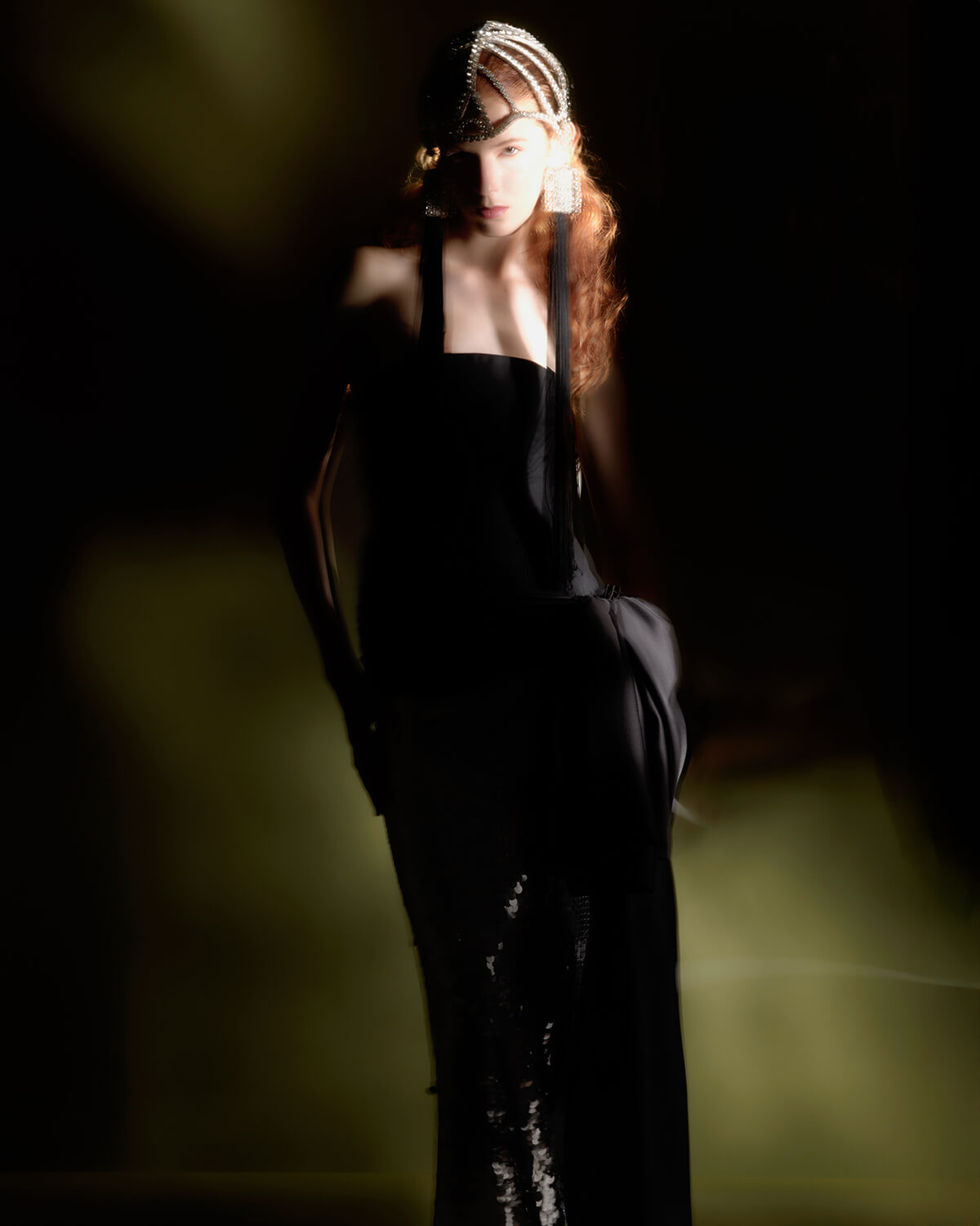 Siempre me ha atraído la noche como espacio de liberación: ese momento en el que las máscaras del día caen y cada uno puede mostrarse con más verdad. El cine noir y el universo de las vedettes representan muy bien ese territorio ambiguo entre el glamour y la vulnerabilidad. Para trasladar esa atmósfera a la colección, recurrí a tejidos que evocan la luz artificial y el resplandor de los escenarios —satén, strass, pedrería— junto a elementos más etéreos como el tul y las plumas, que aportan un halo de fragilidad. Las siluetas buscan ese contraste entre lo insinuante y lo estructurado: corsés que contienen y a la vez revelan, capas de transparencias que sugieren más que muestran. Todo ello construye una narrativa visual que habla de deseo, de poder y de misterio.
