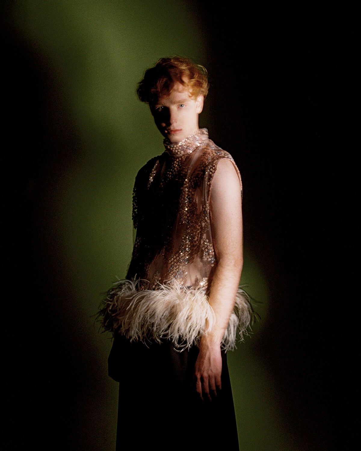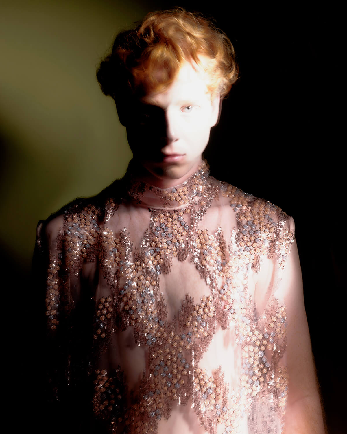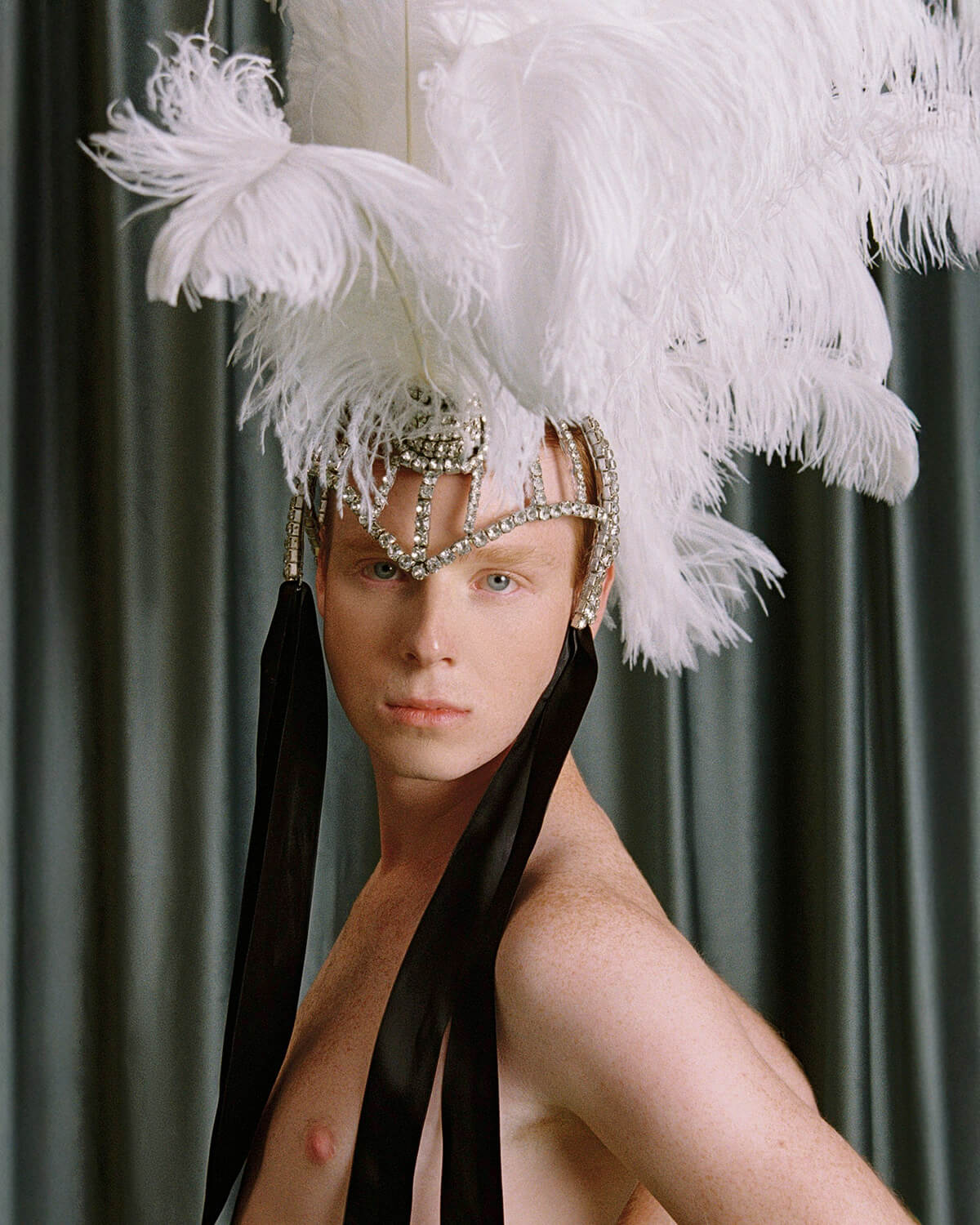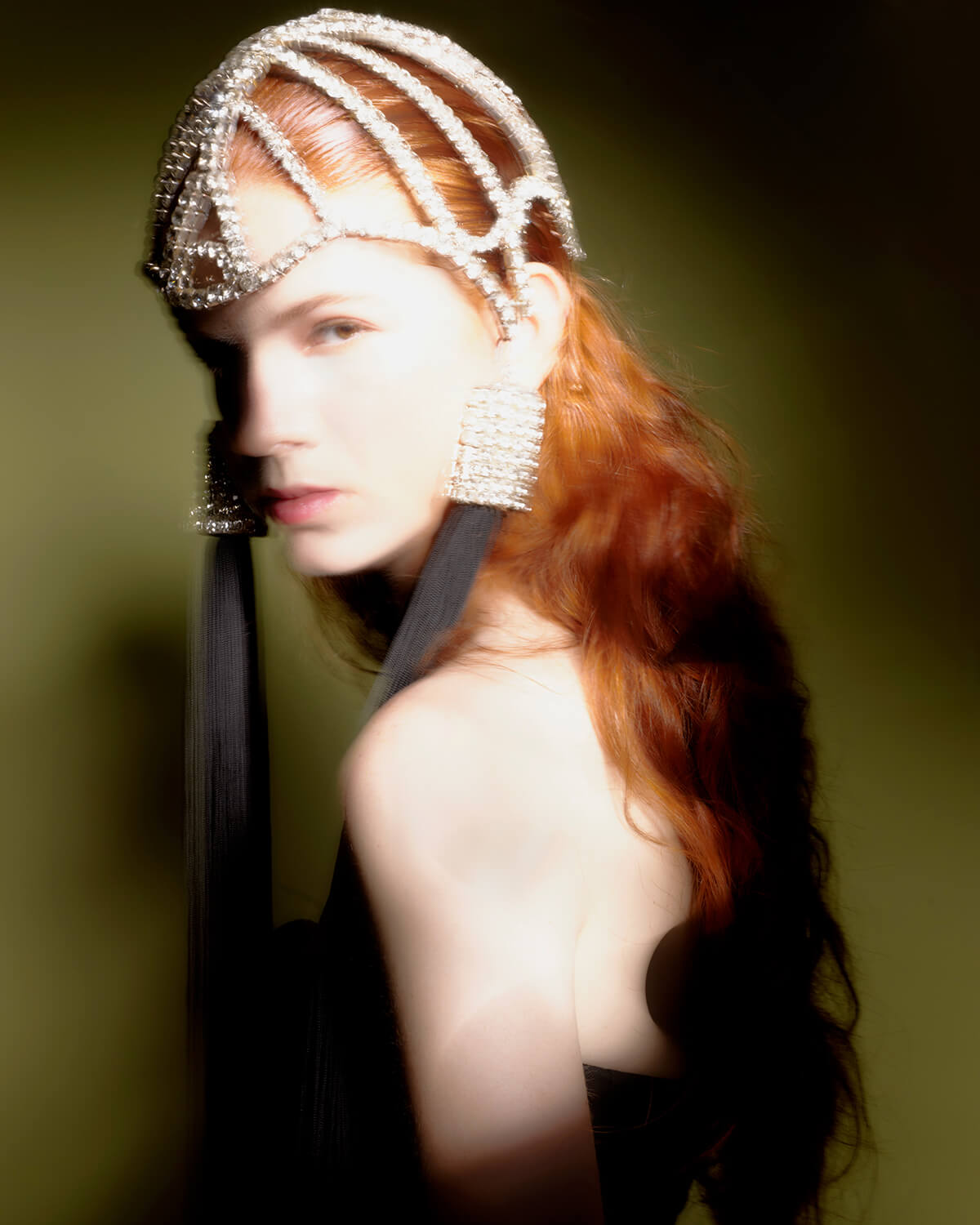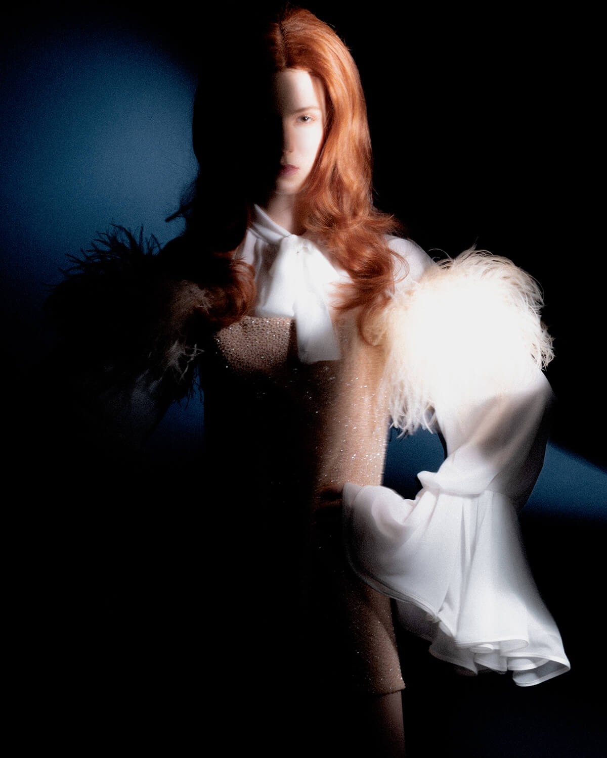 Siempre me ha atraído la noche como espacio de liberación: ese momento en el que las máscaras del día caen y cada uno puede mostrarse con más verdad. El cine noir y el universo de las vedettes representan muy bien ese territorio ambiguo entre el glamour y la vulnerabilidad. Para trasladar esa atmósfera a la colección, recurrí a tejidos que evocan la luz artificial y el resplandor de los escenarios —satén, strass, pedrería— junto a elementos más etéreos como el tul y las plumas, que aportan un halo de fragilidad. Las siluetas buscan ese contraste entre lo insinuante y lo estructurado: corsés que contienen y a la vez revelan, capas de transparencias que sugieren más que muestran. Todo ello construye una narrativa visual que habla de deseo, de poder y de misterio.