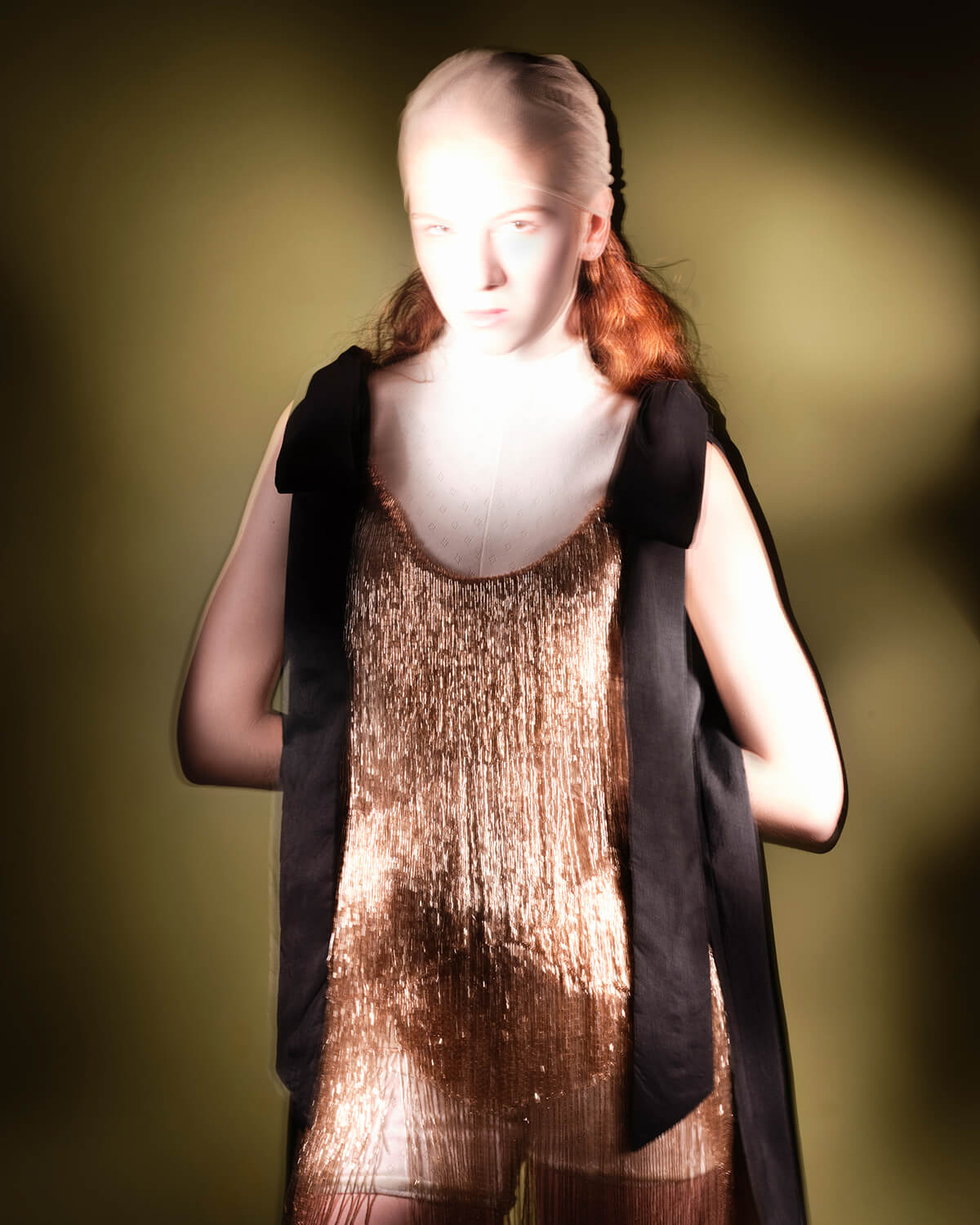 Para entender un poco el trasfondo de la colección, colette fue una novelista y artista de revista y cabaret francesa. Fue una mujer fuerte y luchadora que se hizo a sí misma en contra de una sociedad que no entendía su forma de admirar la importancia de la figura de la mujer en la sociedad. Con Colette quise rescatar la memoria de esas mujeres que, como ella, vivieron a contracorriente de su época. Mujeres que desafiaron las normas sociales, que hicieron de su fragilidad una fortaleza y que defendieron su derecho a brillar incluso cuando el mundo prefería mantenerlas en la sombra. La colección habla de la belleza que se esconde en los márgenes: las artistas de cabaret, las vedettes de los teatros pequeños, las divas de cine noir… todas ellas conforman un universo fascinante que ha sido muchas veces silenciado o reducido a estereotipos. Con esta colección quise darles voz desde la moda, traduciéndolas en prendas que celebran su valentía y su misterio.