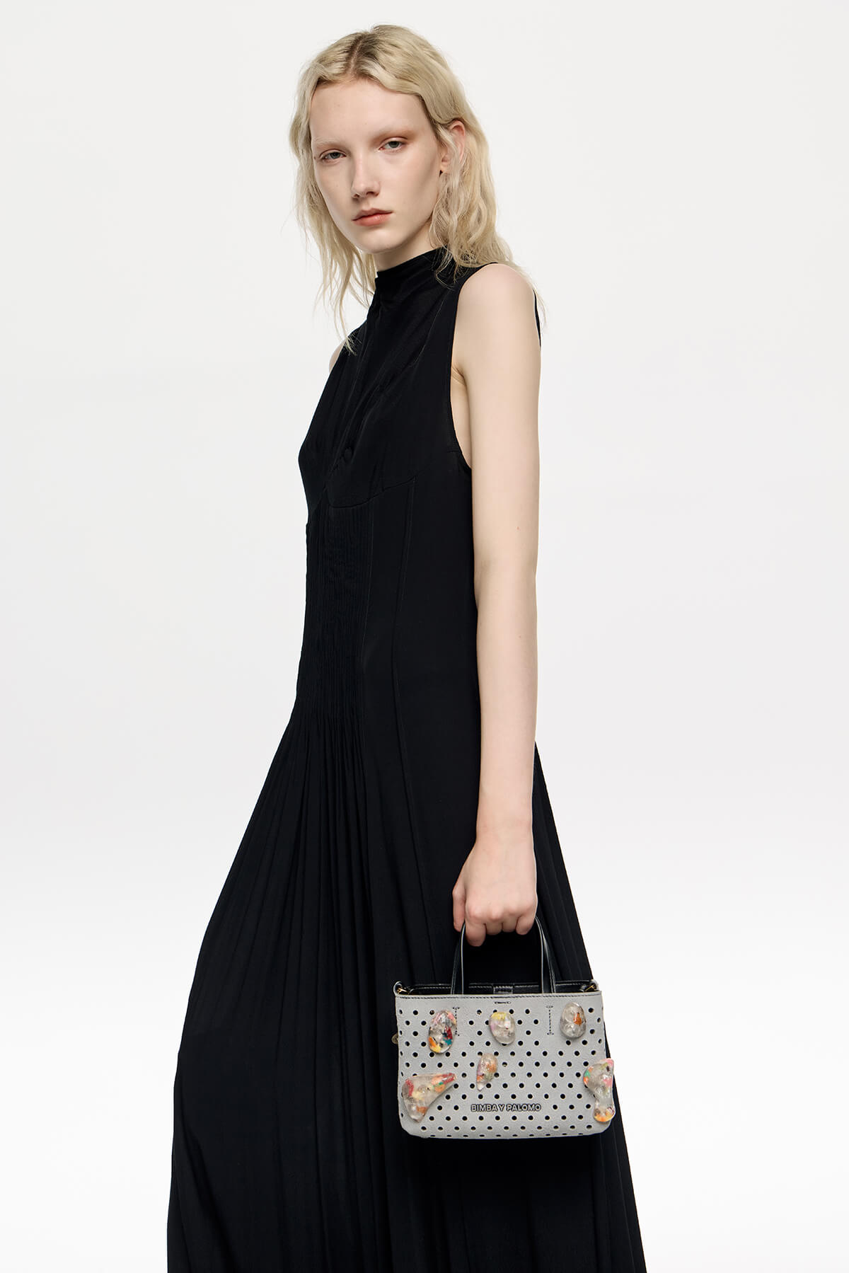 Among the most distinctive pieces is a paraffin blouse that balances opacity and lightness, seeming to hover between structure and air. A leather coat reinforced with quilted padding grows from the reconstruction of an earlier dress, showing how form can be reimagined through reuse. A tuxedo jacket is carefully taken apart to reveal linings and seams usually hidden from sight, while a bomber jacket becomes a sculptural silhouette expanded with synthetic fur and feathers. A braided leather shawl adorned with resin and metal charms echoes the familiar vocabulary of the Bimba y Lola universe, turning recognisable elements into something newly hypnotic.
