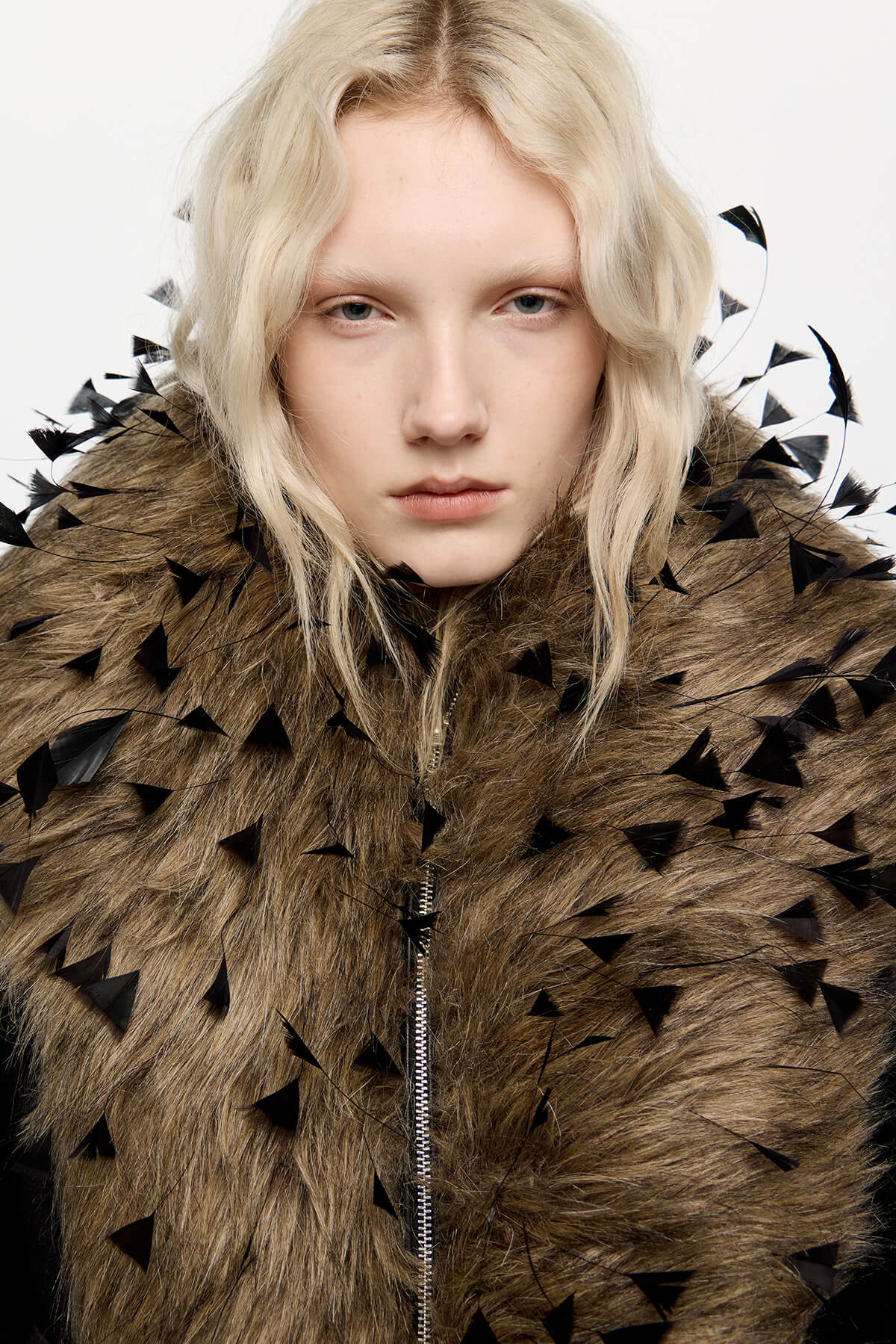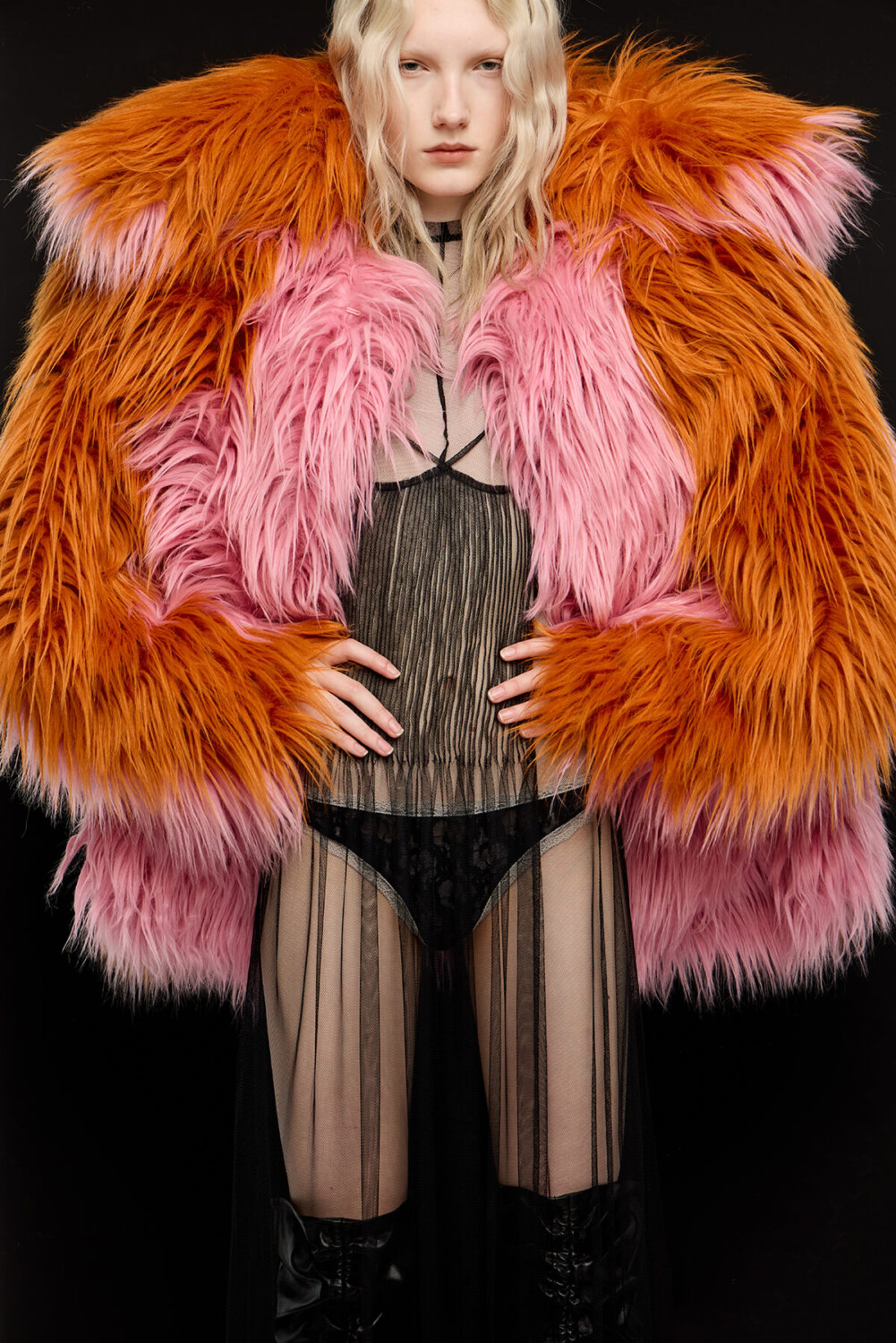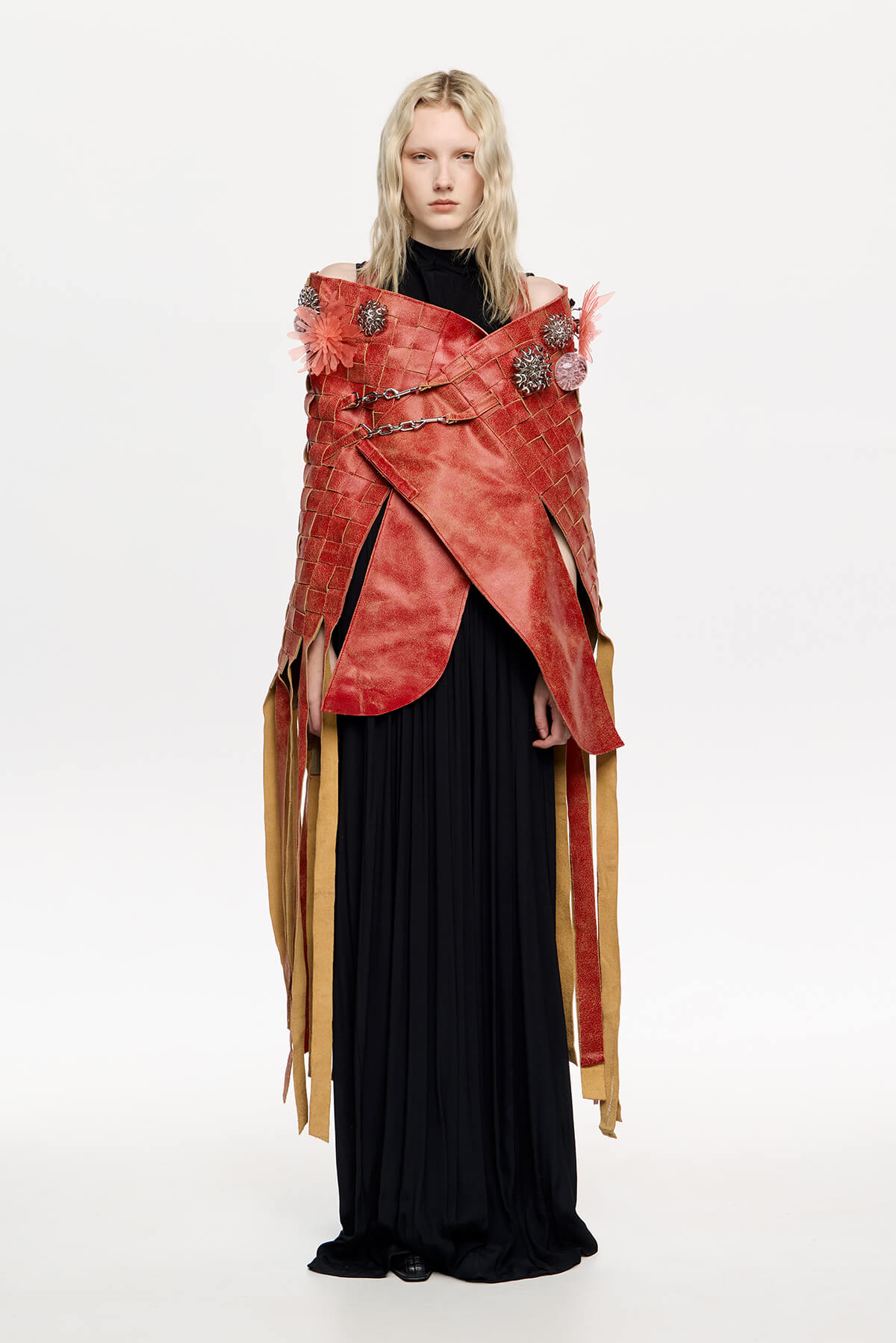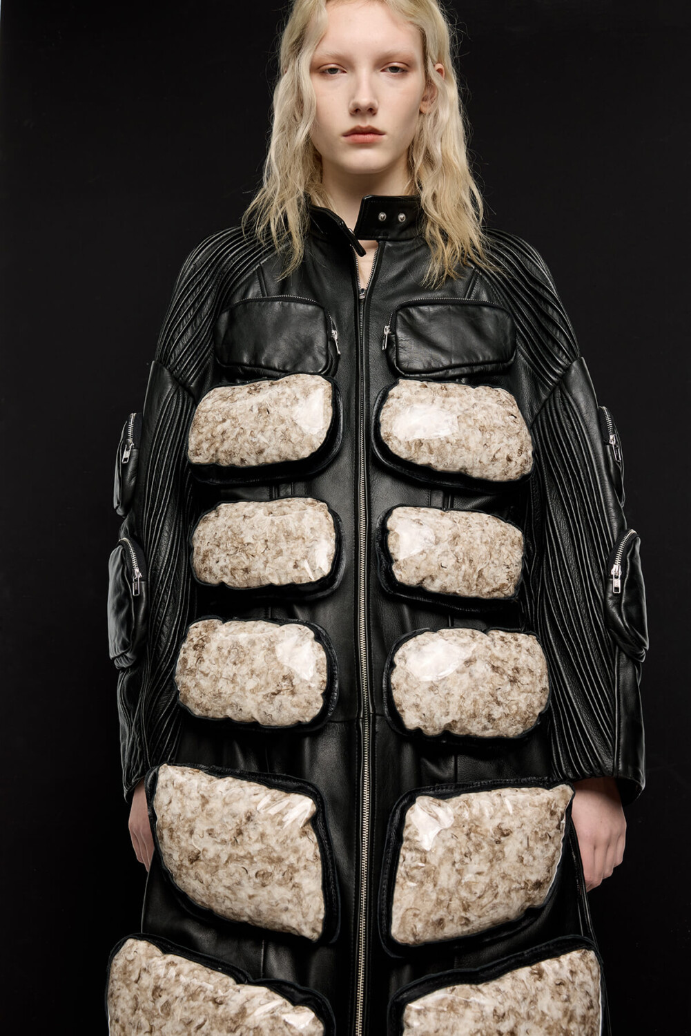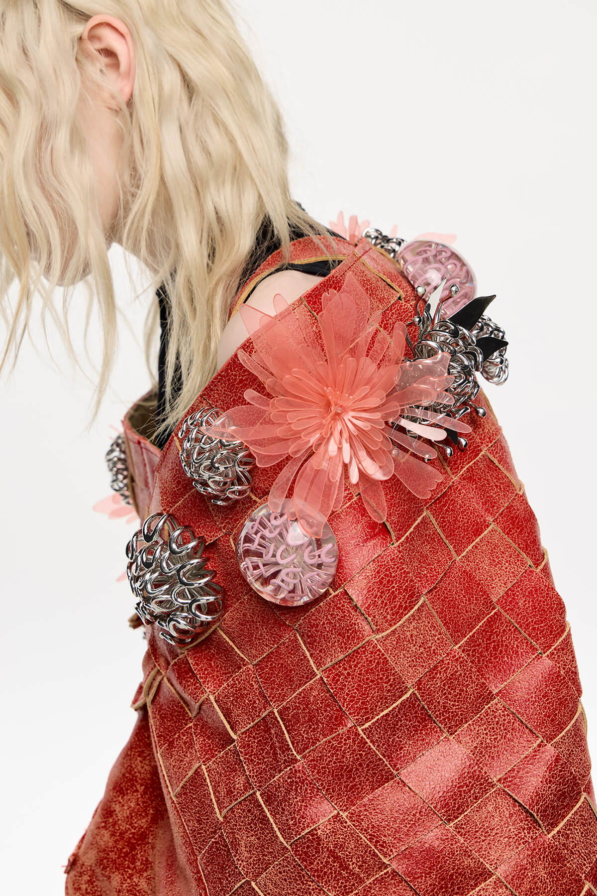 Among the most distinctive pieces is a paraffin blouse that balances opacity and lightness, seeming to hover between structure and air. A leather coat reinforced with quilted padding grows from the reconstruction of an earlier dress, showing how form can be reimagined through reuse. A tuxedo jacket is carefully taken apart to reveal linings and seams usually hidden from sight, while a bomber jacket becomes a sculptural silhouette expanded with synthetic fur and feathers. A braided leather shawl adorned with resin and metal charms echoes the familiar vocabulary of the Bimba y Lola universe, turning recognisable elements into something newly hypnotic.