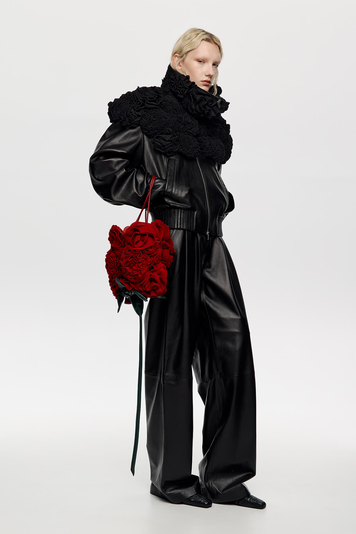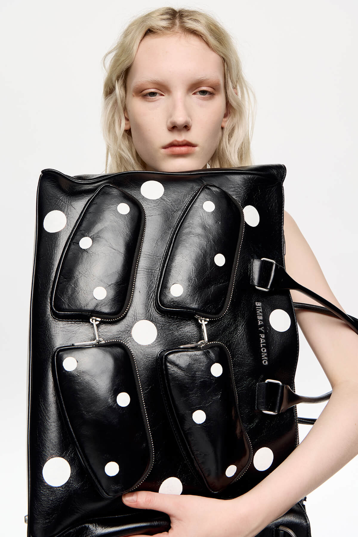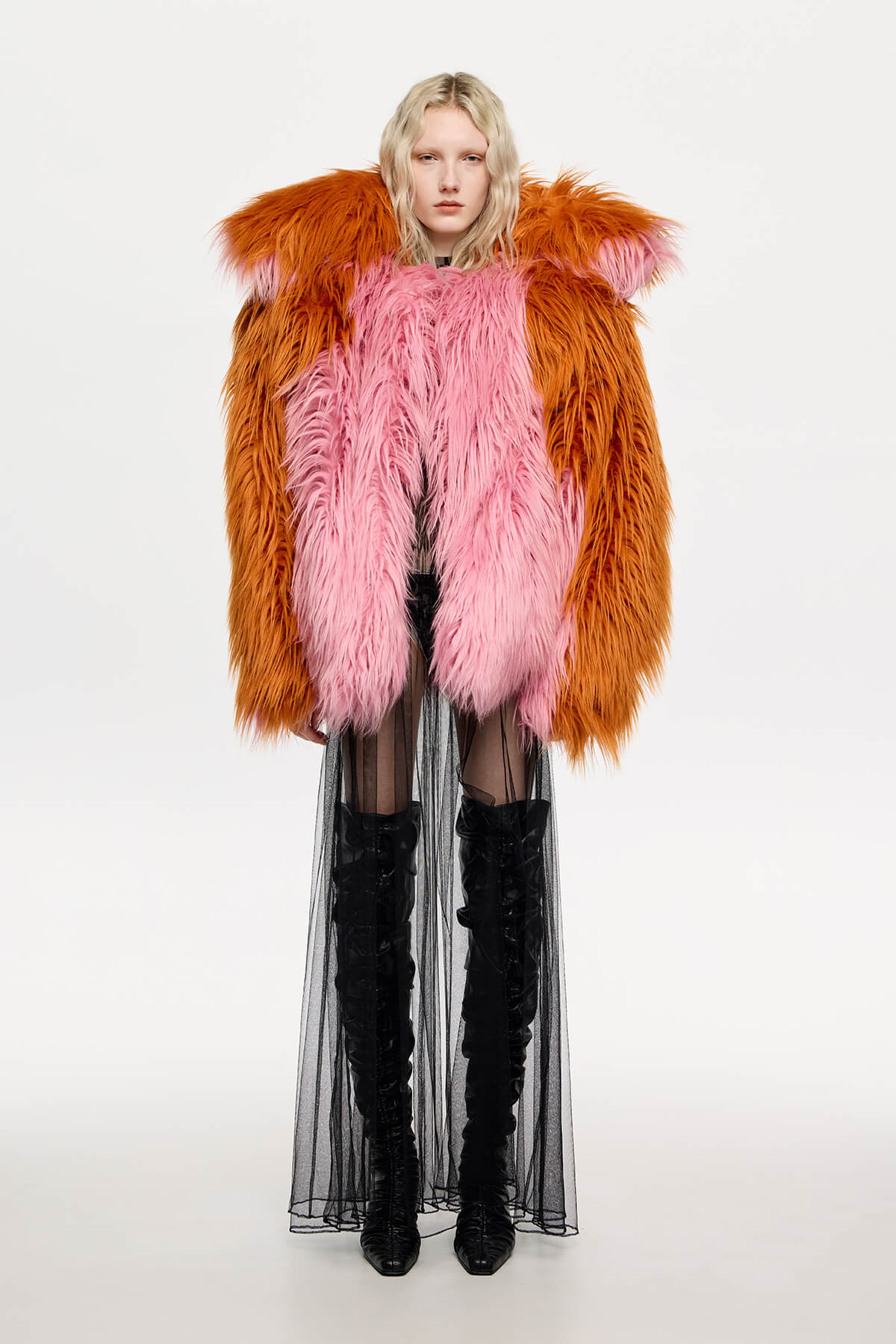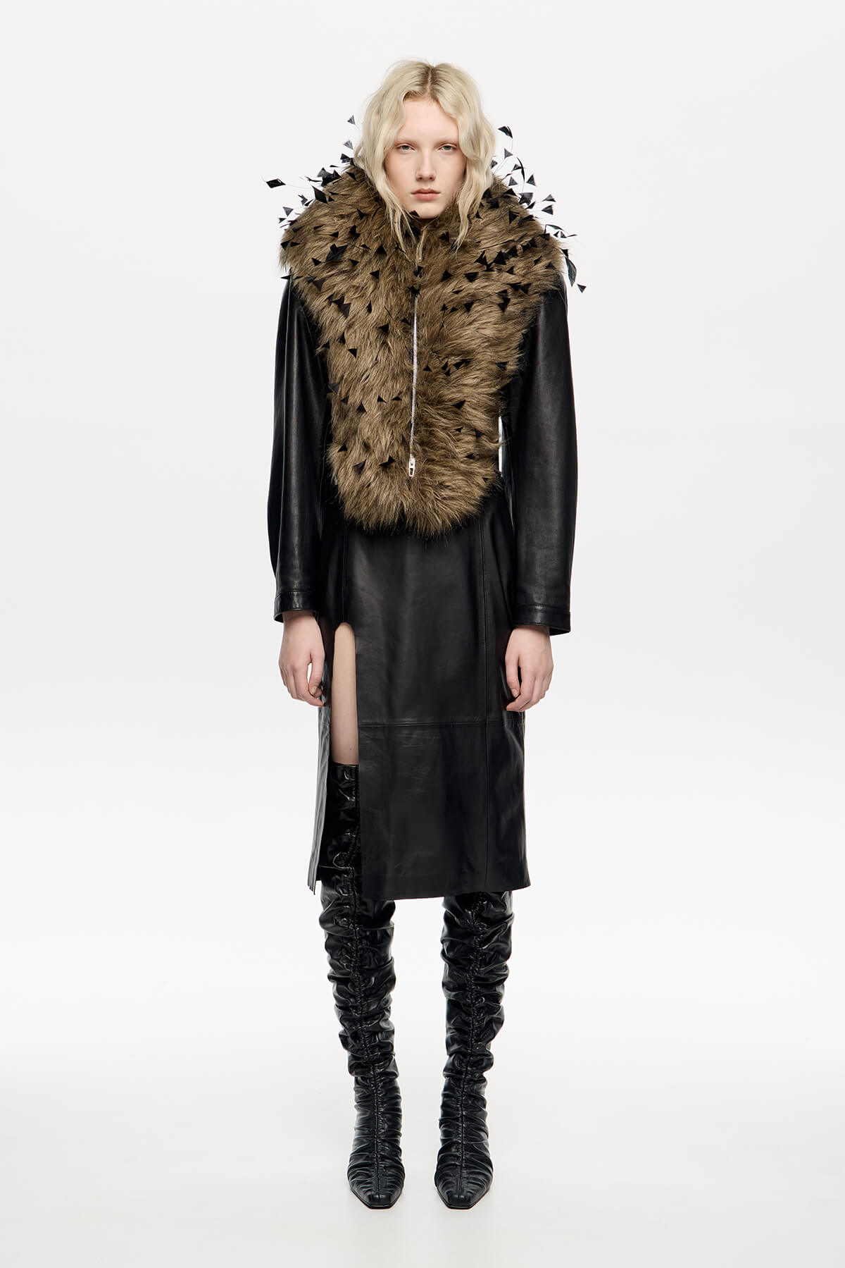 Among the most distinctive pieces is a paraffin blouse that balances opacity and lightness, seeming to hover between structure and air. A leather coat reinforced with quilted padding grows from the reconstruction of an earlier dress, showing how form can be reimagined through reuse. A tuxedo jacket is carefully taken apart to reveal linings and seams usually hidden from sight, while a bomber jacket becomes a sculptural silhouette expanded with synthetic fur and feathers. A braided leather shawl adorned with resin and metal charms echoes the familiar vocabulary of the Bimba y Lola universe, turning recognisable elements into something newly hypnotic.