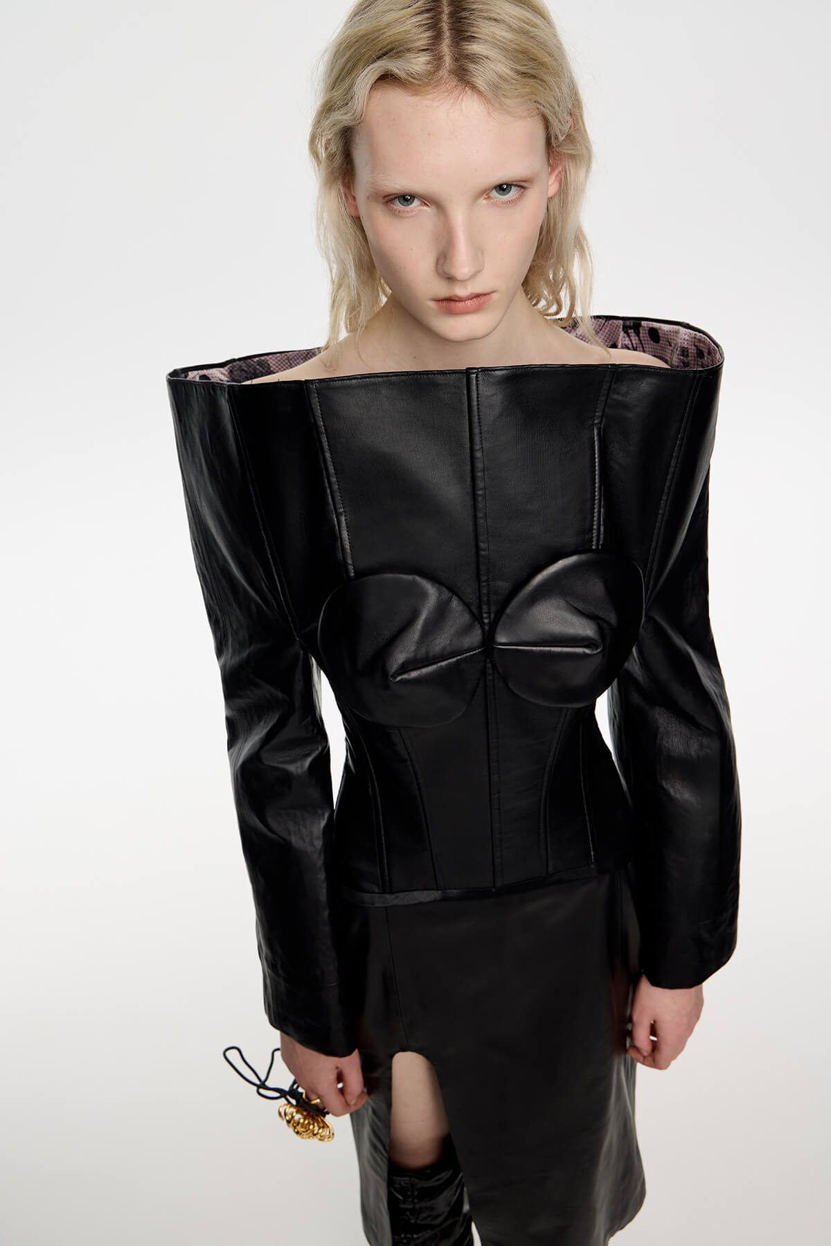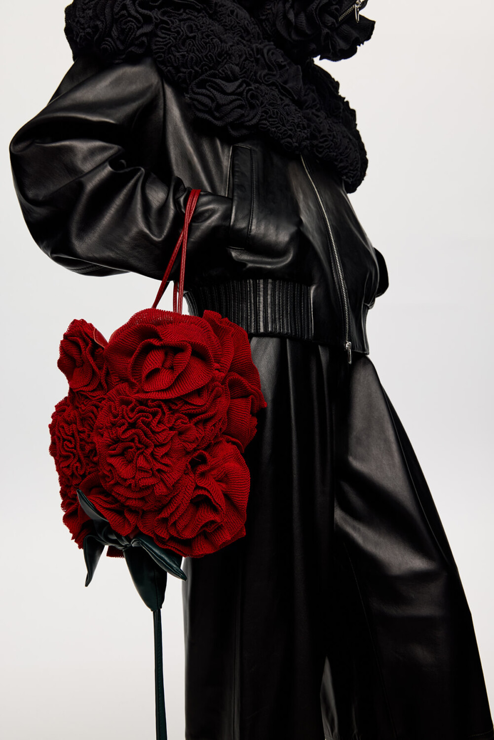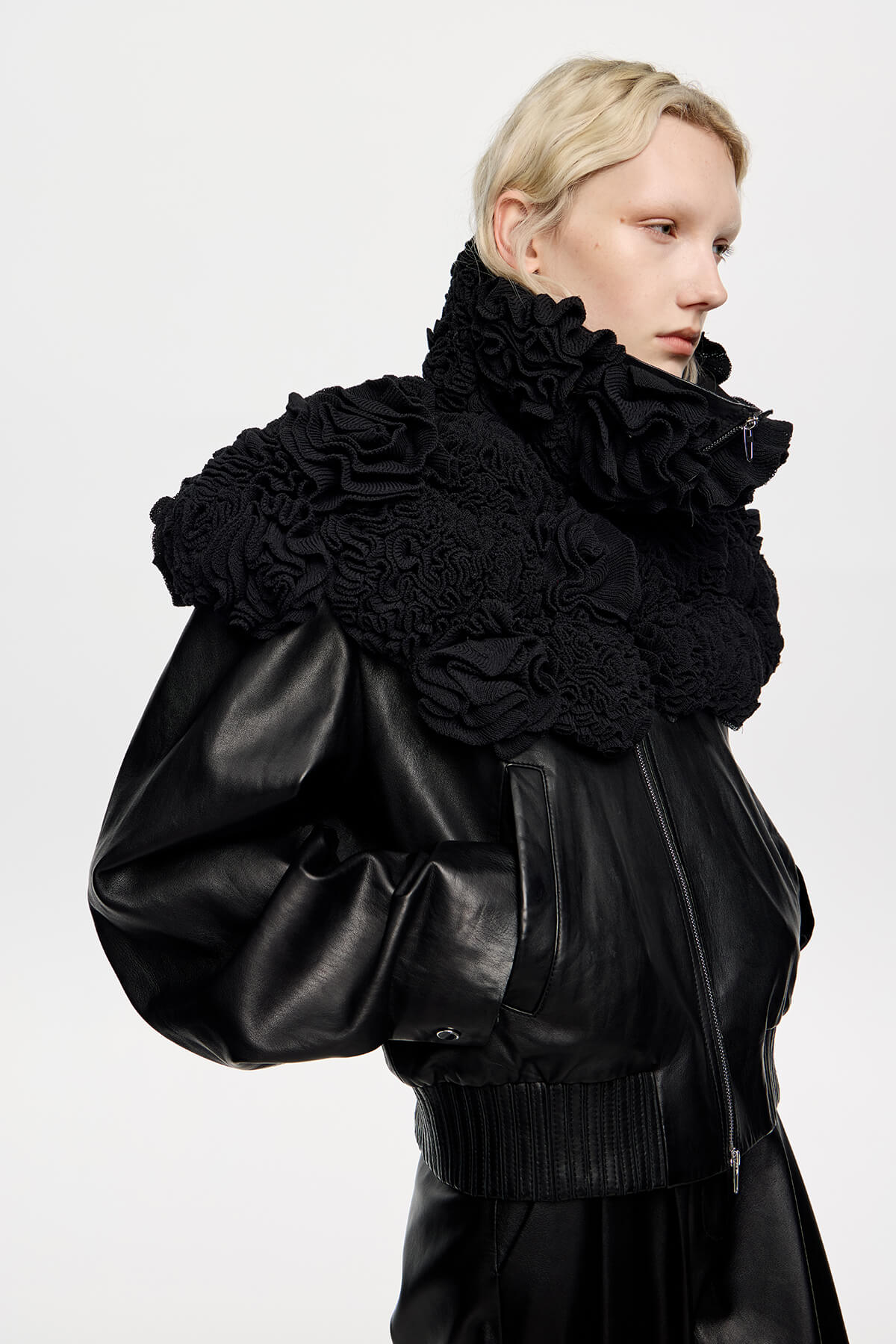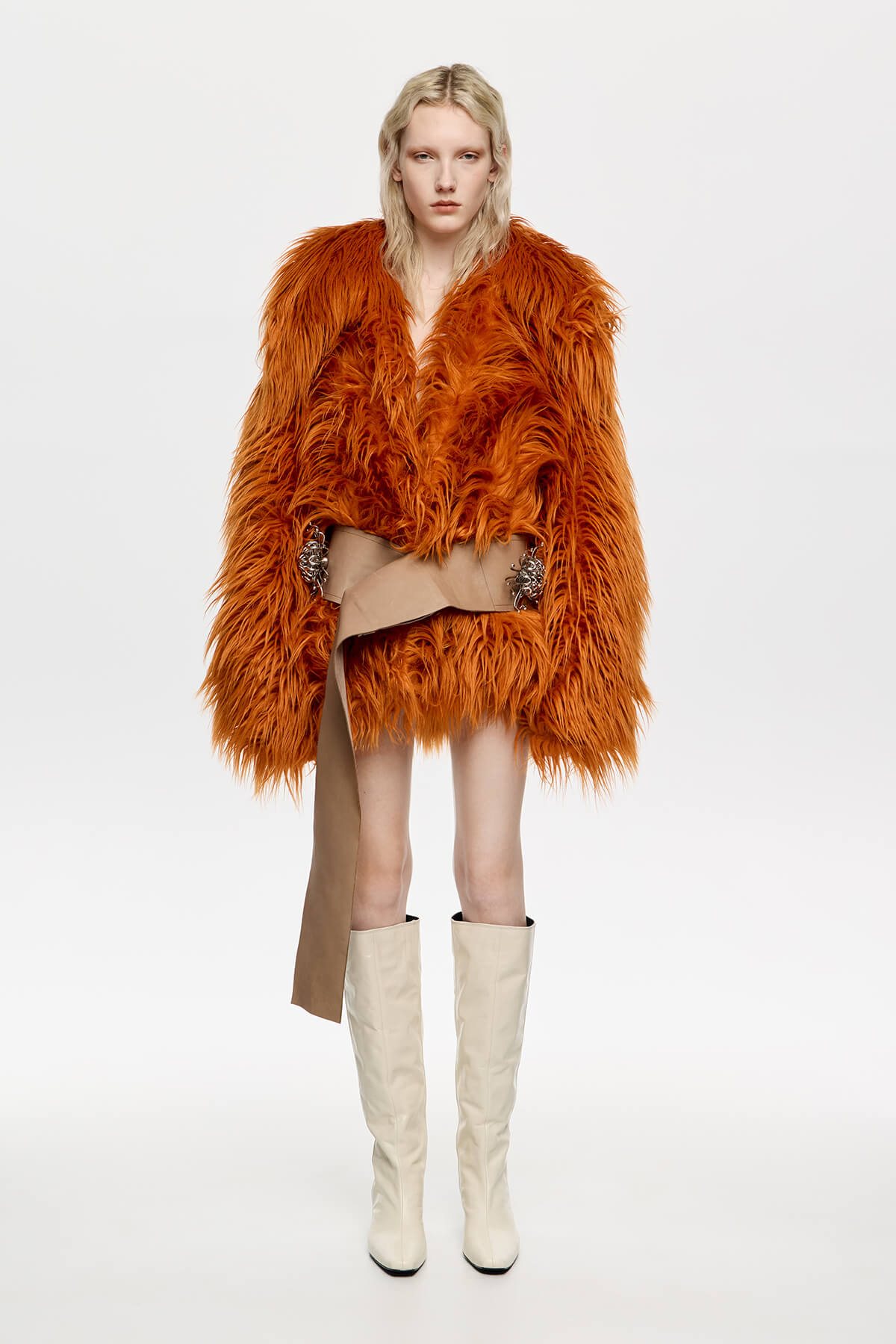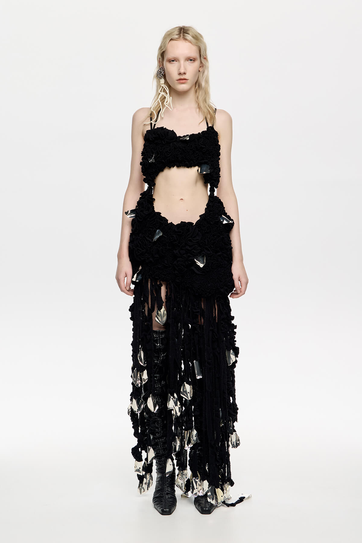 Among the most distinctive pieces is a paraffin blouse that balances opacity and lightness, seeming to hover between structure and air. A leather coat reinforced with quilted padding grows from the reconstruction of an earlier dress, showing how form can be reimagined through reuse. A tuxedo jacket is carefully taken apart to reveal linings and seams usually hidden from sight, while a bomber jacket becomes a sculptural silhouette expanded with synthetic fur and feathers. A braided leather shawl adorned with resin and metal charms echoes the familiar vocabulary of the Bimba y Lola universe, turning recognisable elements into something newly hypnotic.