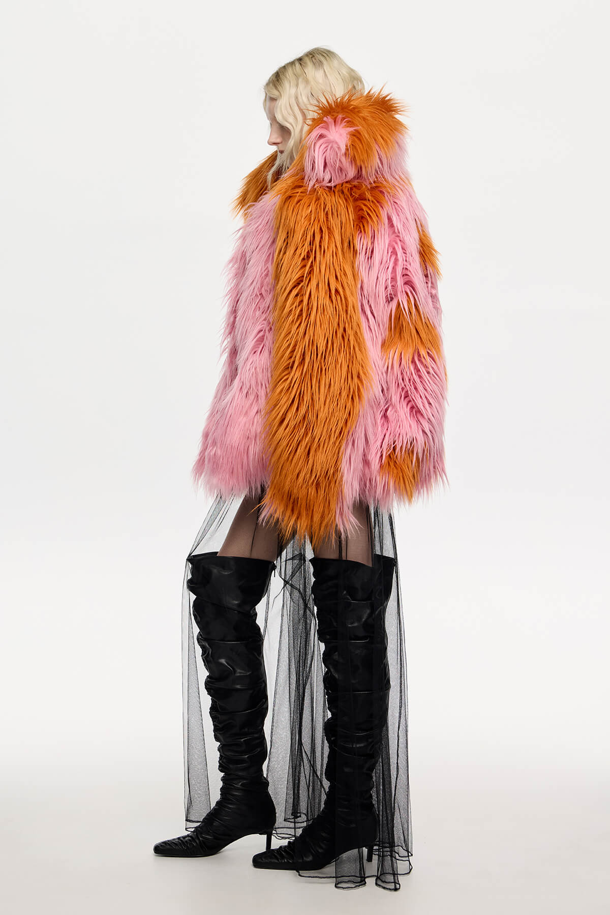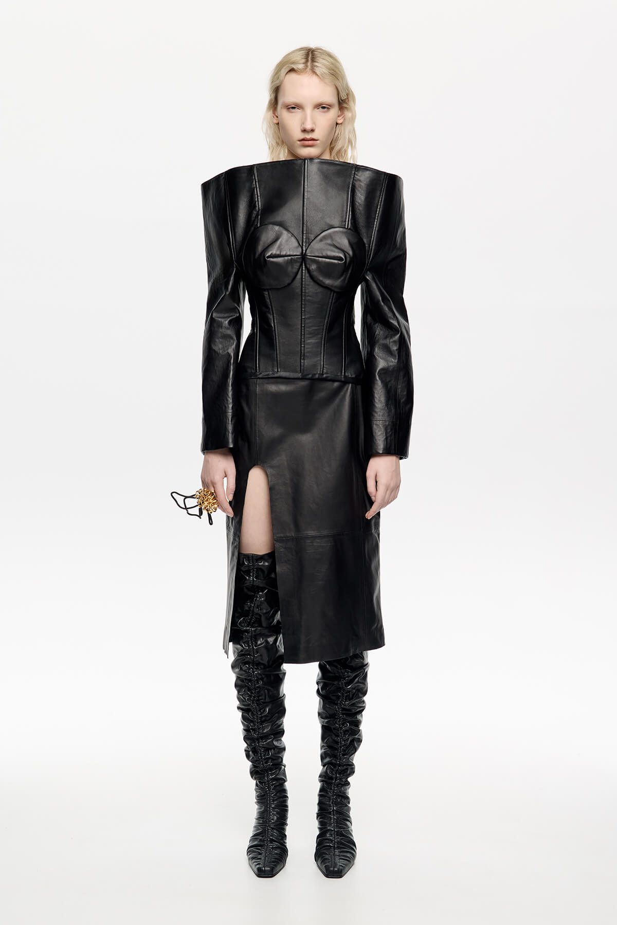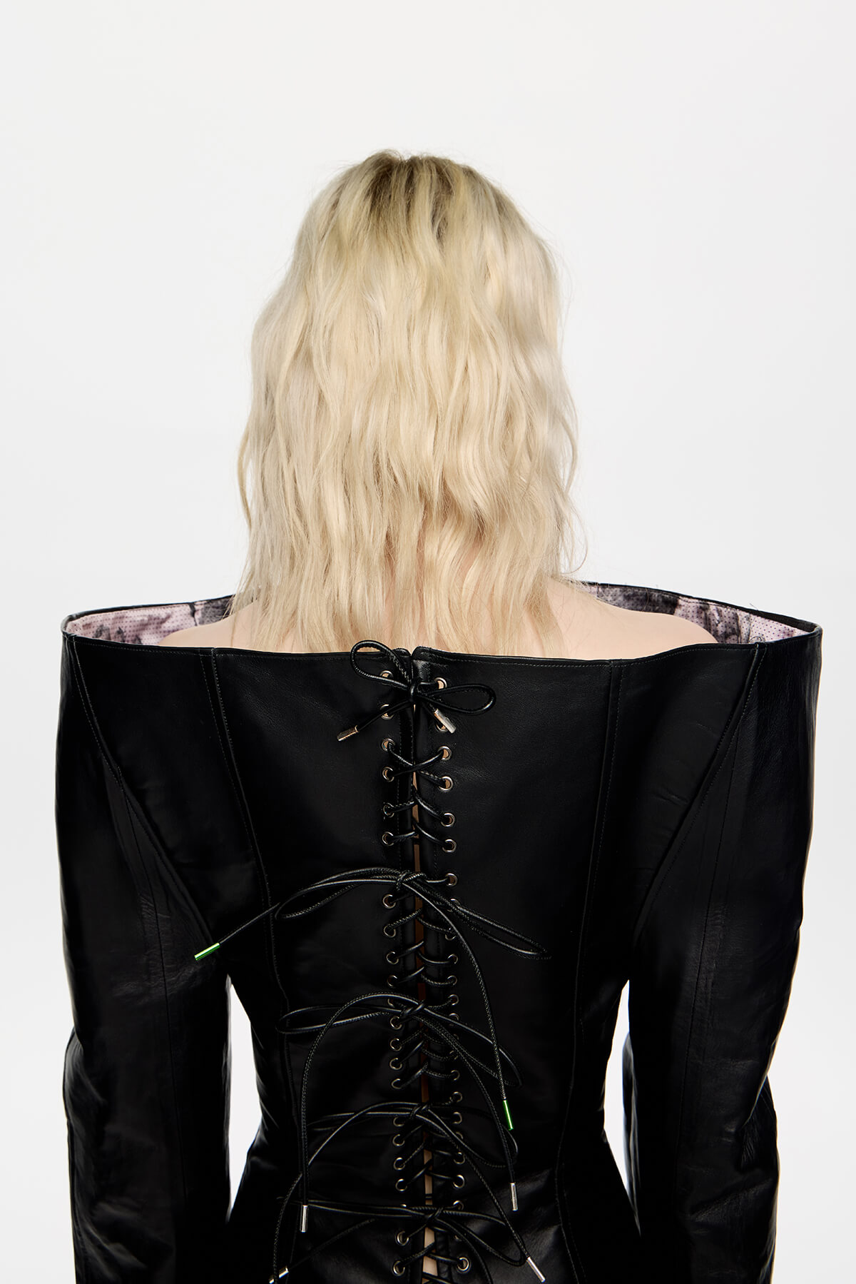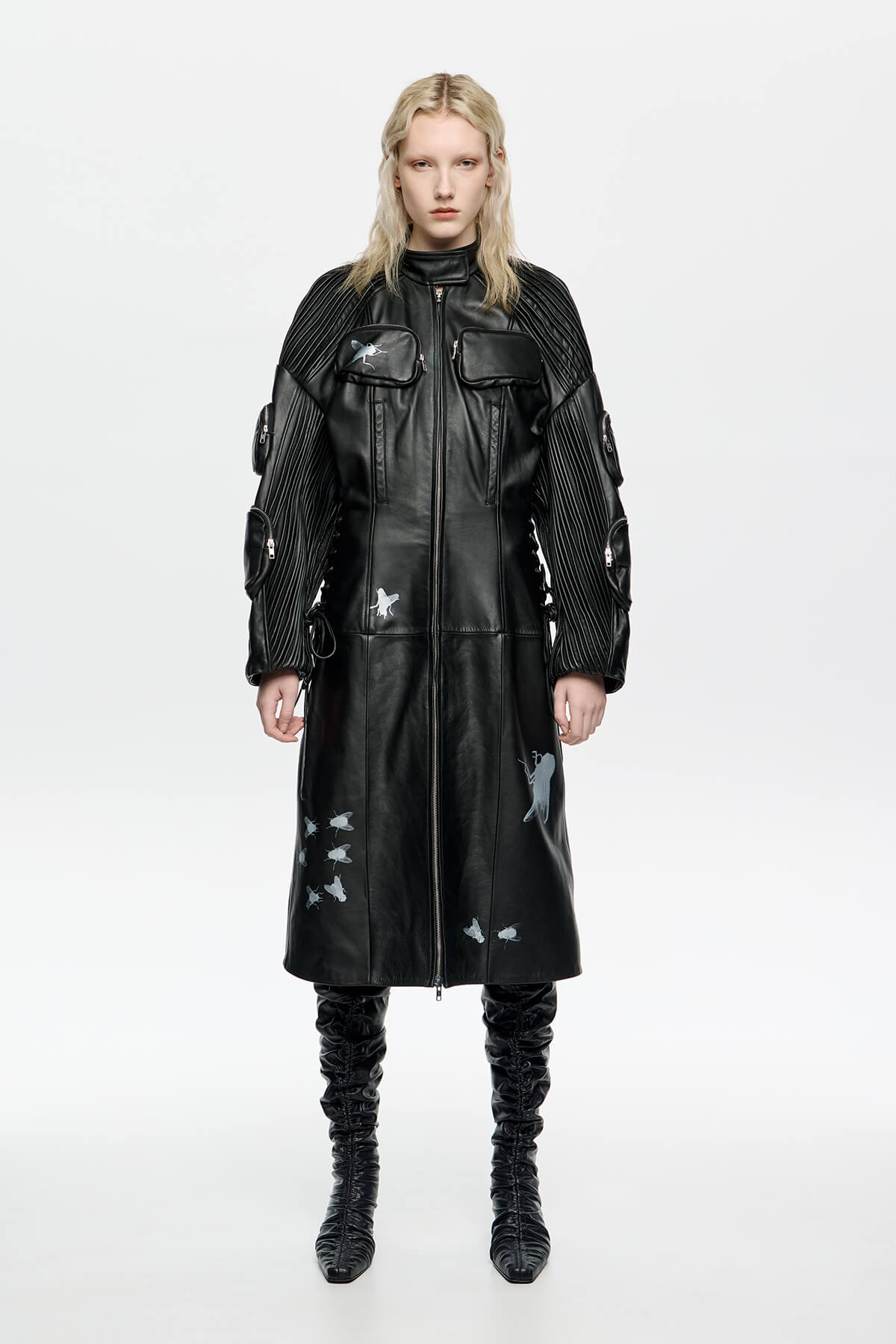 Among the most distinctive pieces is a paraffin blouse that balances opacity and lightness, seeming to hover between structure and air. A leather coat reinforced with quilted padding grows from the reconstruction of an earlier dress, showing how form can be reimagined through reuse. A tuxedo jacket is carefully taken apart to reveal linings and seams usually hidden from sight, while a bomber jacket becomes a sculptural silhouette expanded with synthetic fur and feathers. A braided leather shawl adorned with resin and metal charms echoes the familiar vocabulary of the Bimba y Lola universe, turning recognisable elements into something newly hypnotic.