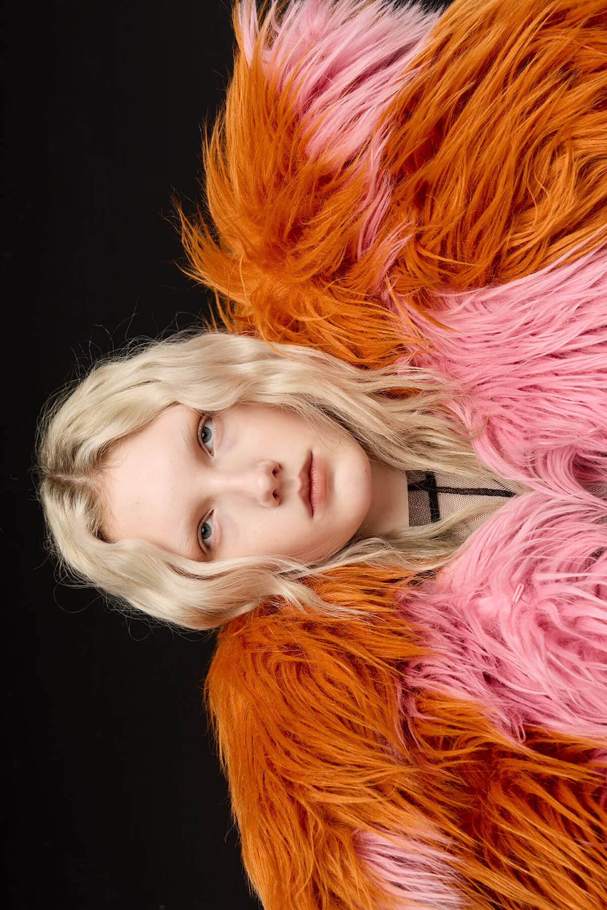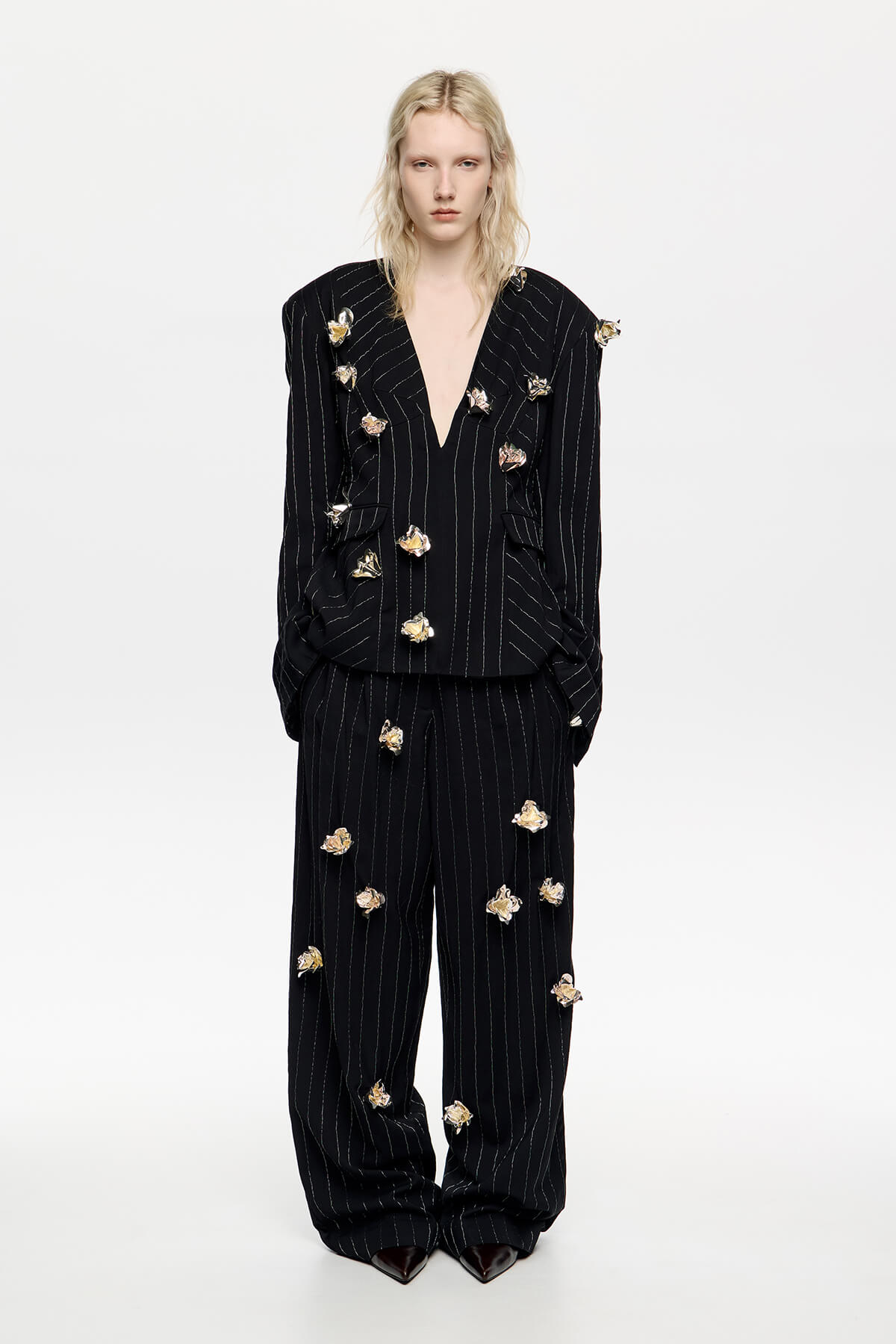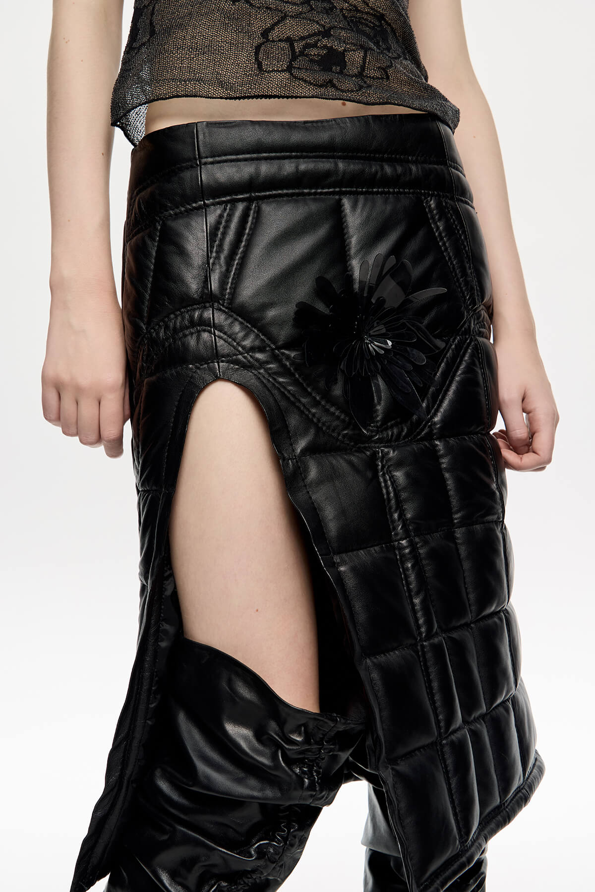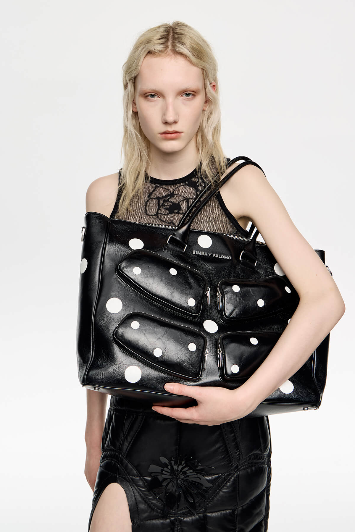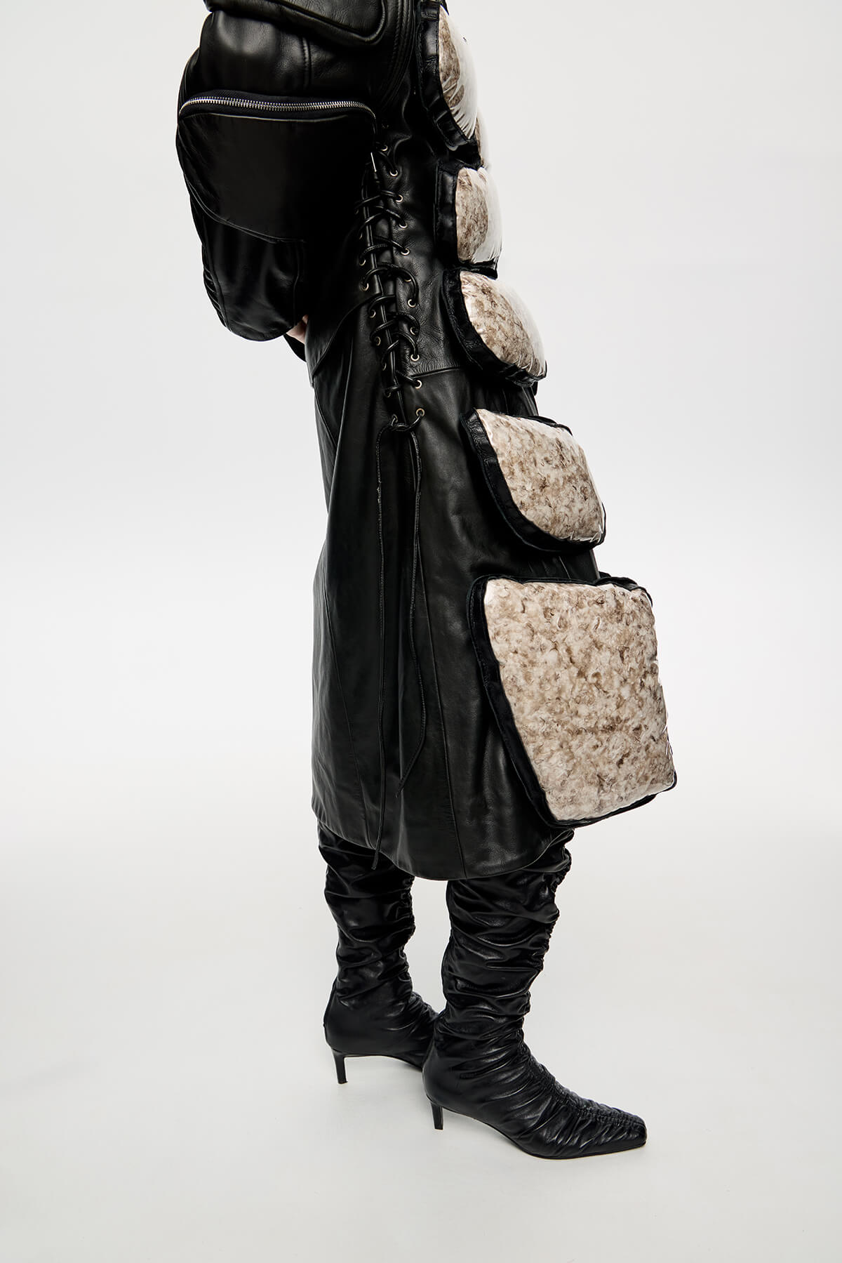 Among the most distinctive pieces is a paraffin blouse that balances opacity and lightness, seeming to hover between structure and air. A leather coat reinforced with quilted padding grows from the reconstruction of an earlier dress, showing how form can be reimagined through reuse. A tuxedo jacket is carefully taken apart to reveal linings and seams usually hidden from sight, while a bomber jacket becomes a sculptural silhouette expanded with synthetic fur and feathers. A braided leather shawl adorned with resin and metal charms echoes the familiar vocabulary of the Bimba y Lola universe, turning recognisable elements into something newly hypnotic.