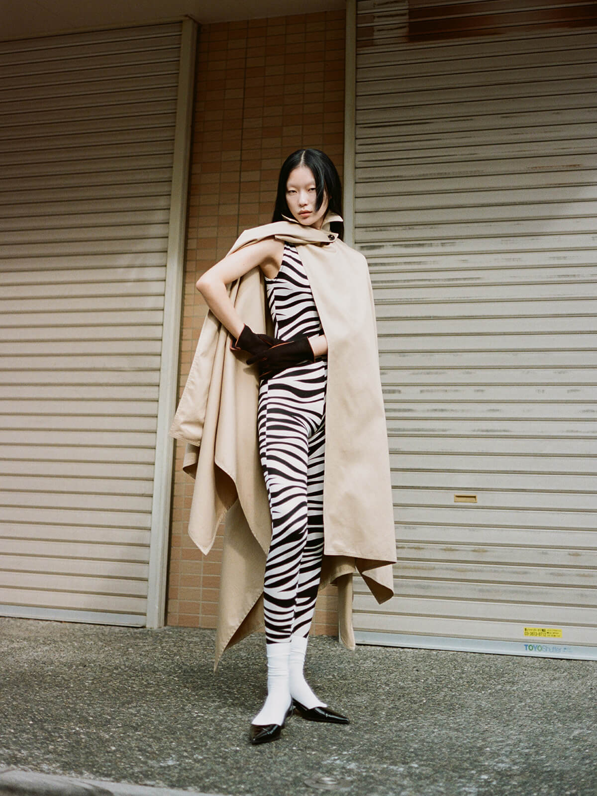 cape GIVENCHY, bodysuit VINTAGE ARCHIVE, gloves BOTTEGA VENETA, shoes PRADA
