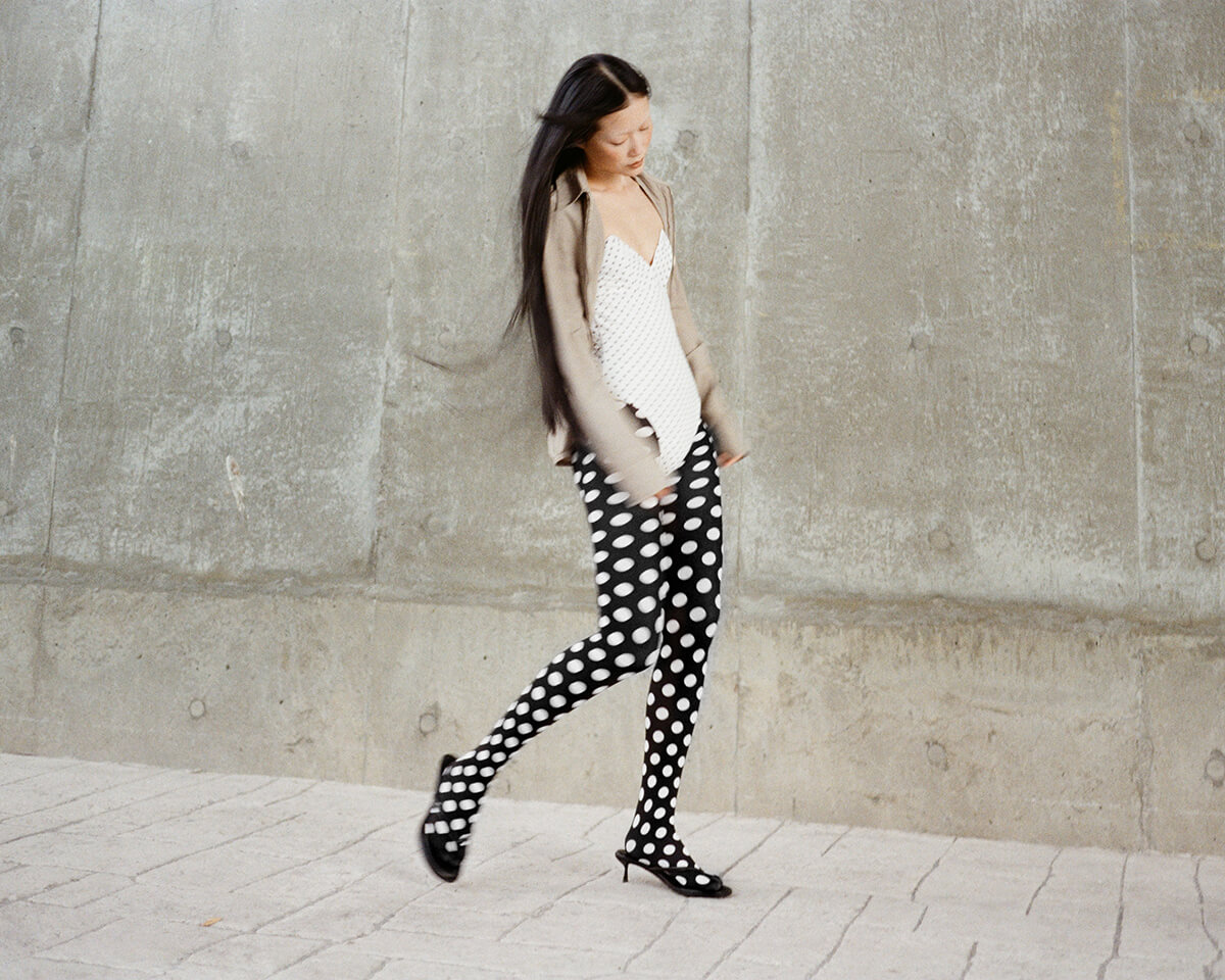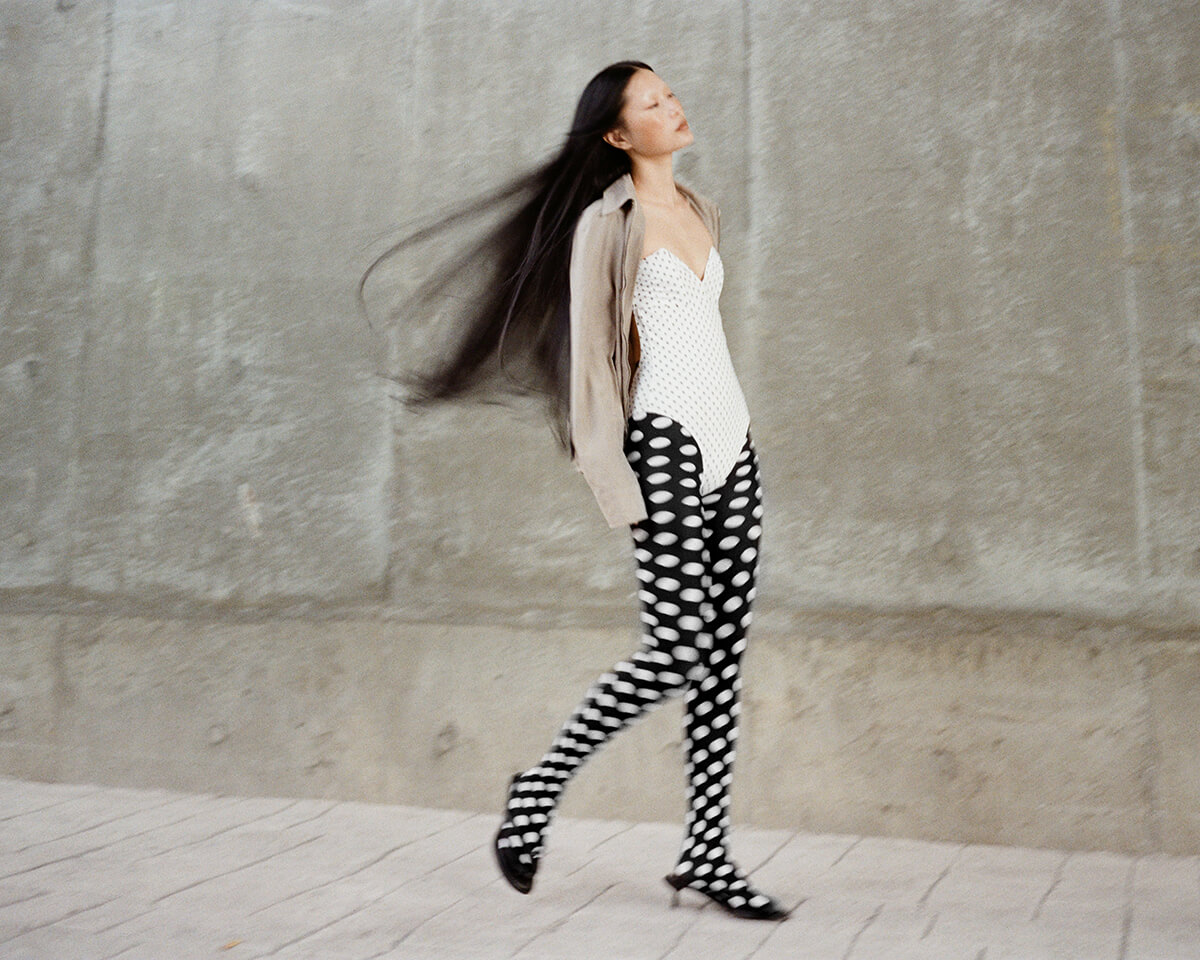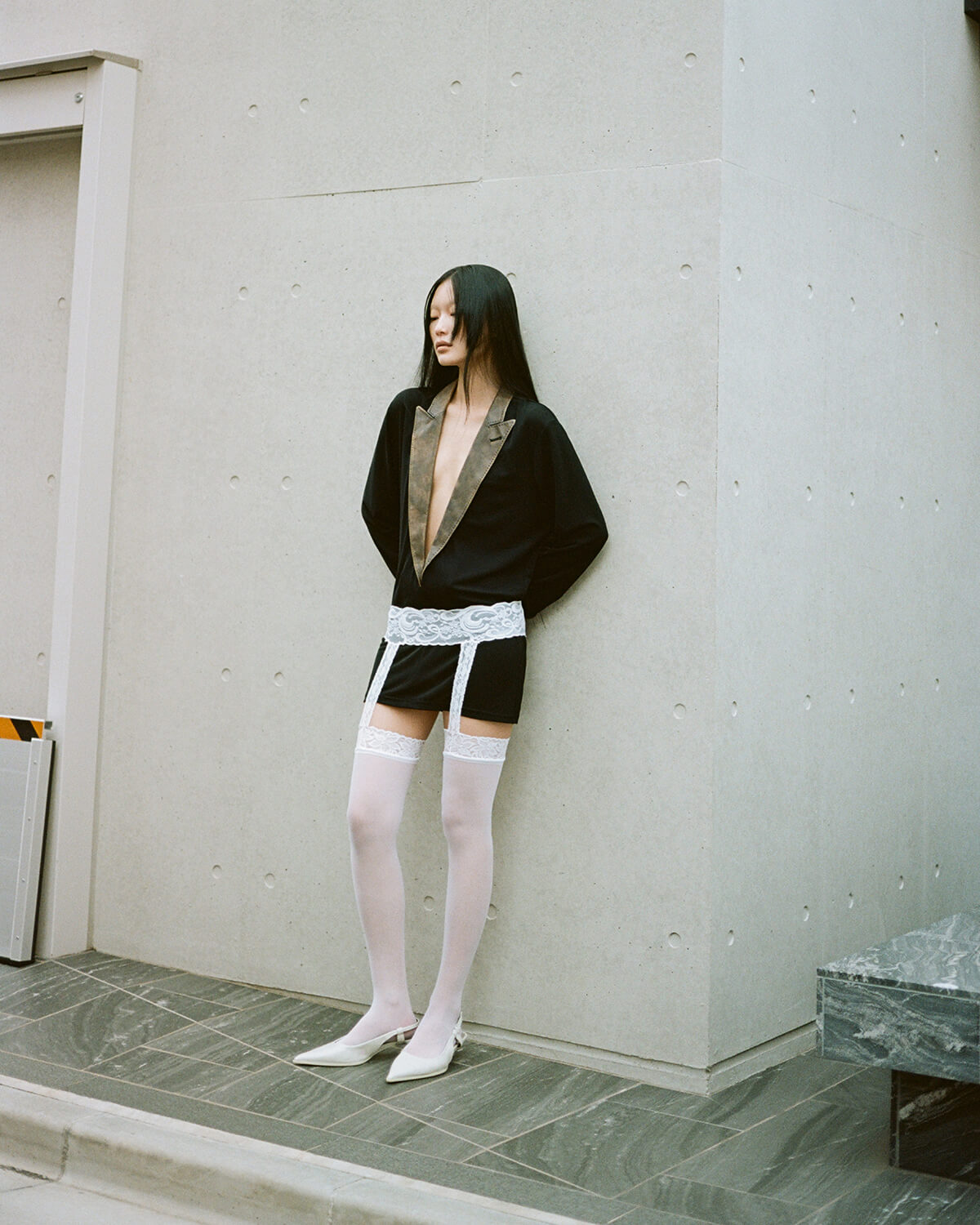 jacket BOTTEGA VENETA, bodysuit VINTAGE ARCHIVE, tights EMILIO CAVALLINI, shoes PRADA