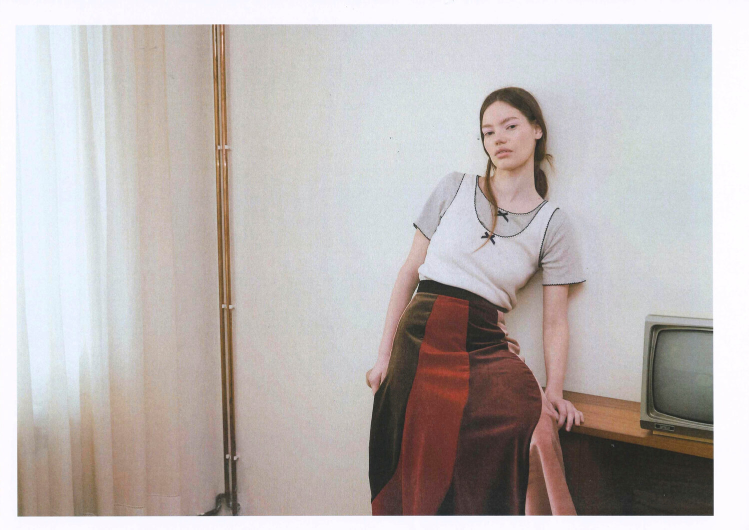 Nina wears t-shirts YERSE, skirt LA VESTE
