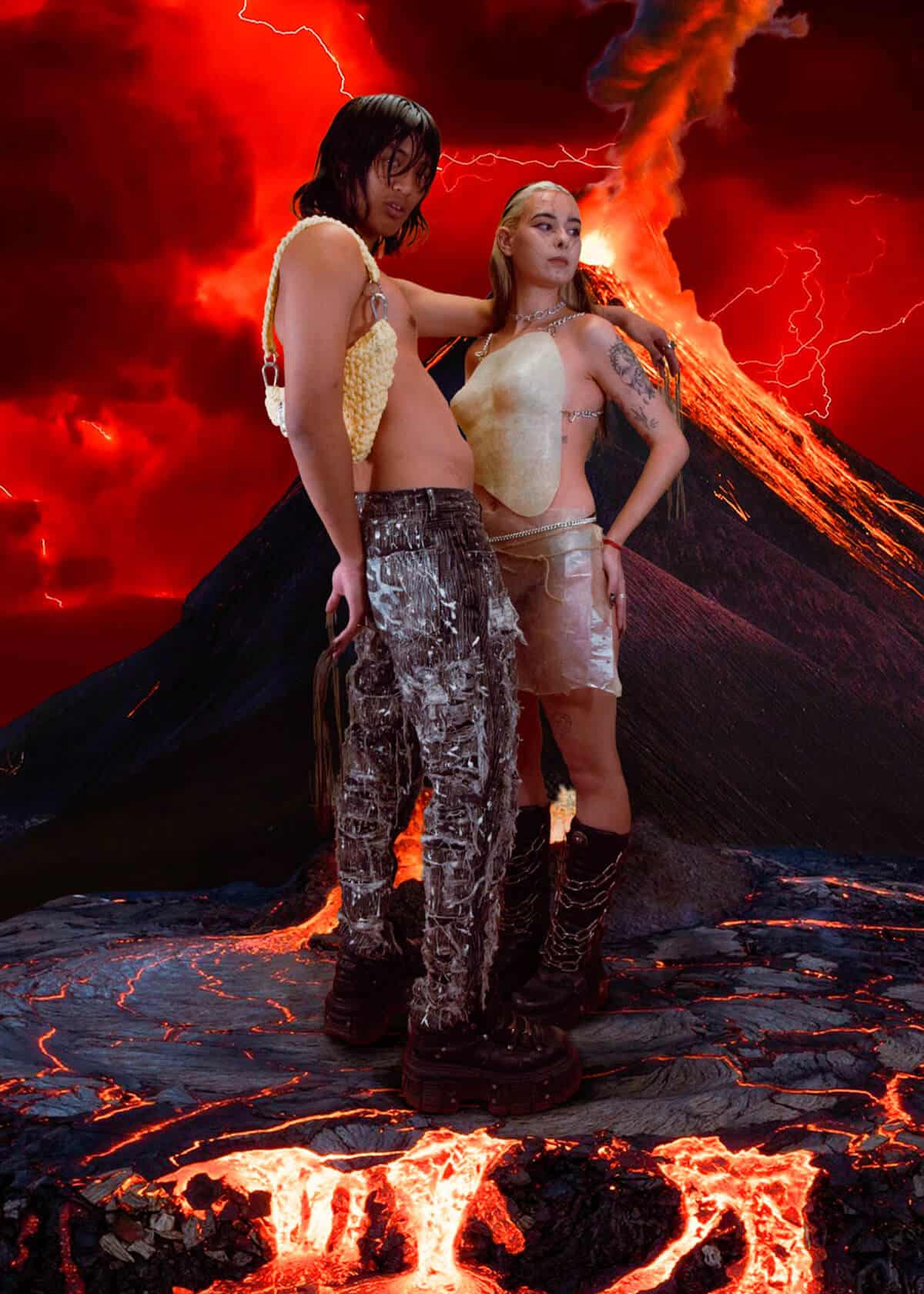 Sonia lleva top de resina de LEHNSER, falda de kombucha de CLOTHES MOTH y botas NEW ROCK. Aaron lleva pantalón FABRIEL ALCAIDE, colgante ELCORASTUDIO, bolso SCUER y botas NEW ROCK.