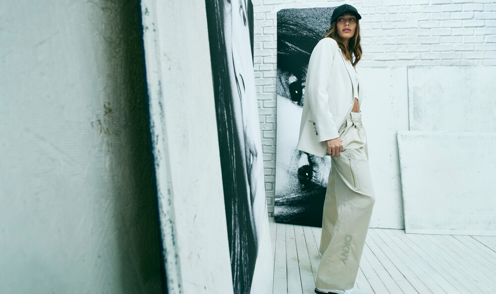 The palette stays disciplined: black, white, beige, denim. Eyewear is strong, bags are sharp, silhouettes are stripped back to their essentials. It’s utility with a pulse — a nod to Donna Karan’s original mission to dress the woman who never knew where the day would take her. Only now, that woman might be leaving a gallery opening, heading to a casting, or live-streaming her own mythology.