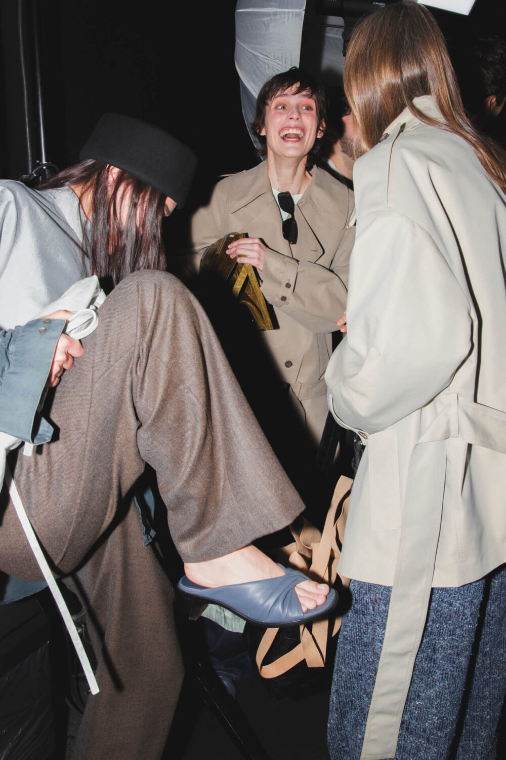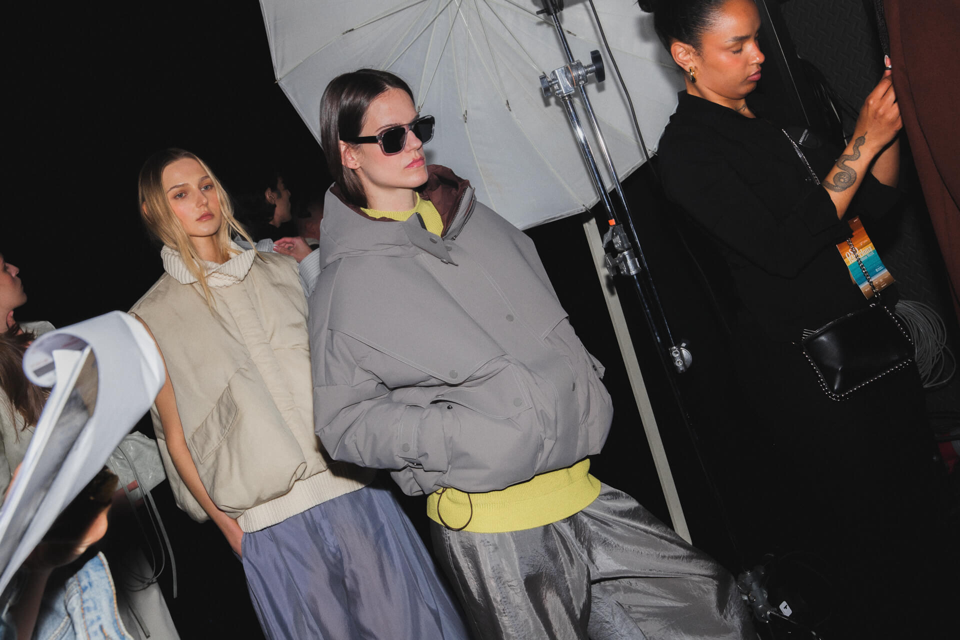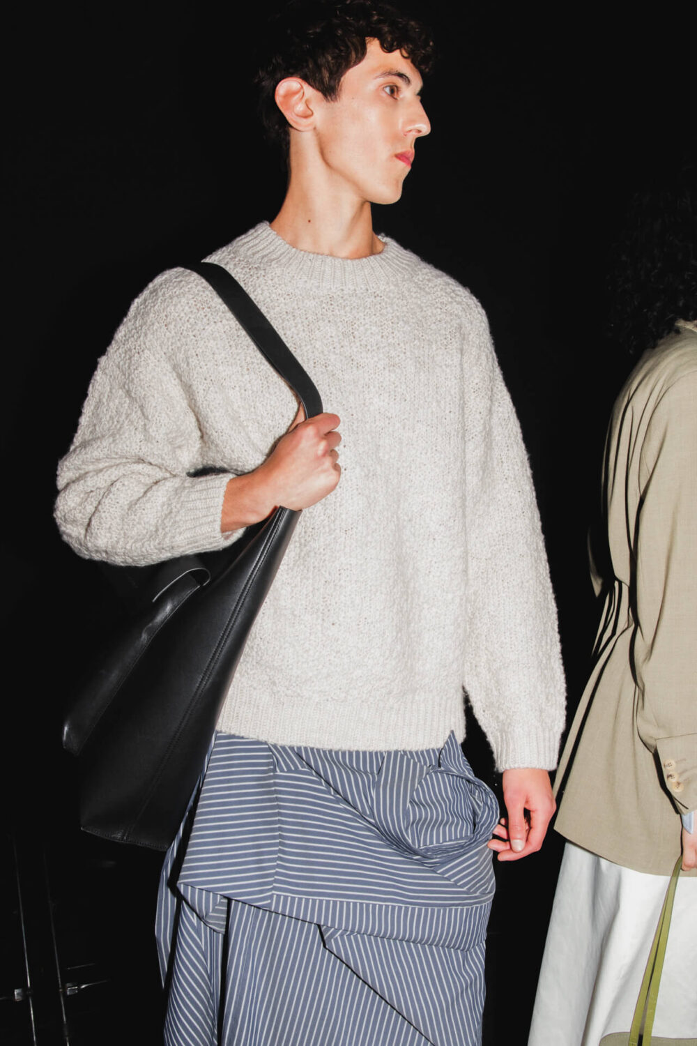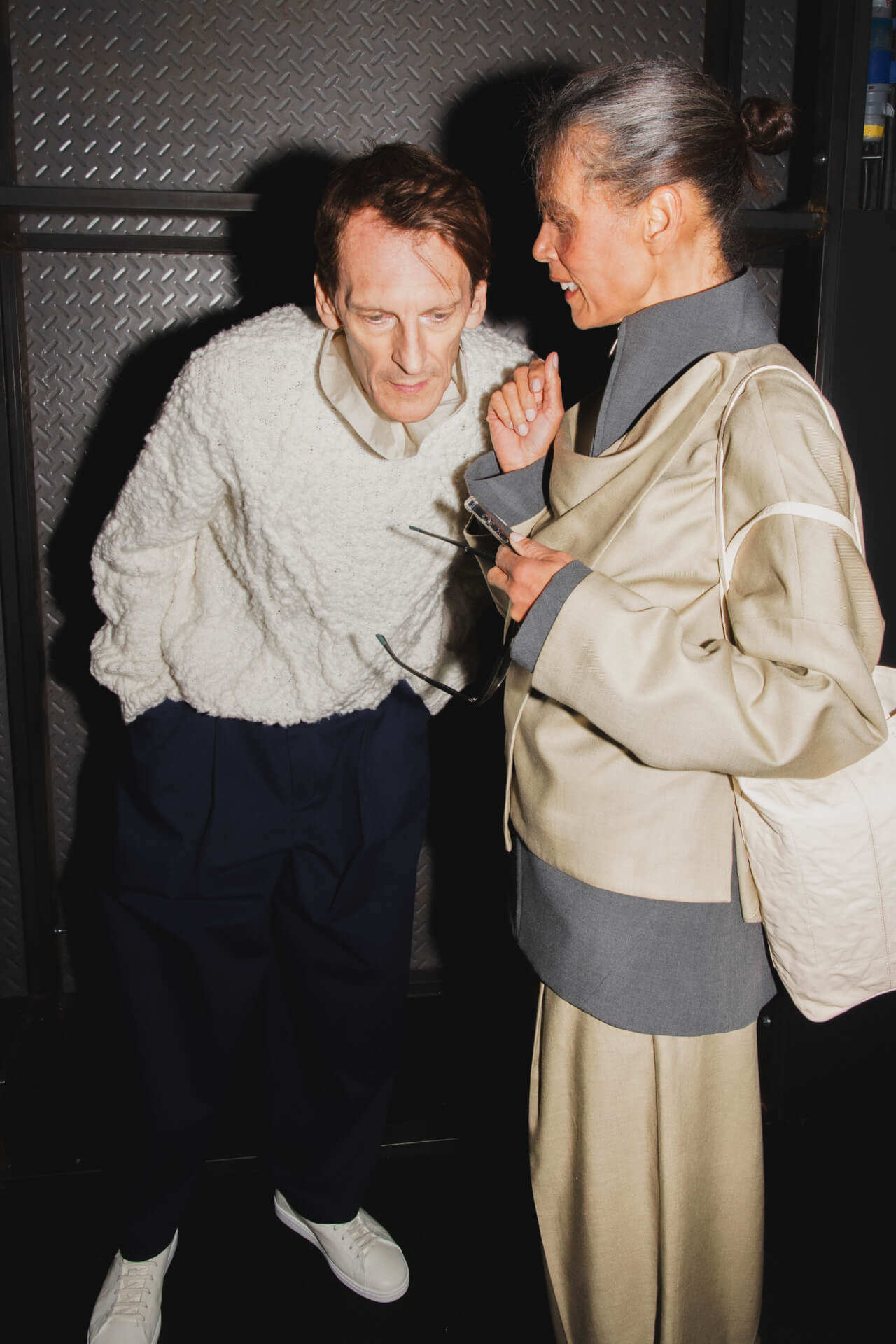 «El Número” begins with tailoring as its base. Blazers feature pronounced shoulders and displaced armholes, reshaped through invisible elastic elements, while wires and rods along the edges introduce tension and alter the silhouette. This logic extends into hybrid pieces: shirts that function as knitwear, ballerinas that act as sneakers and skirts conceived as trousers, opening each garment to multiple readings.