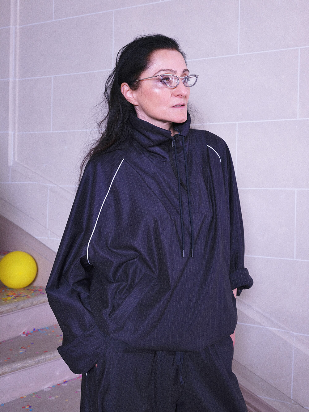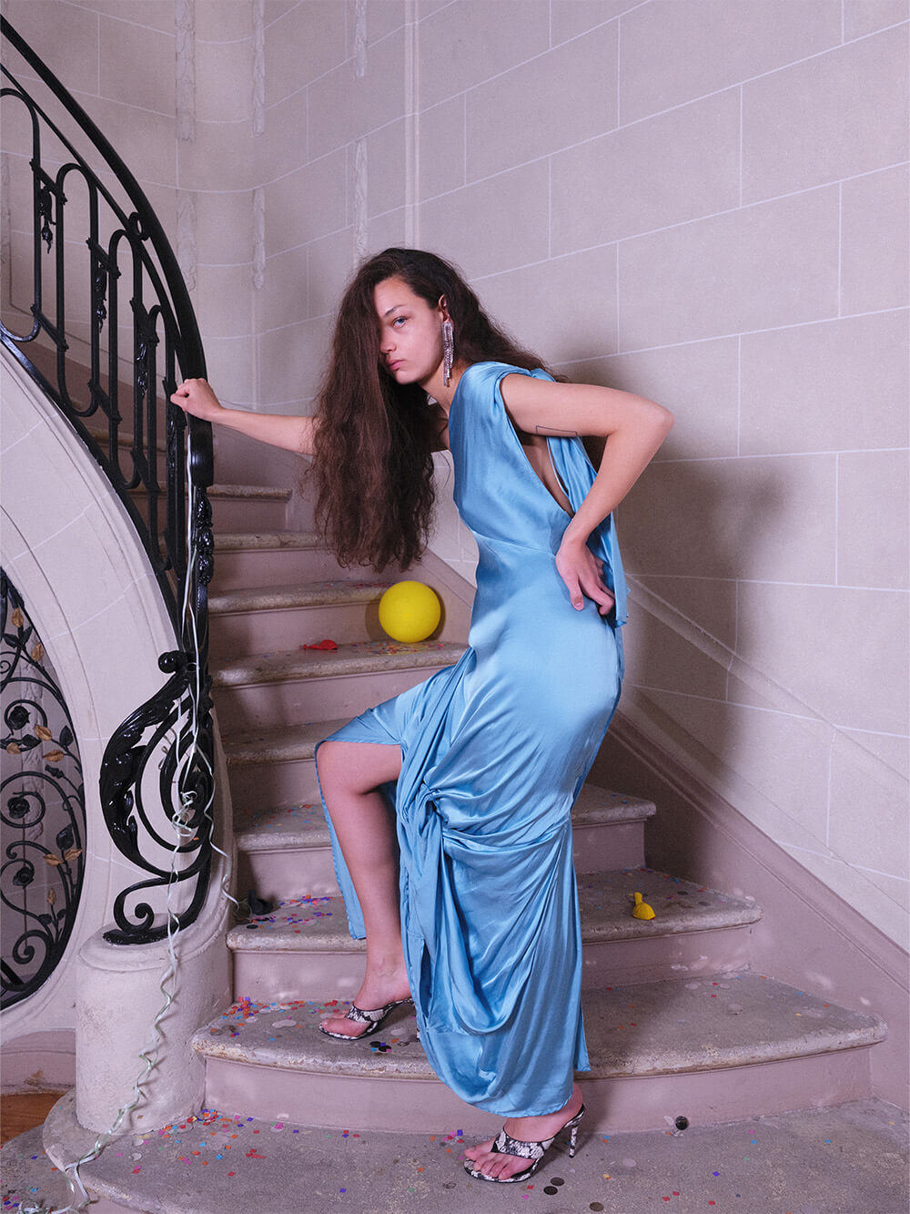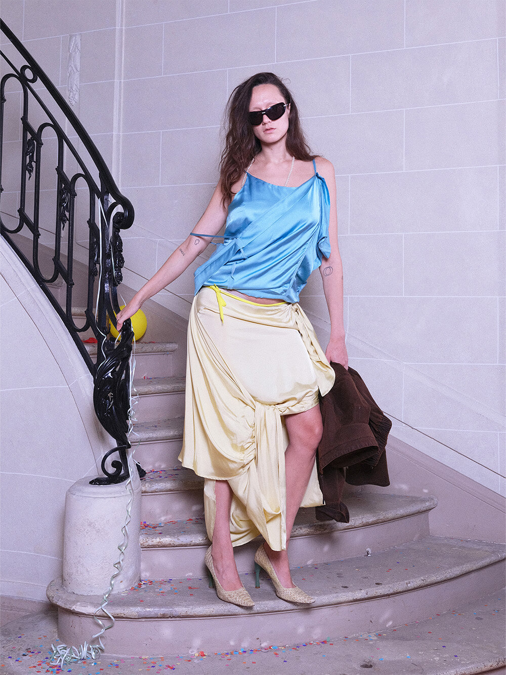 Façon Jacmin wrapped up the last day of Paris Fashion Week with their Spring Summer 2026 collection “The Morning After”. Sisters Alexandra Jacmin and Ségolène Jacmin drew inspiration from the renowned yearly cocktail served at the Délégation de Wallonie-Bruxelles. Politicians, media personalities, fashion enthusiasts, and artists gathered in one place yesterday. The presentation captured that moment of smudged makeup, untidy hair, looking for clothes while sipping Perrier in a post party haze, while some are cleaning up confetti and others continue to party just a bit longer. The immersive scenography saw models waking up across the room, applying makeup, or arriving late for work, expanded the idea further, and resembled a modern theater of daily life.