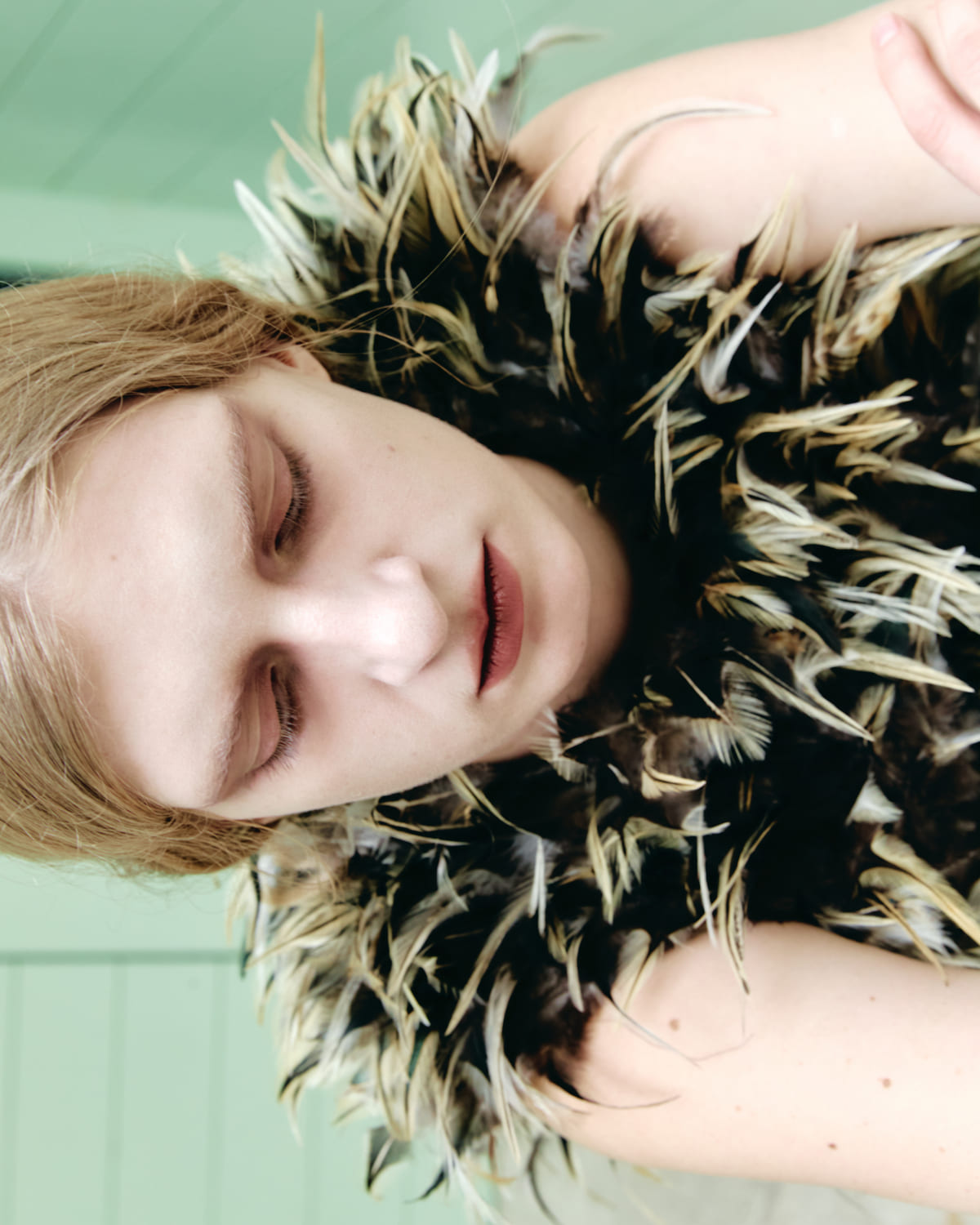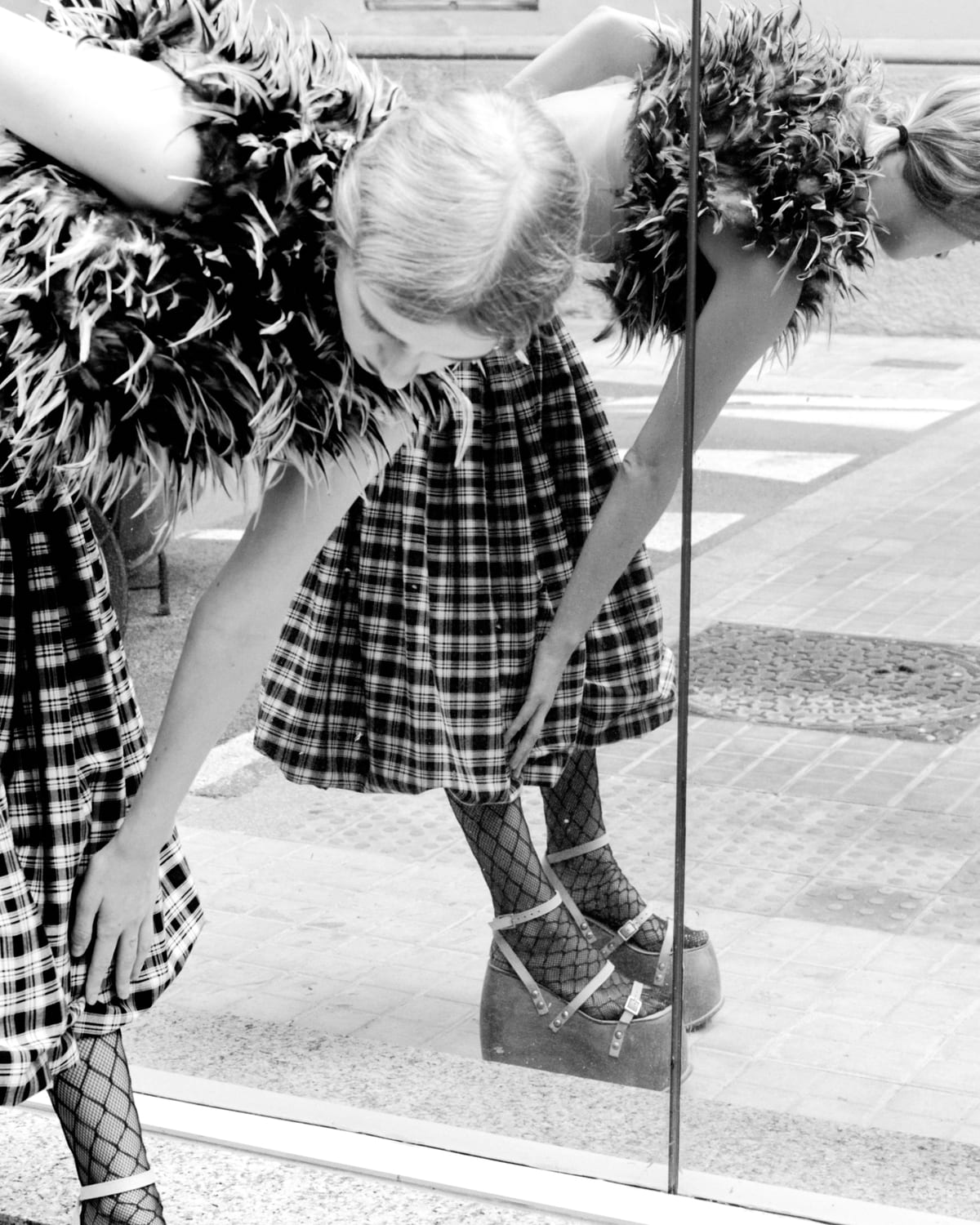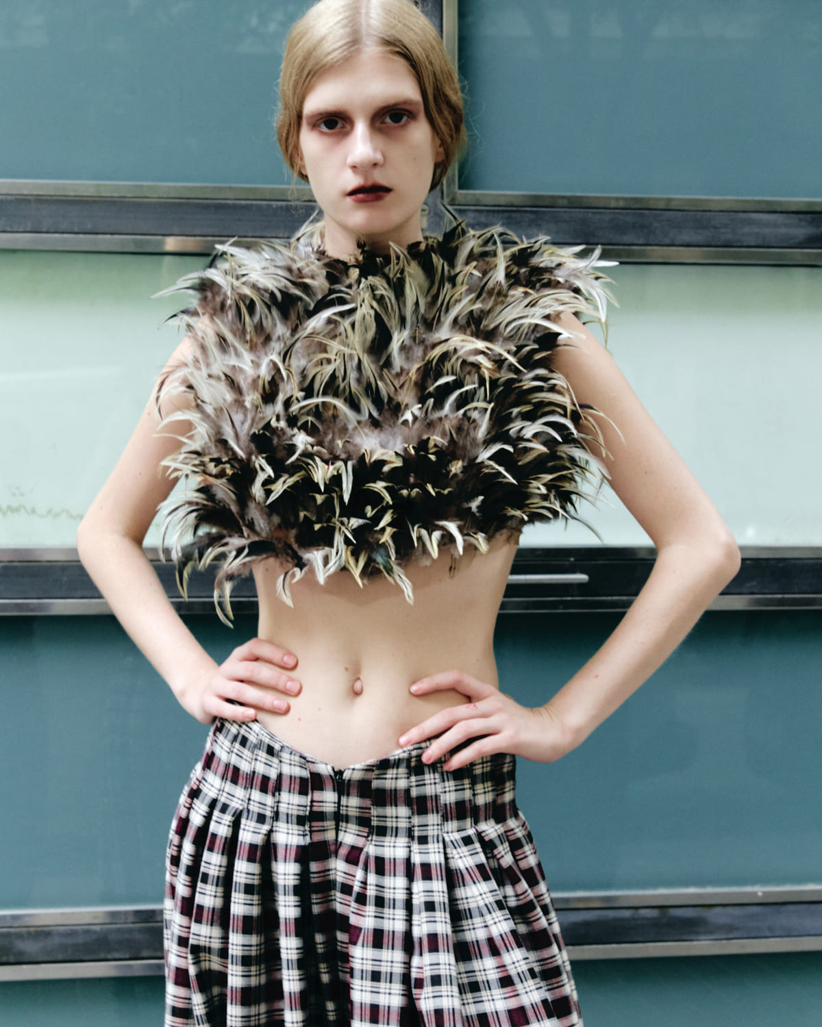 Feathers top POL GÓMEZ GONZÁLEZ, pants GUILLERMO JUSTICIA, tights HYD, shoes ACNE STUDIO