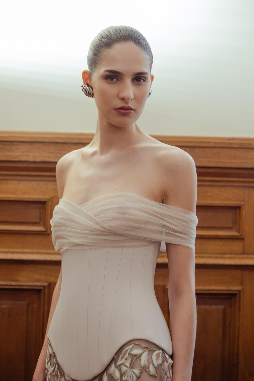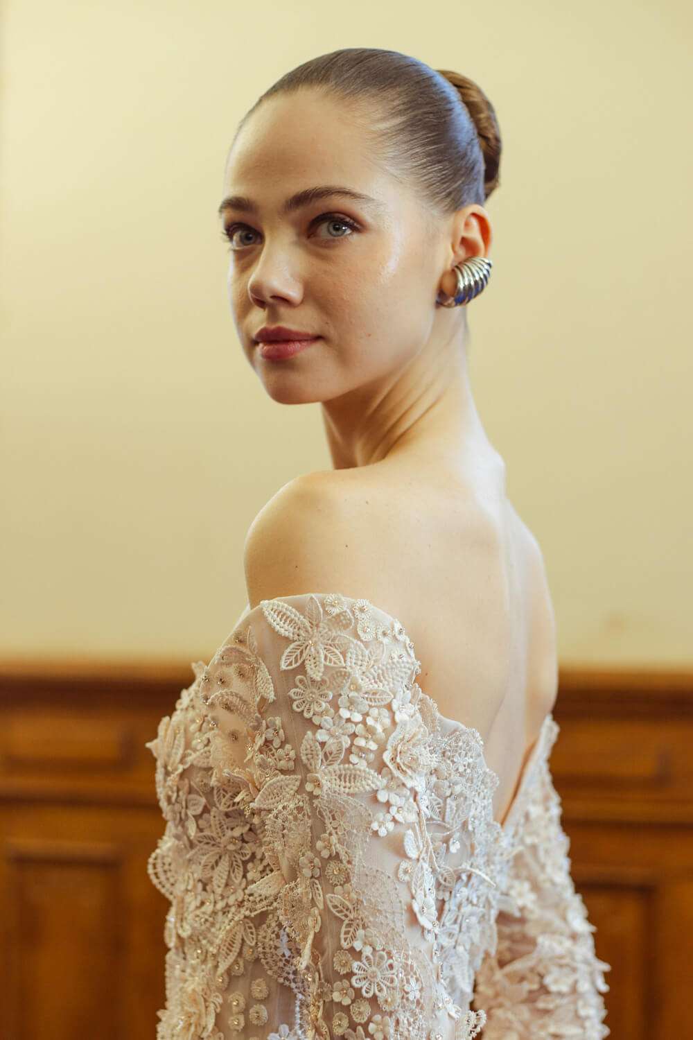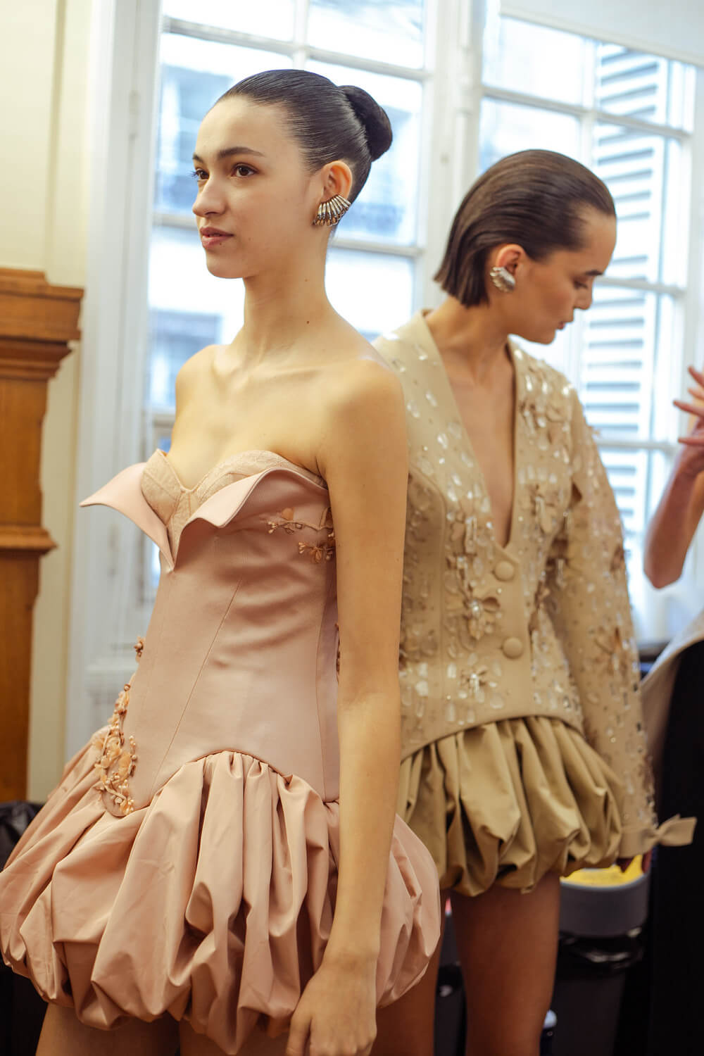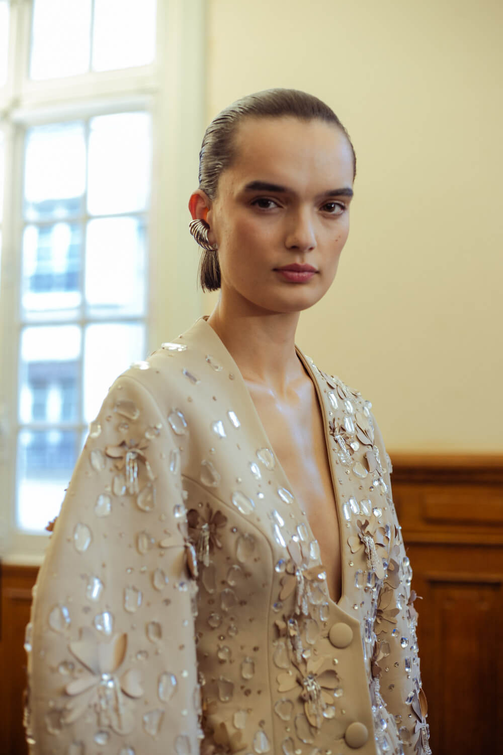 Photographer Leiya Wang takes us backstage where Hobeika’s couture touch is carried over to Ready to Wear. Silhouettes hug the body perfectly and the smooth movement of the fabric shows the soft, calm process Georges Hobeika took in making this collection. With a color palette made up of vanilla whites, caramelized beiges, raspberry pinks, and black specks, the garments reflect light at their best. Details bring the looks to life, with embroidered ensembles and small fringe touches to elevate the looks. There’s a perfect balance between sheer materials and traditional silhouettes, giving a classic, refined feel to the garments.