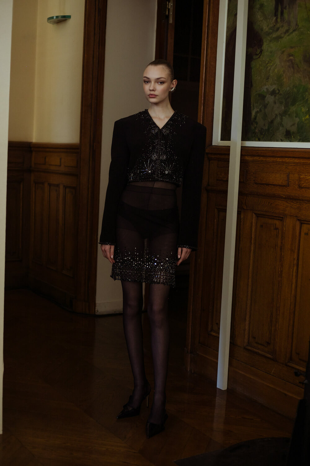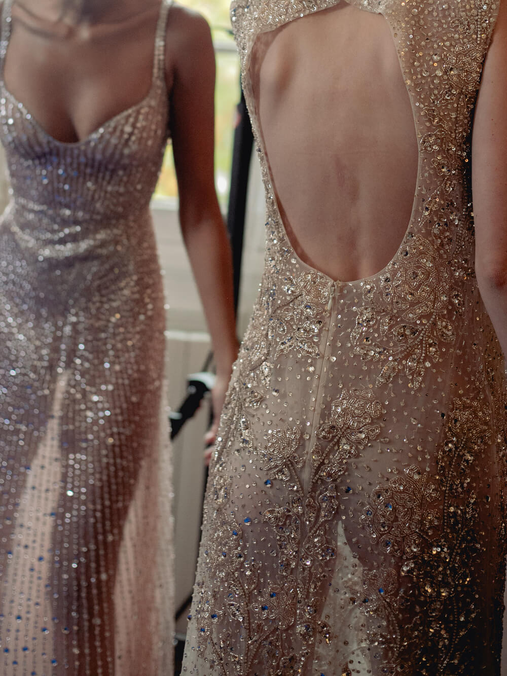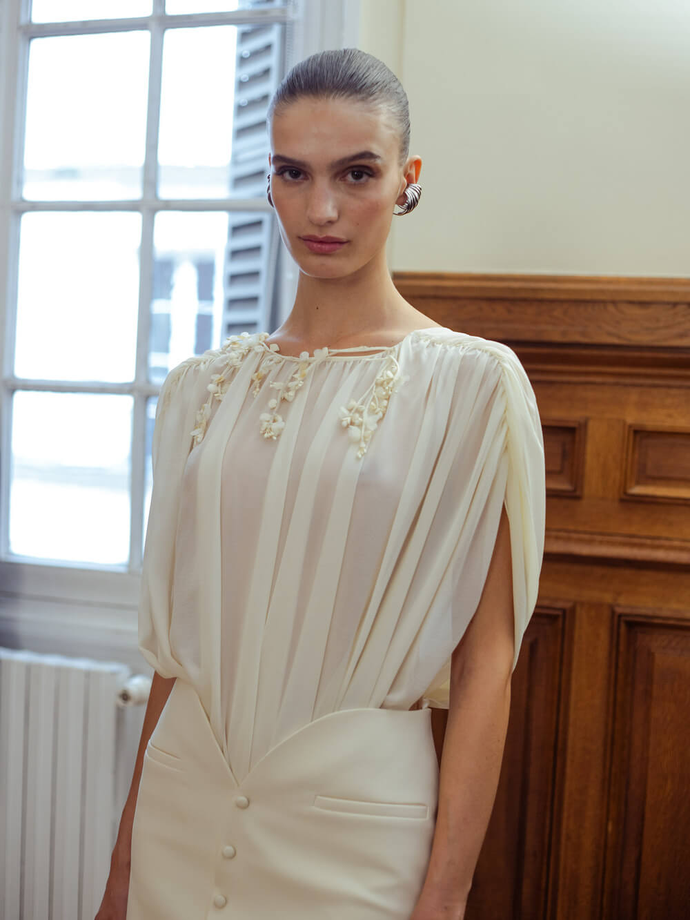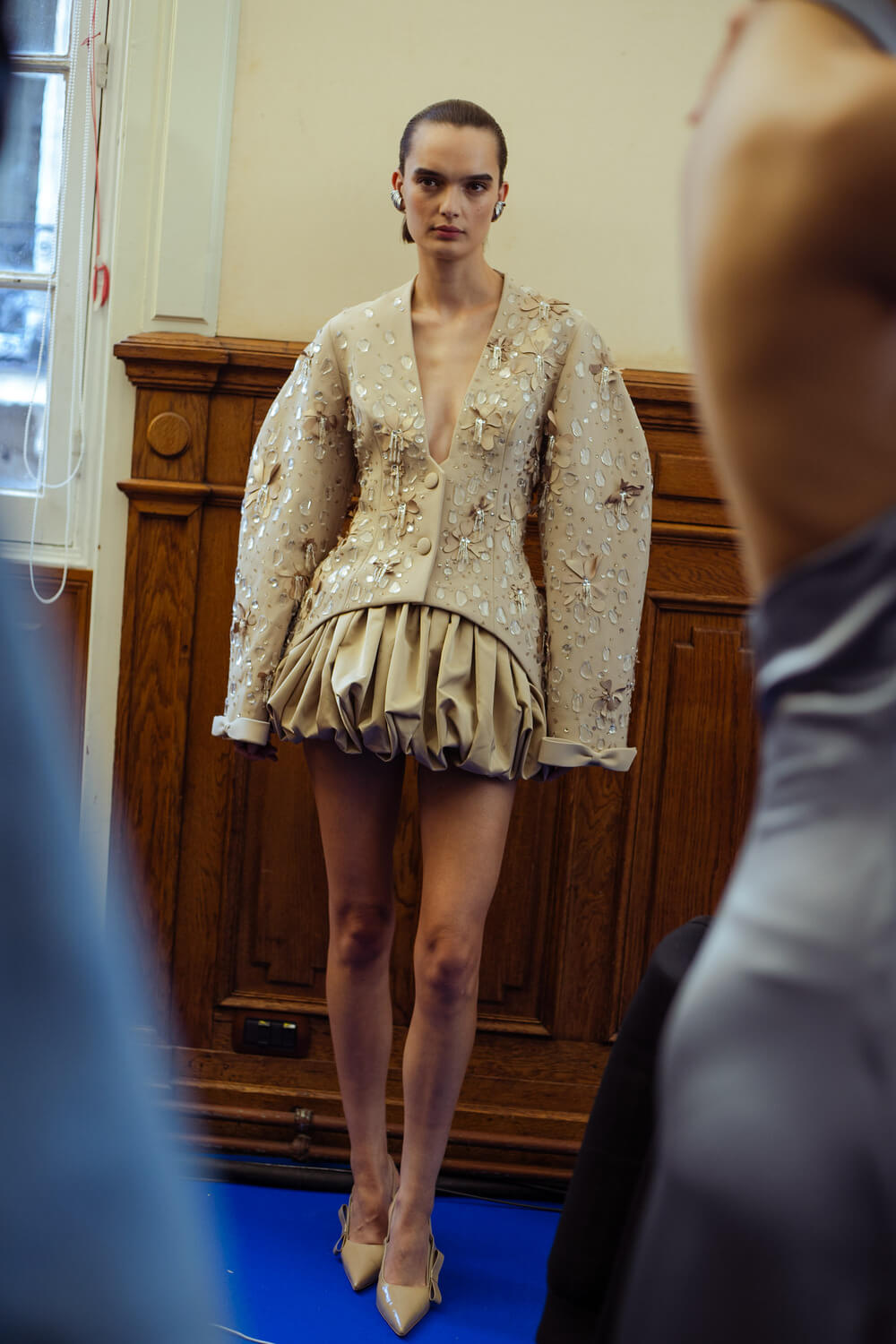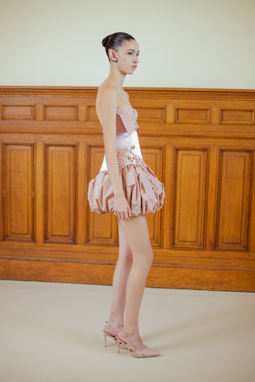 Photographer Leiya Wang takes us backstage where Hobeika’s couture touch is carried over to Ready to Wear. Silhouettes hug the body perfectly and the smooth movement of the fabric shows the soft, calm process Georges Hobeika took in making this collection. With a color palette made up of vanilla whites, caramelized beiges, raspberry pinks, and black specks, the garments reflect light at their best. Details bring the looks to life, with embroidered ensembles and small fringe touches to elevate the looks. There’s a perfect balance between sheer materials and traditional silhouettes, giving a classic, refined feel to the garments.