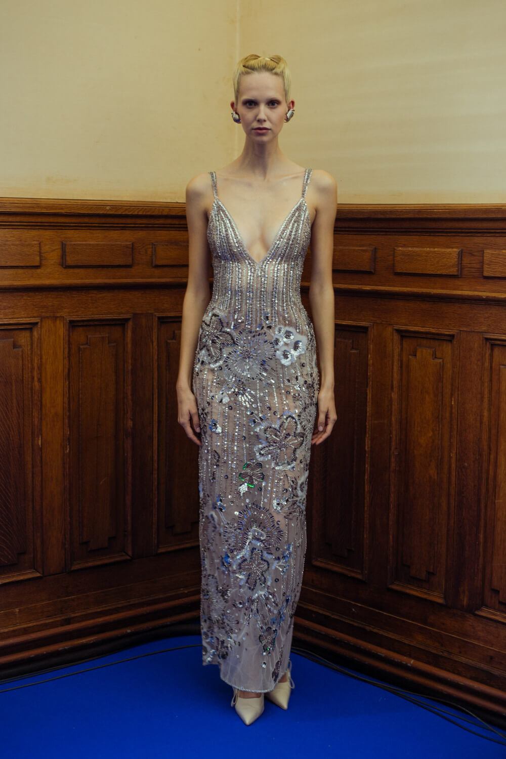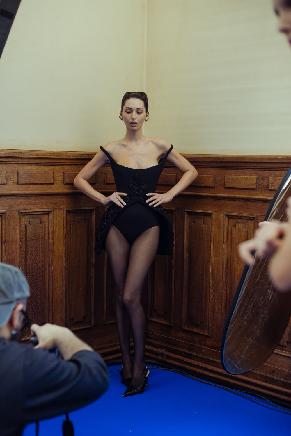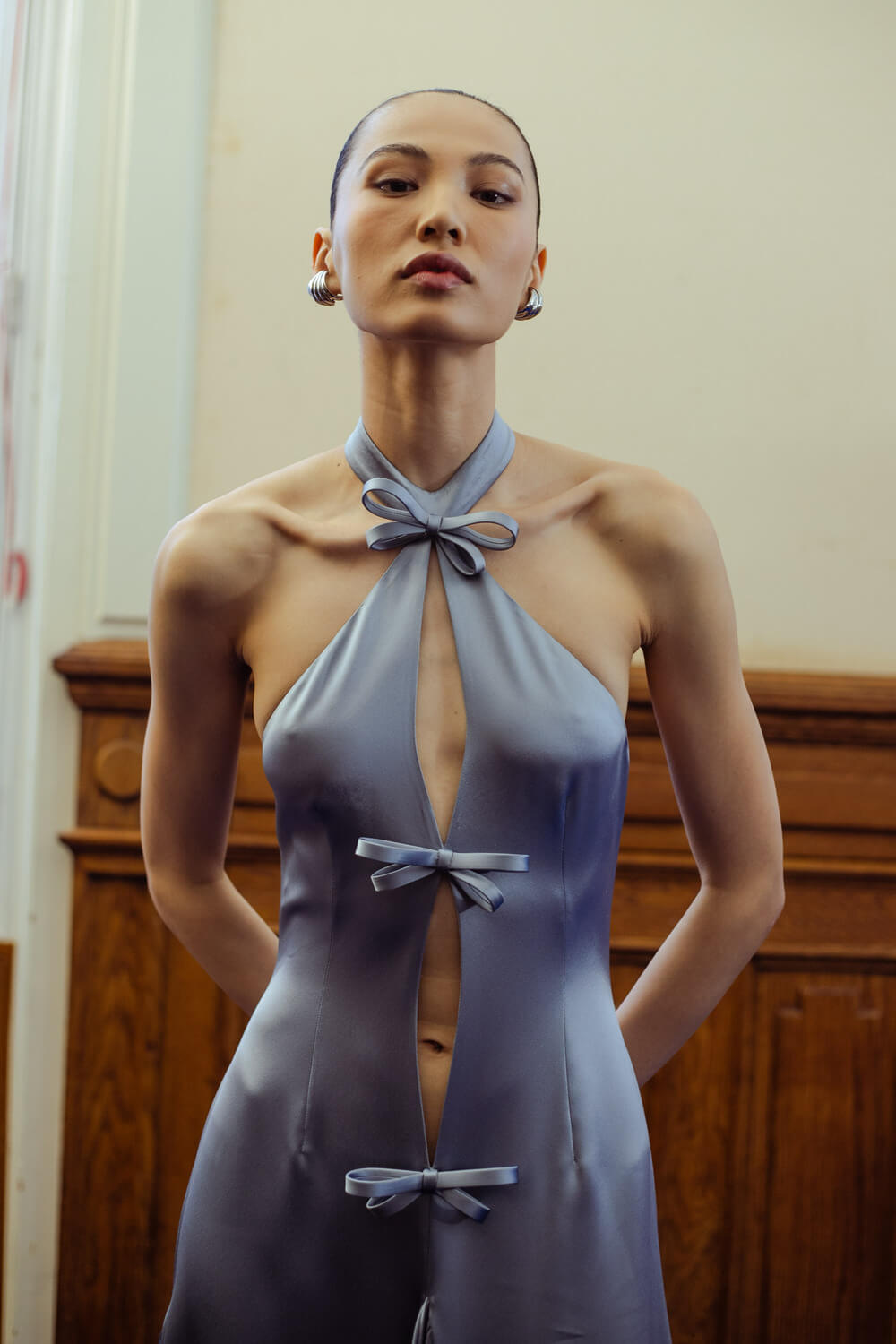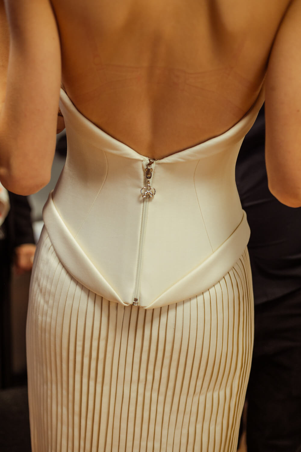 Photographer Leiya Wang takes us backstage where Hobeika’s couture touch is carried over to Ready to Wear. Silhouettes hug the body perfectly and the smooth movement of the fabric shows the soft, calm process Georges Hobeika took in making this collection. With a color palette made up of vanilla whites, caramelized beiges, raspberry pinks, and black specks, the garments reflect light at their best. Details bring the looks to life, with embroidered ensembles and small fringe touches to elevate the looks. There’s a perfect balance between sheer materials and traditional silhouettes, giving a classic, refined feel to the garments.