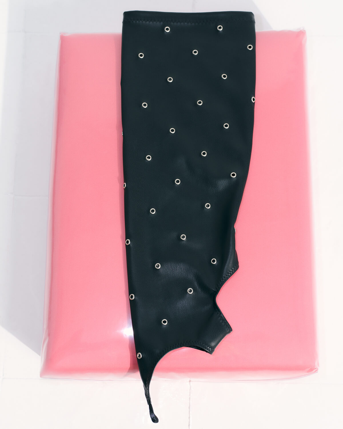 Calentadores de piel y ojales plateados transforman la Top negra en una forma renovada que combina artesanía y actitud contemporánea.