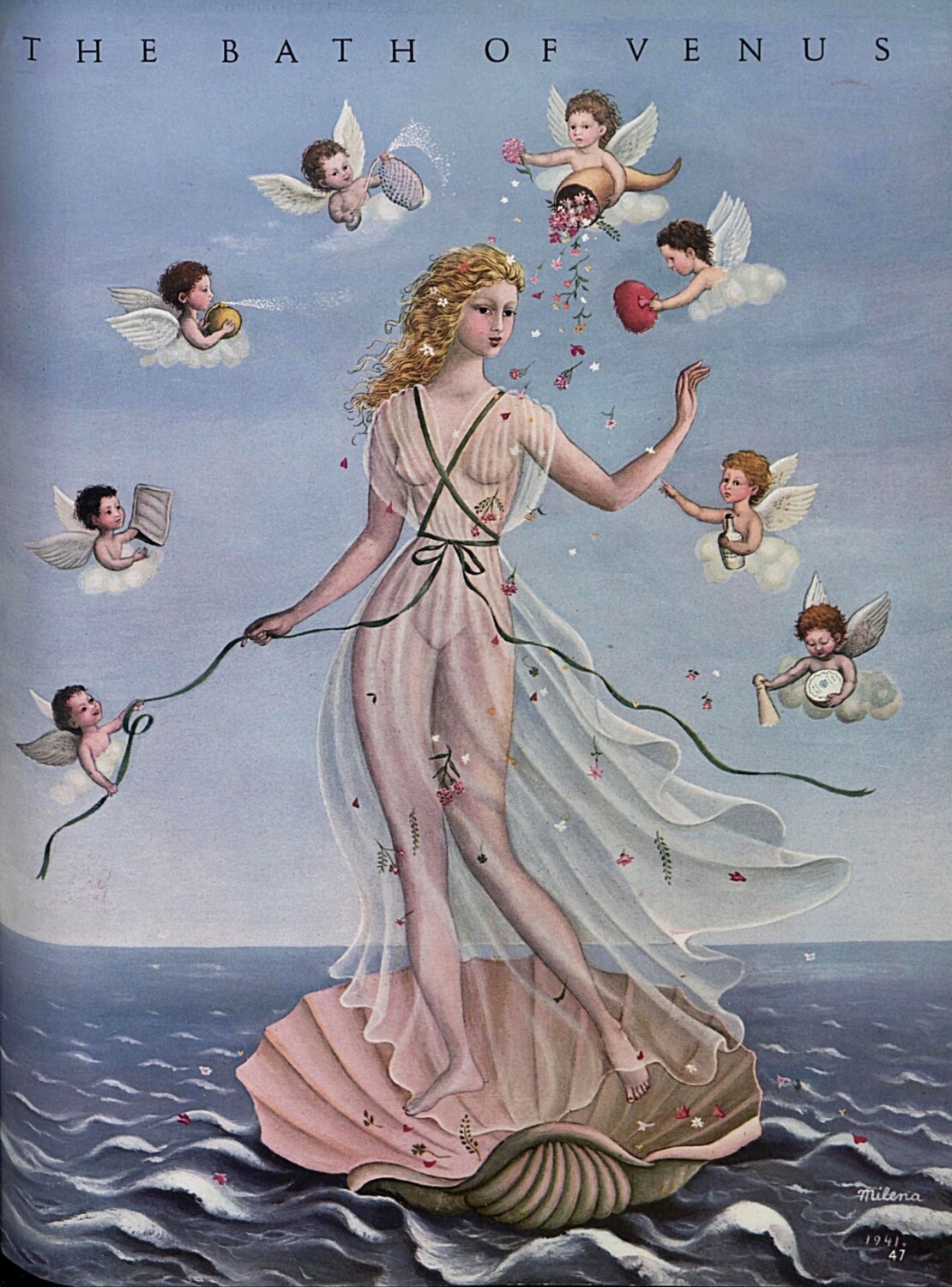 Identity occupies a central place in her work. Through repeated self representations, Milena Pavlović Barili constructs the self as image, presence and symbol, often situating her figure within dreamlike settings that blur interior and exterior space. She frequently appears against open skies populated by fragments of domestic life: draperies, ribbons, roses and elements reminiscent of bedrooms or intimate rooms, suspended in an oneiric atmosphere. Birds, the moon and marine motifs recur alongside classical architecture, statues and veils, forming a symbolic landscape where sea and sky, interior and memory coexist.