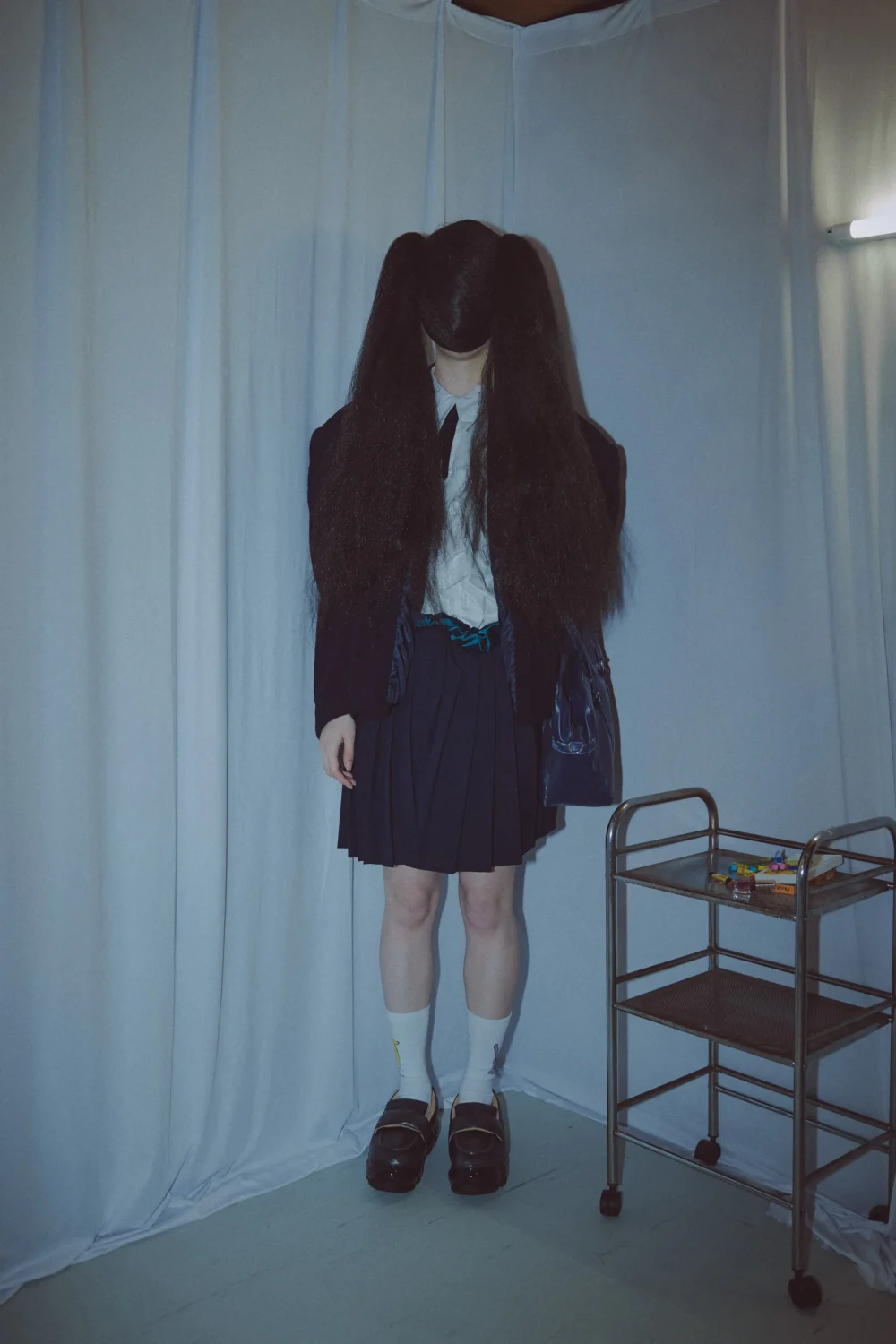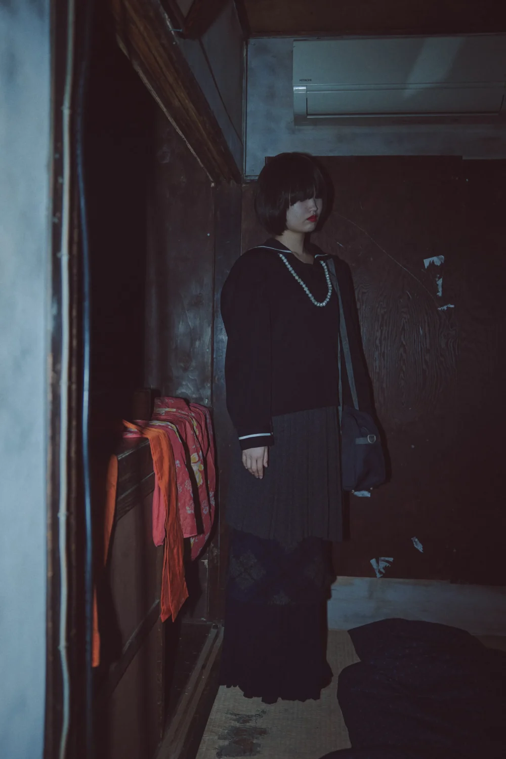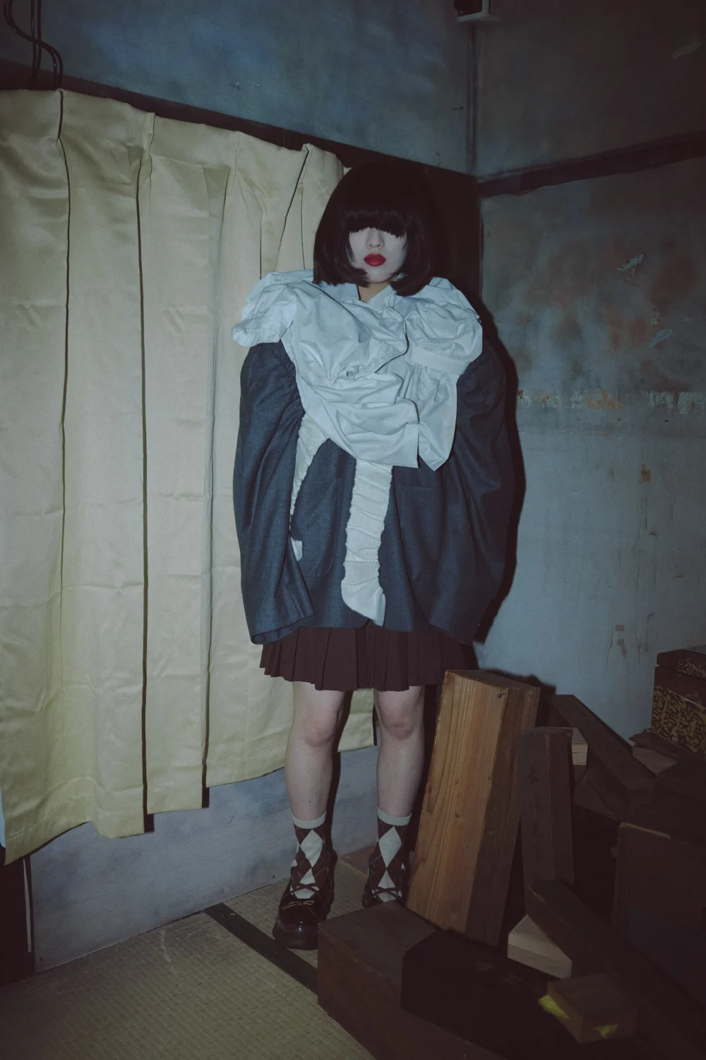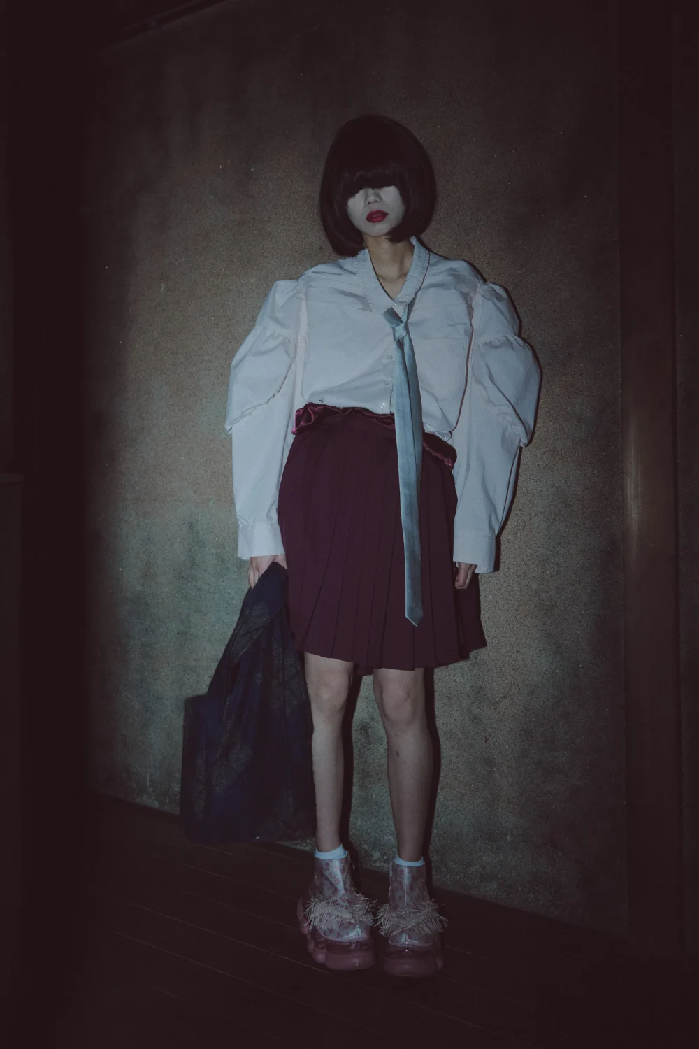 Garments appear partially obscured by darkness but leave clear impressions: twisted blouses that distort the silhouette, knitwear punctured with irregular holes, sharply constructed shoulders that interrupt the line of the body, and school uniforms reworked into something uncanny. A distorted kawaii aesthetic runs through the collection, where innocence coexists with discomfort. The pieces remain wearable, yet they seem to belong to a parallel reality, one governed by different emotional codes.