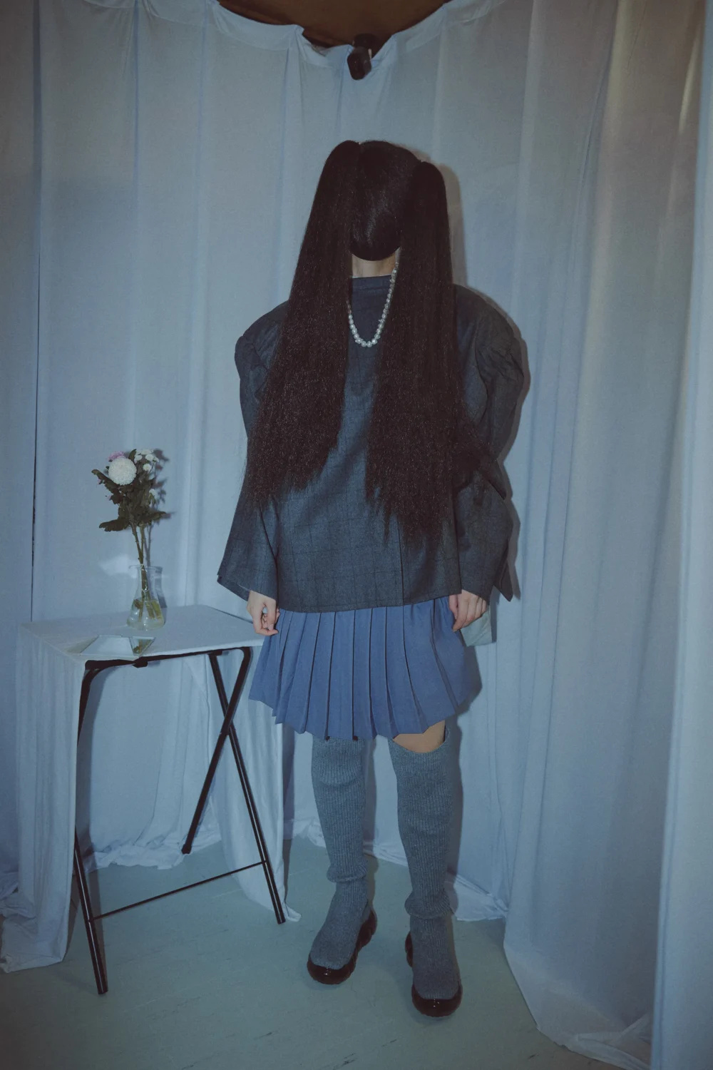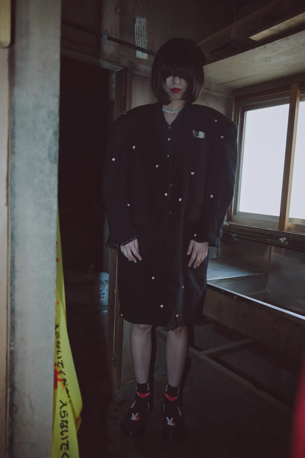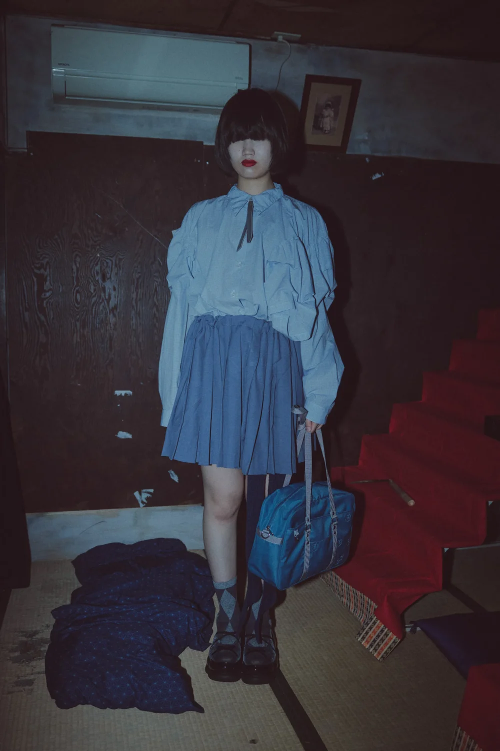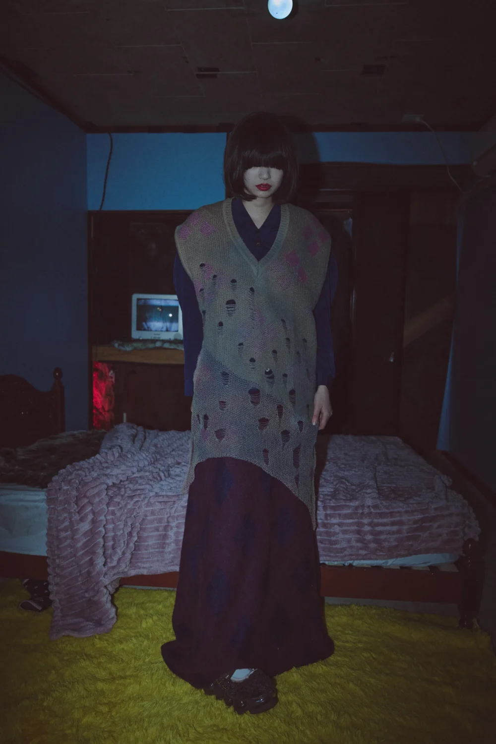 Garments appear partially obscured by darkness but leave clear impressions: twisted blouses that distort the silhouette, knitwear punctured with irregular holes, sharply constructed shoulders that interrupt the line of the body, and school uniforms reworked into something uncanny. A distorted kawaii aesthetic runs through the collection, where innocence coexists with discomfort. The pieces remain wearable, yet they seem to belong to a parallel reality, one governed by different emotional codes.