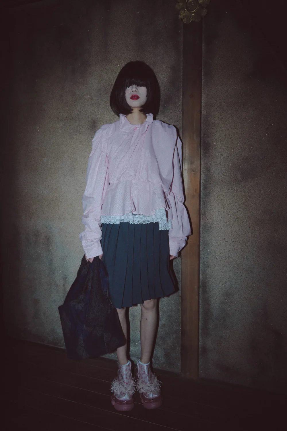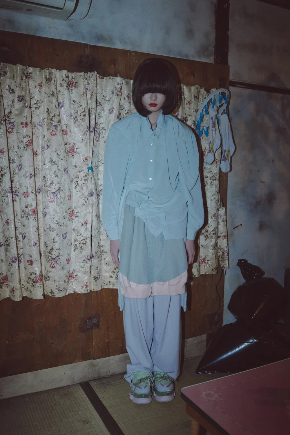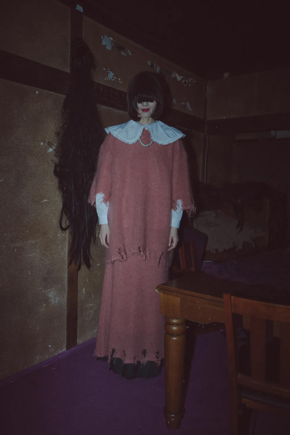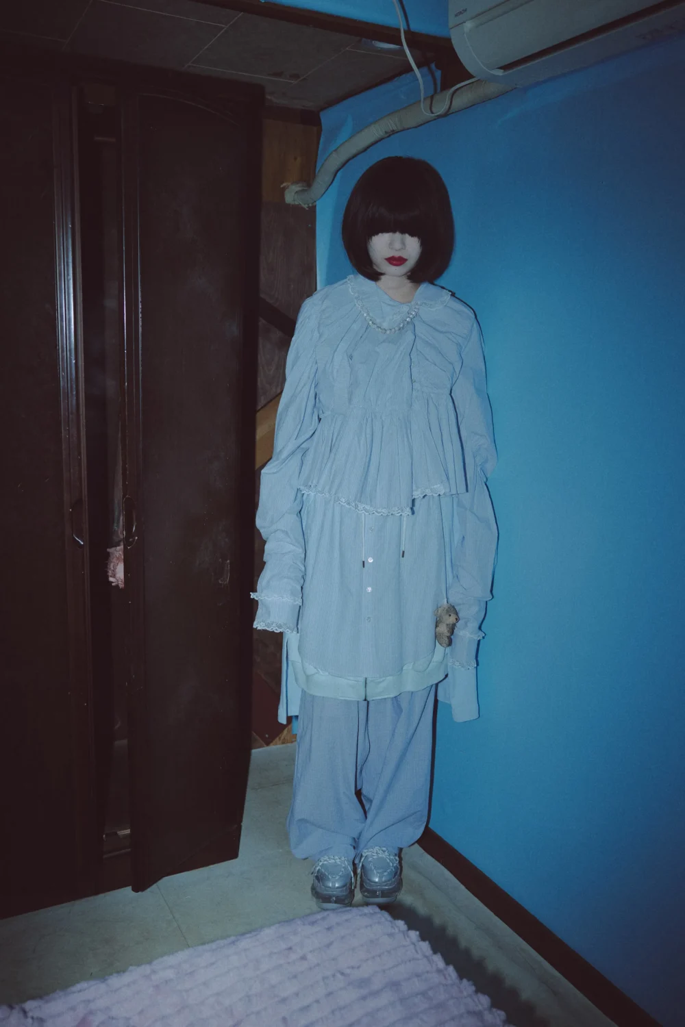Garments appear partially obscured by darkness but leave clear impressions: twisted blouses that distort the silhouette, knitwear punctured with irregular holes, sharply constructed shoulders that interrupt the line of the body, and school uniforms reworked into something uncanny. A distorted kawaii aesthetic runs through the collection, where innocence coexists with discomfort. The pieces remain wearable, yet they seem to belong to a parallel reality, one governed by different emotional codes.