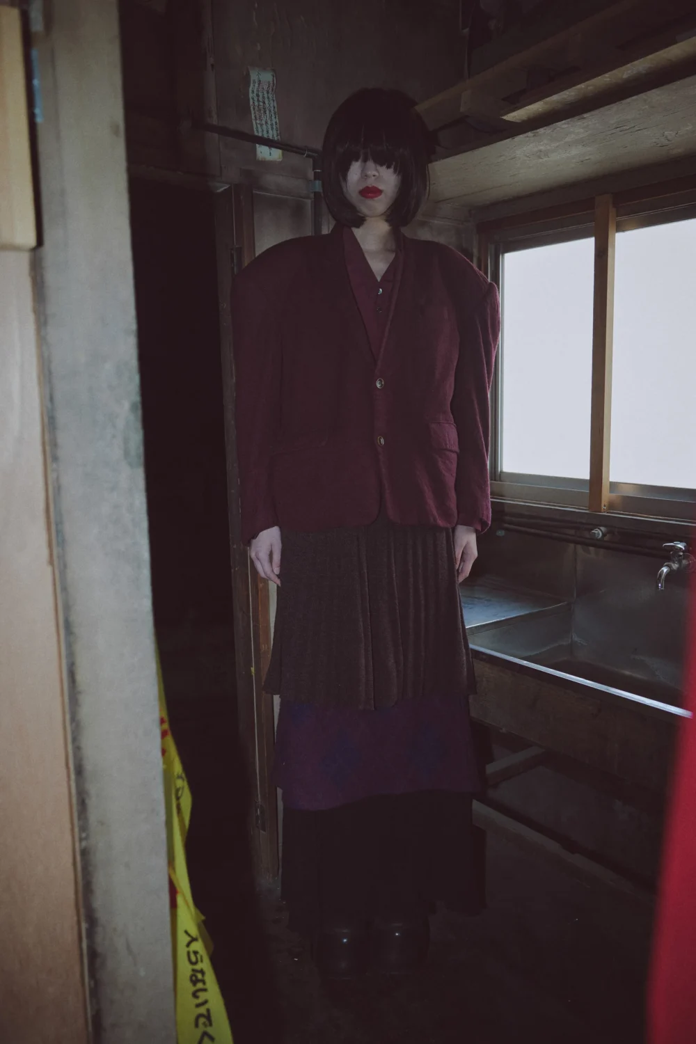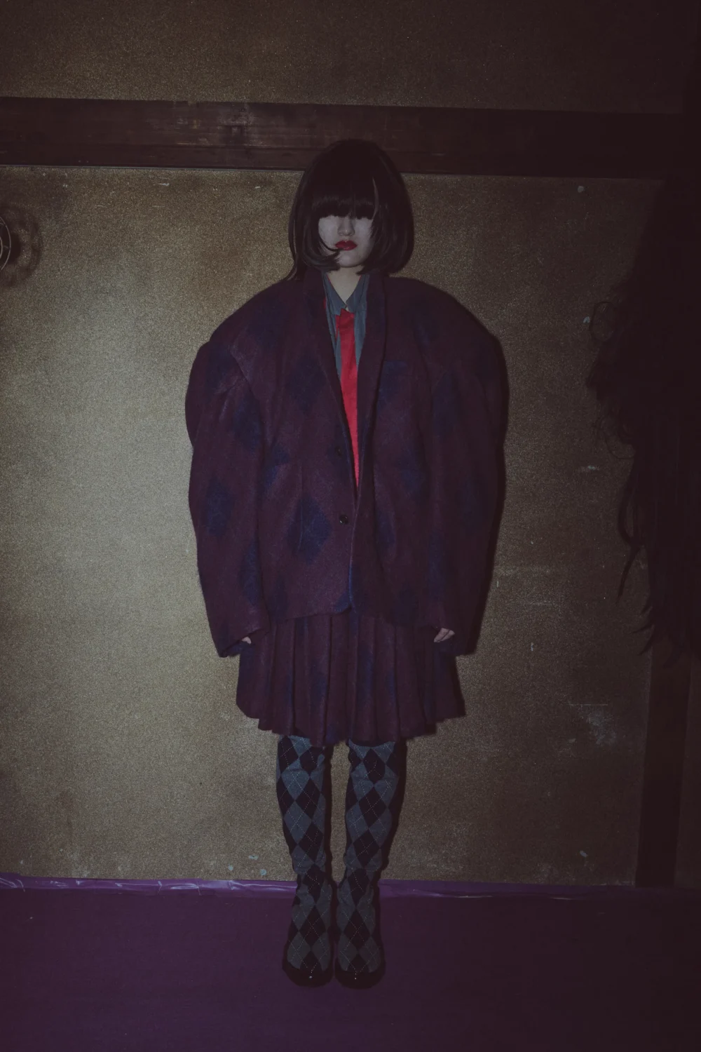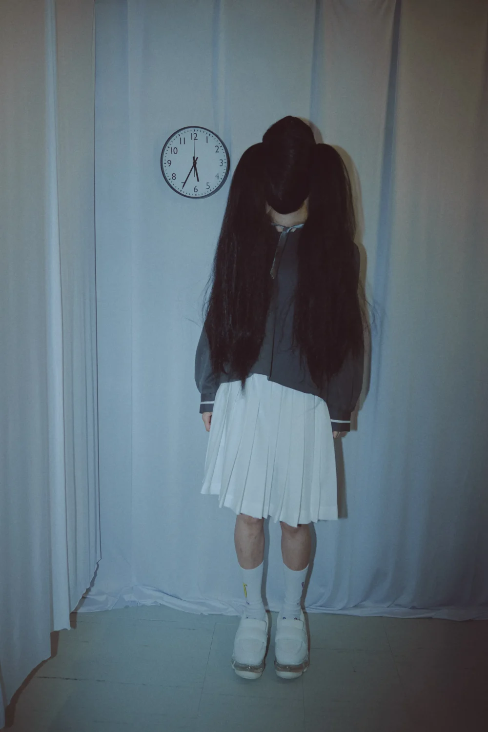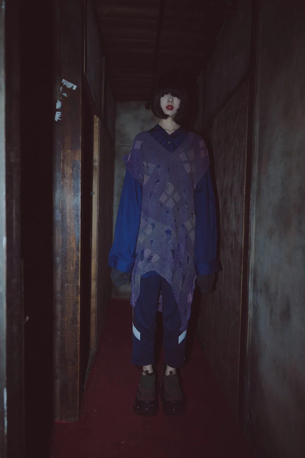 Garments appear partially obscured by darkness but leave clear impressions: twisted blouses that distort the silhouette, knitwear punctured with irregular holes, sharply constructed shoulders that interrupt the line of the body, and school uniforms reworked into something uncanny. A distorted kawaii aesthetic runs through the collection, where innocence coexists with discomfort. The pieces remain wearable, yet they seem to belong to a parallel reality, one governed by different emotional codes.