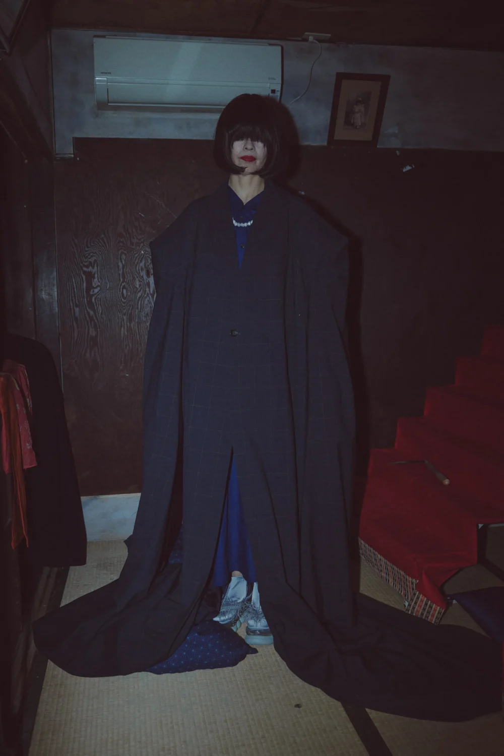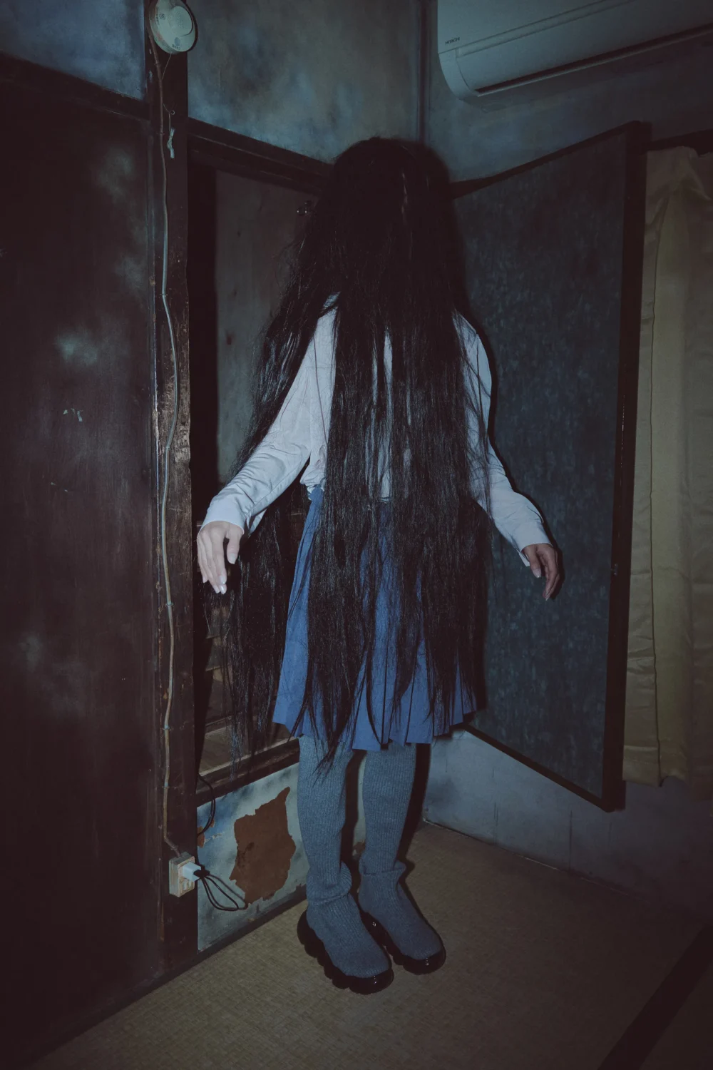 Set inside a 90-year-old Japanese house reimagined as a haunted structure, the presentation unfolds across ten dimly lit rooms. Each one holds a fragment: a figure, a gesture, a suspended scene. The audience does not sit and observe but moves, hesitates, reacts. Fear becomes physical, almost tactile, guiding the rhythm of the experience. What emerges is not a sequence of looks but a succession of sensations.