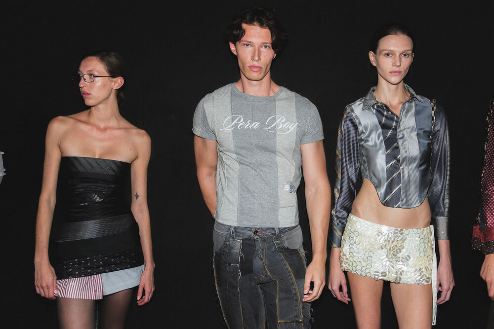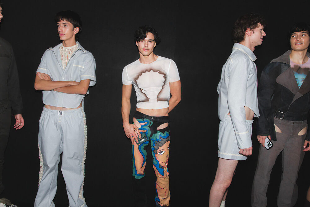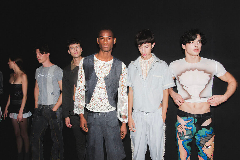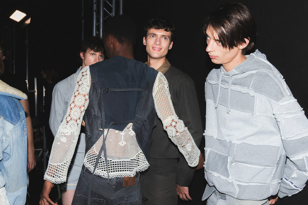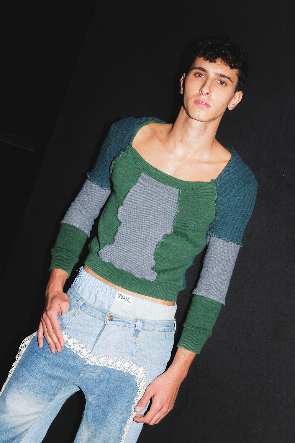 Tailored blazers, moccasins, polos, and school-uniform echoes collide with ripped denim, crochet inserts, hand-painted motifs and reinvented “luxury” fabrics. The backstage buzz: models waiting in hoodies made from old jackets, ties repurposed into tops, vests turned into outerwear — each piece a visual wink to transformation. In a climate of fast drops and viral gimmicks, JUAN VG’s show reminds us of something deeper. This is about reclaiming what was cast aside — garments, identities, style codes. It’s about building new narratives from discarded ones. His up-cycling isn’t a technique of choice; it’s a refusal of disposal, a push for meaning.