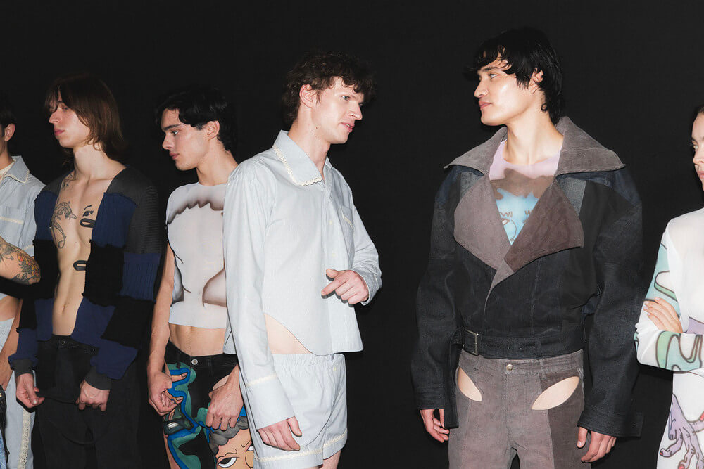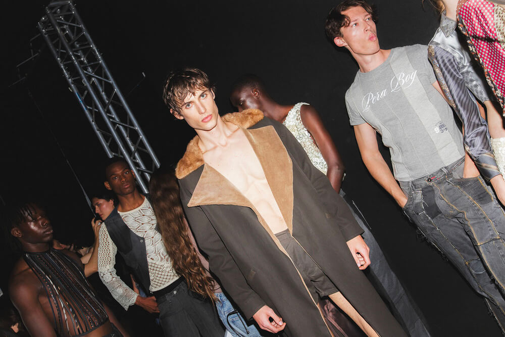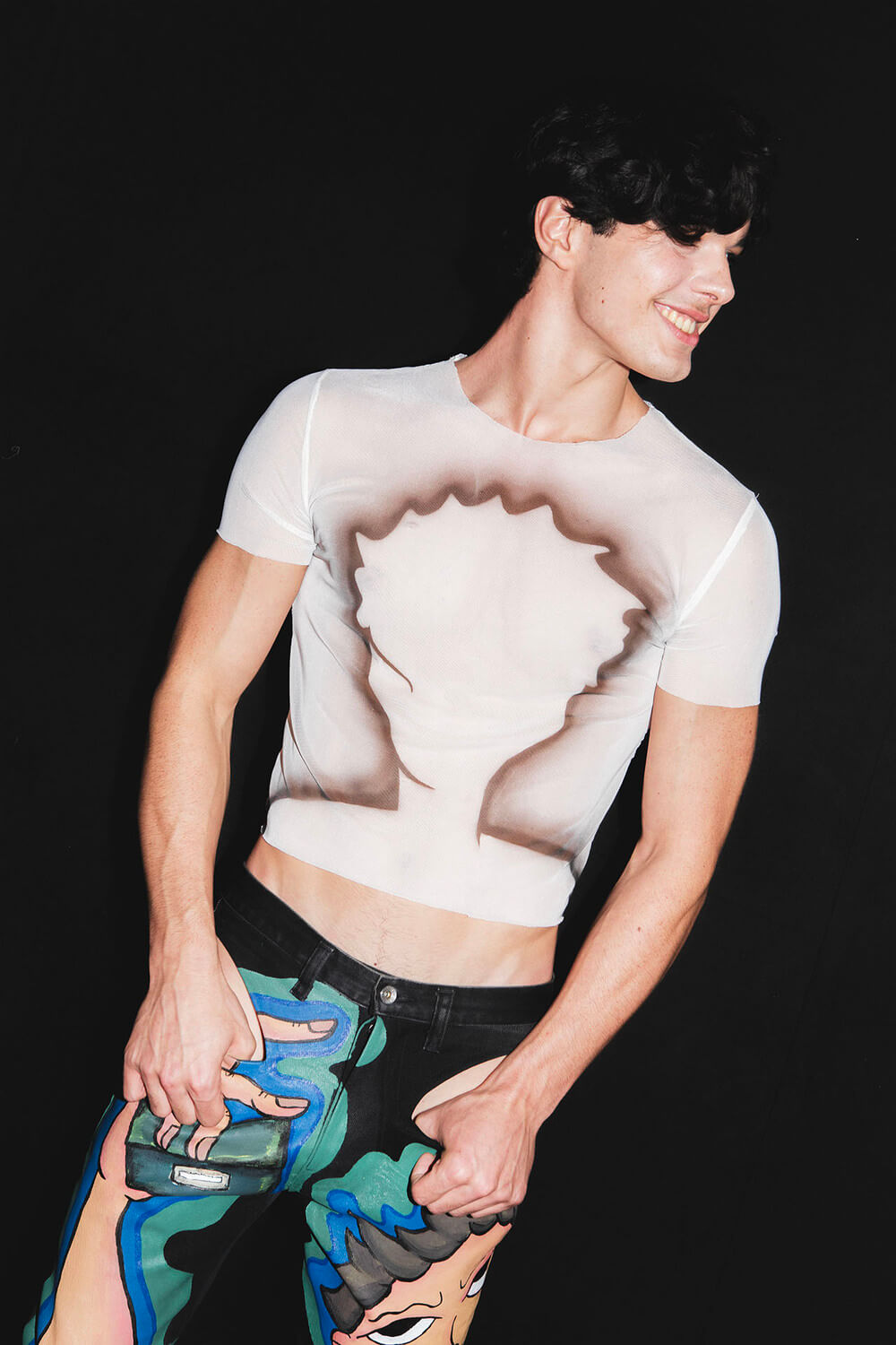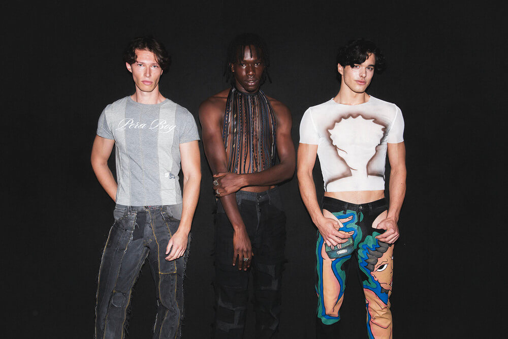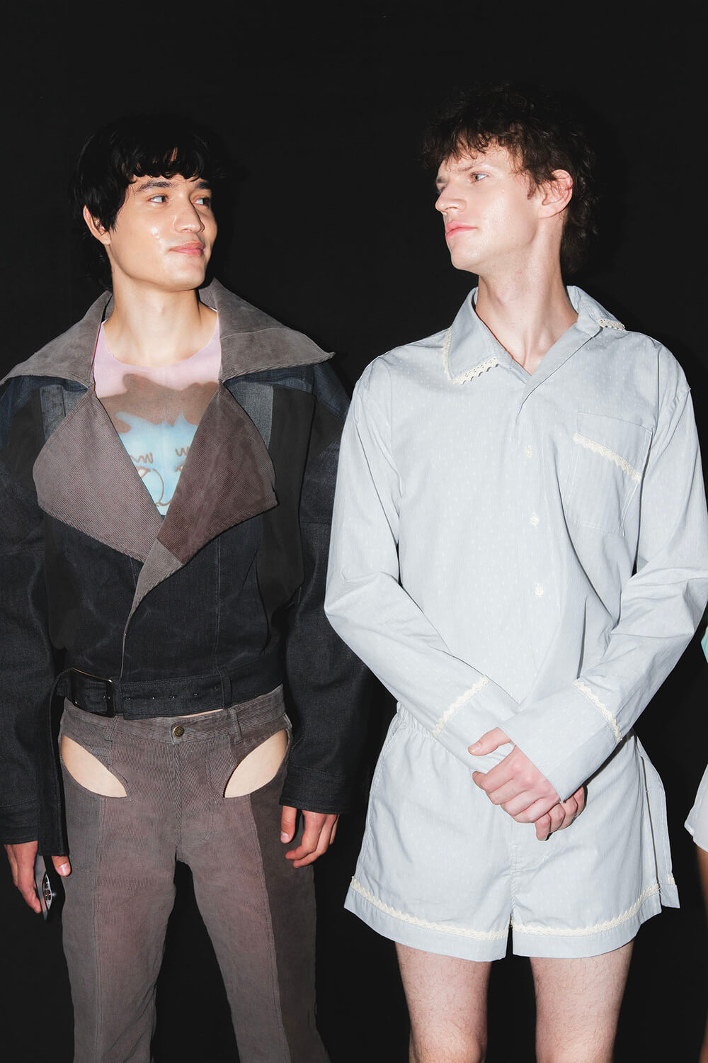 Tailored blazers, moccasins, polos, and school-uniform echoes collide with ripped denim, crochet inserts, hand-painted motifs and reinvented “luxury” fabrics. The backstage buzz: models waiting in hoodies made from old jackets, ties repurposed into tops, vests turned into outerwear — each piece a visual wink to transformation. In a climate of fast drops and viral gimmicks, JUAN VG’s show reminds us of something deeper. This is about reclaiming what was cast aside — garments, identities, style codes. It’s about building new narratives from discarded ones. His up-cycling isn’t a technique of choice; it’s a refusal of disposal, a push for meaning.