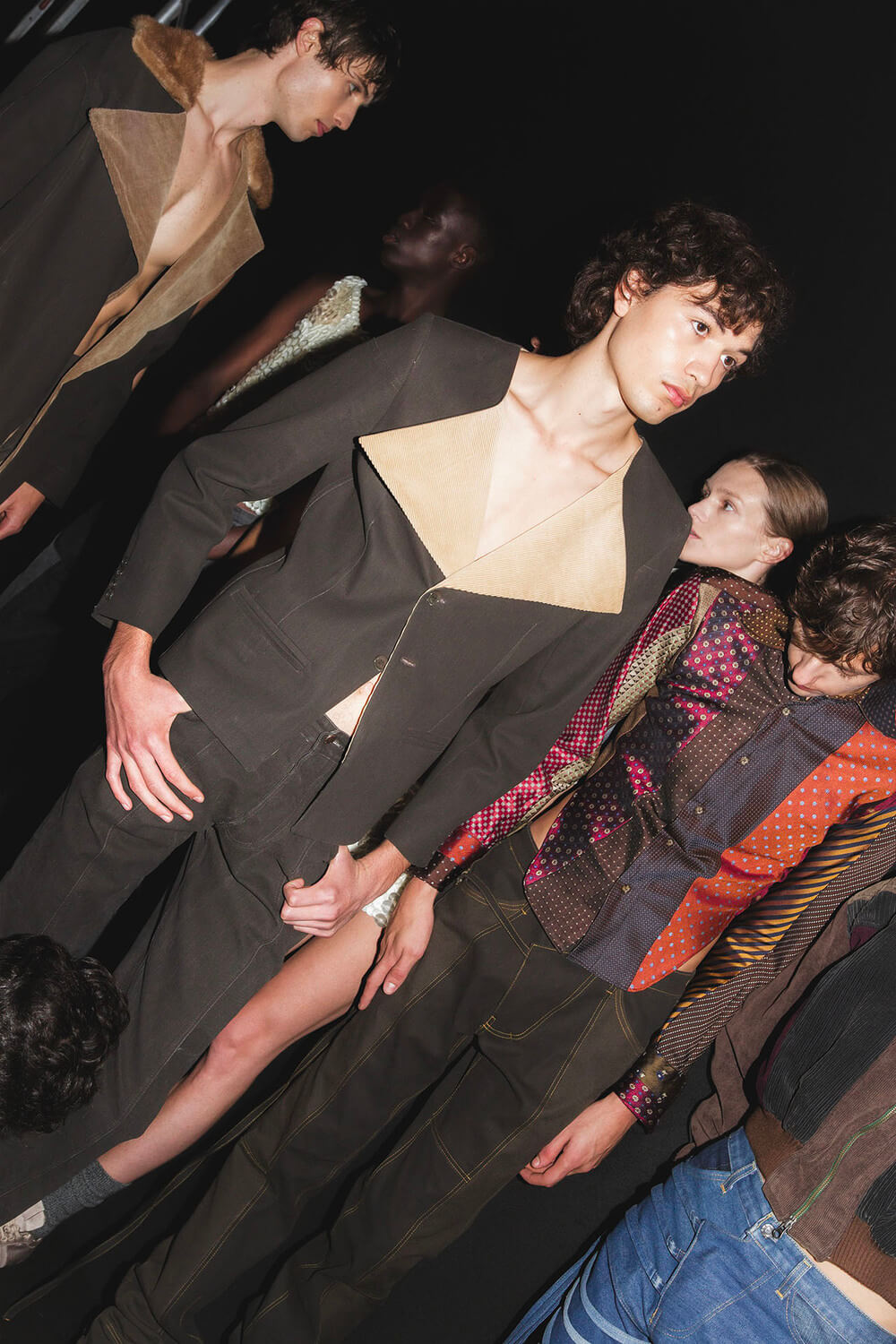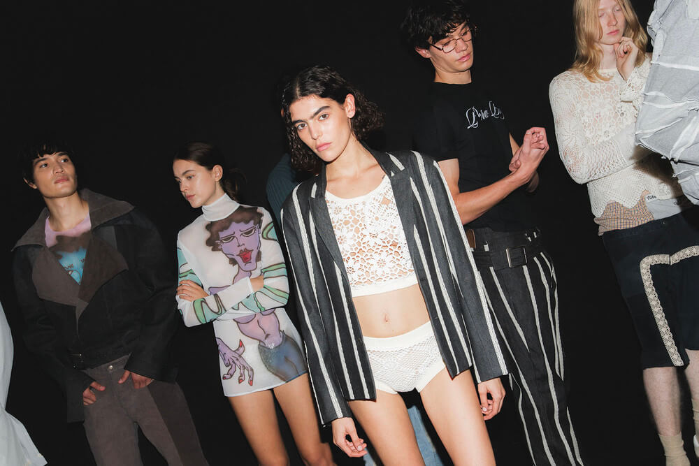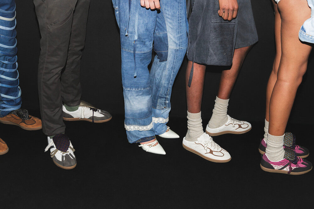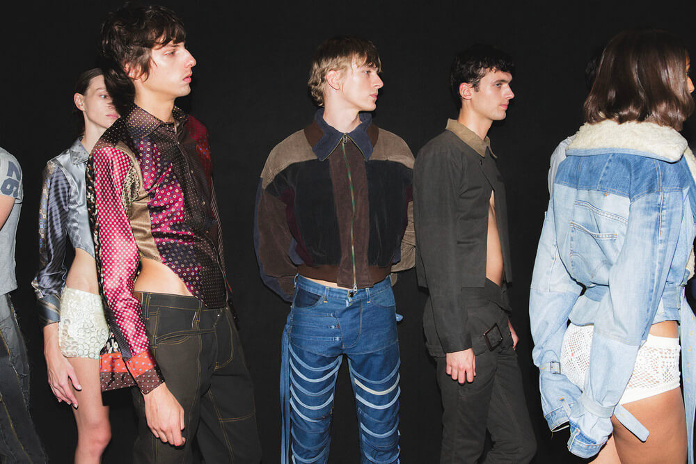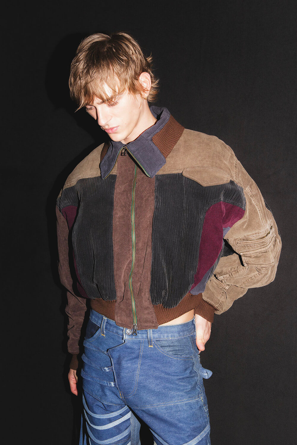 Tailored blazers, moccasins, polos, and school-uniform echoes collide with ripped denim, crochet inserts, hand-painted motifs and reinvented “luxury” fabrics. The backstage buzz: models waiting in hoodies made from old jackets, ties repurposed into tops, vests turned into outerwear — each piece a visual wink to transformation. In a climate of fast drops and viral gimmicks, JUAN VG’s show reminds us of something deeper. This is about reclaiming what was cast aside — garments, identities, style codes. It’s about building new narratives from discarded ones. His up-cycling isn’t a technique of choice; it’s a refusal of disposal, a push for meaning.