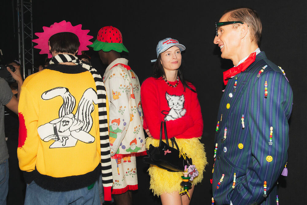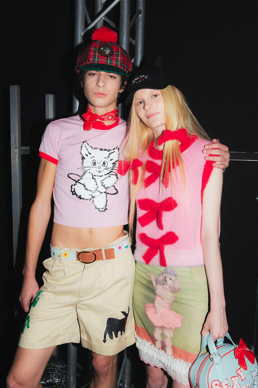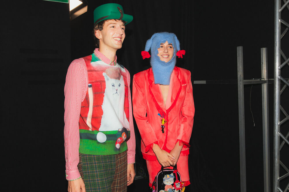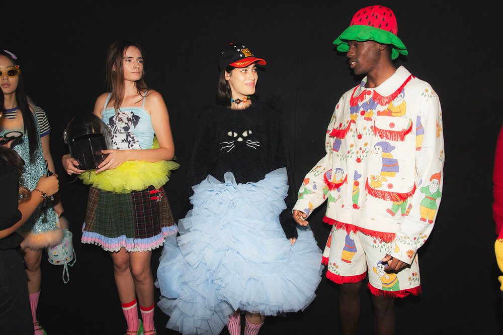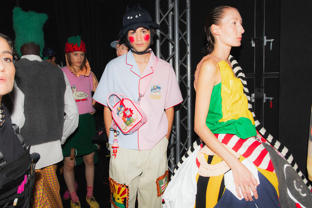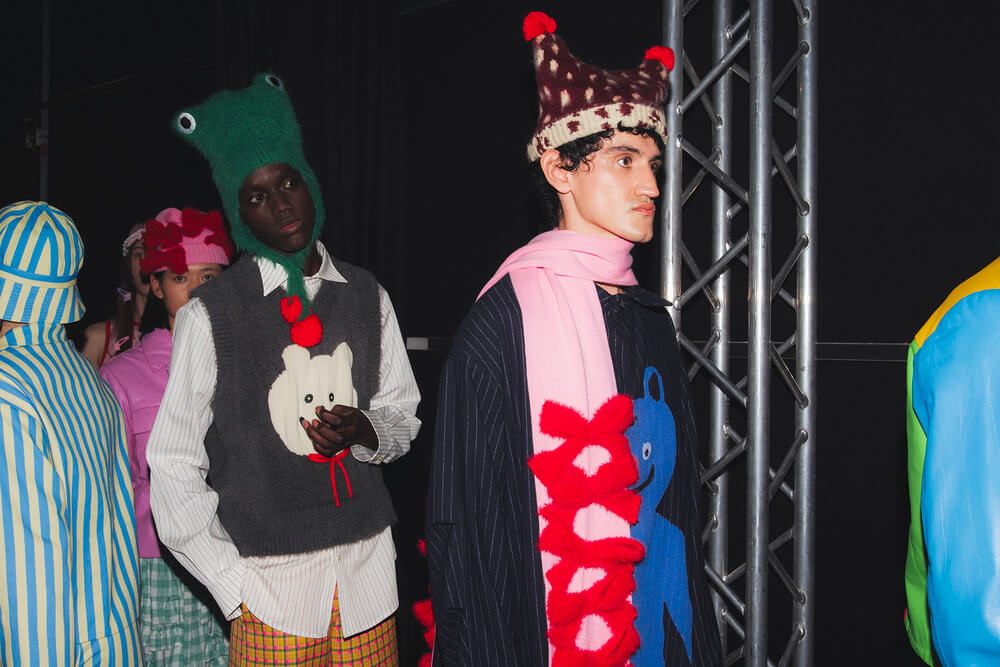 In one corner a model stood with a school-backpack silhouette turned adult-serious; in another, tweed jackets bore cartoon-like patches or oversized appliqués. The vibe is unmistakable: preppy meets punk, play meets polish. (They even label themselves “preppy-punk”.)