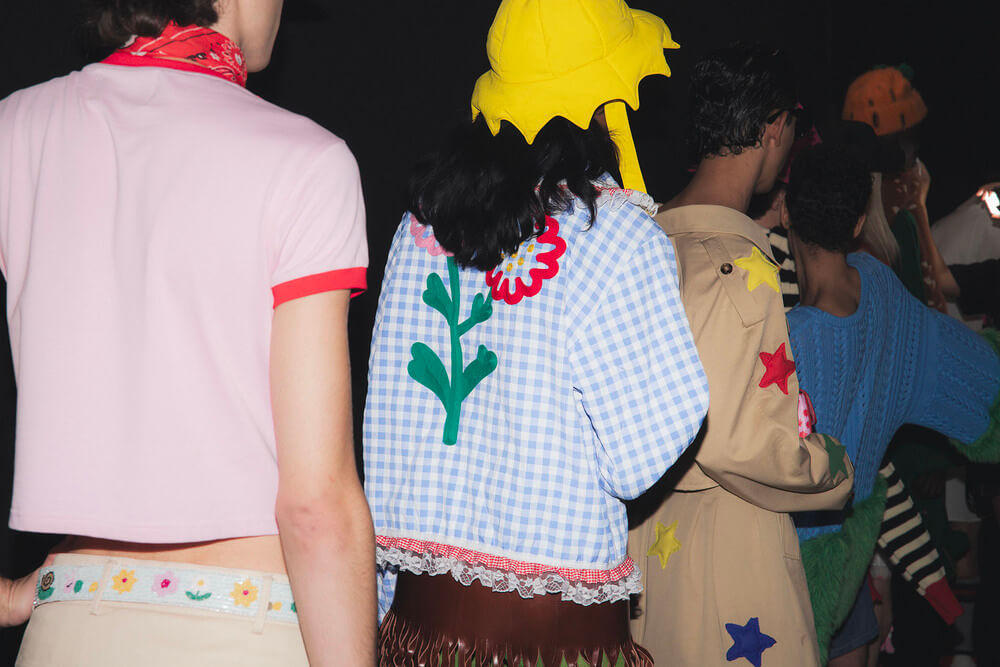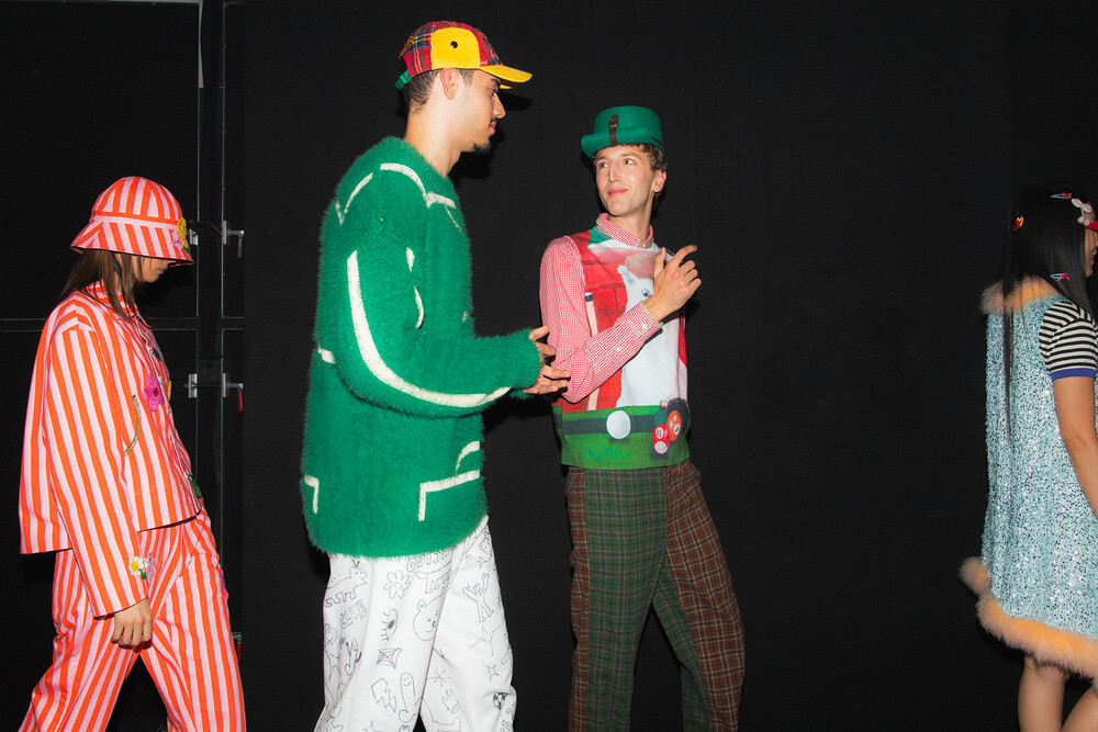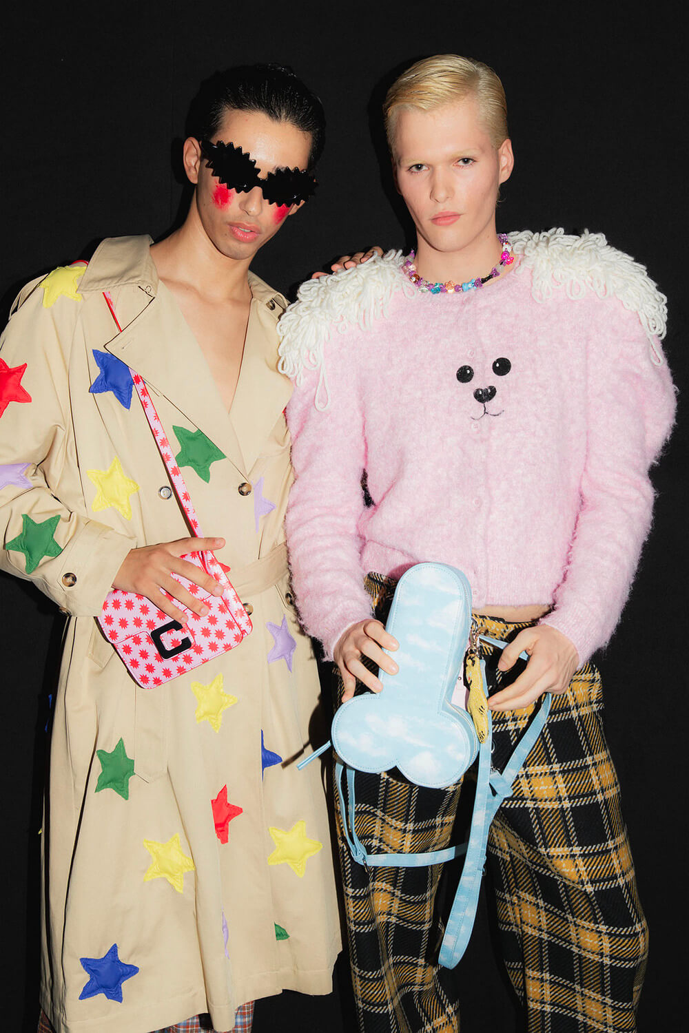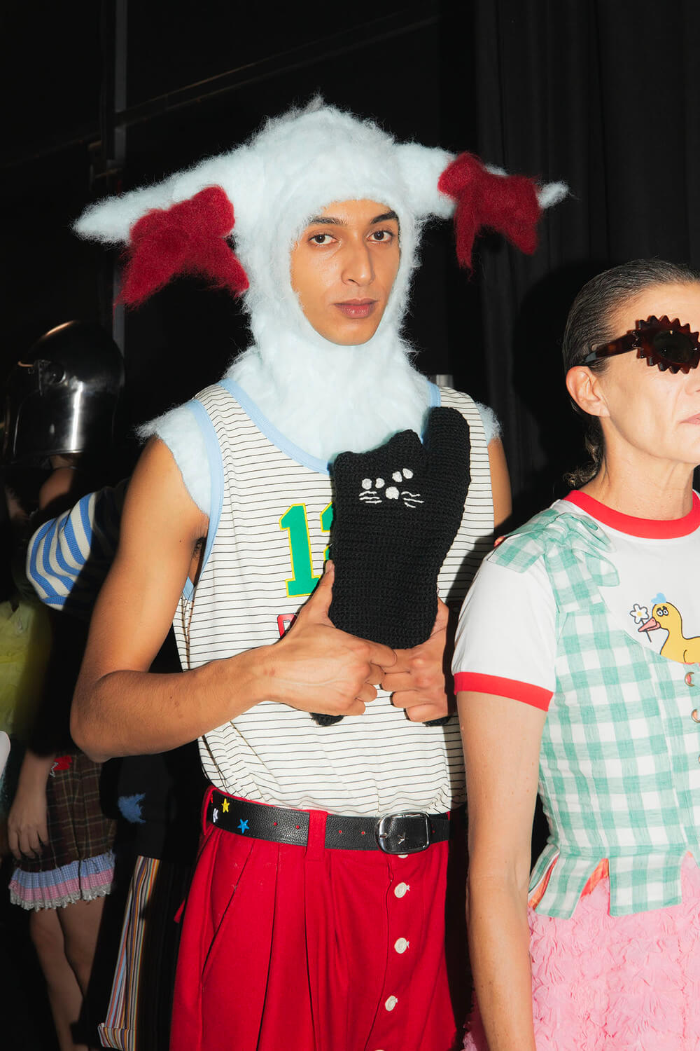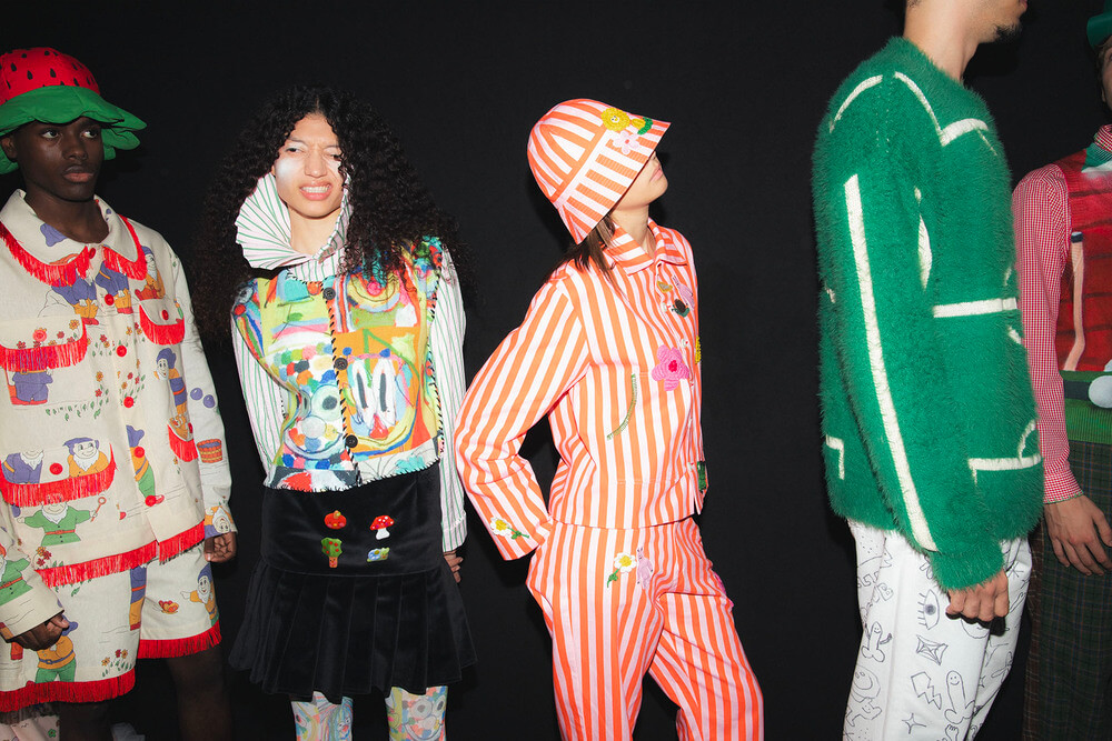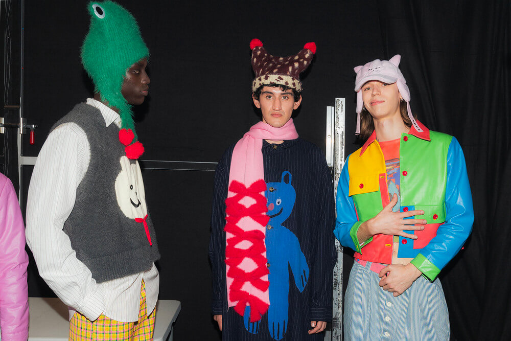 In one corner a model stood with a school-backpack silhouette turned adult-serious; in another, tweed jackets bore cartoon-like patches or oversized appliqués. The vibe is unmistakable: preppy meets punk, play meets polish. (They even label themselves “preppy-punk”.)
