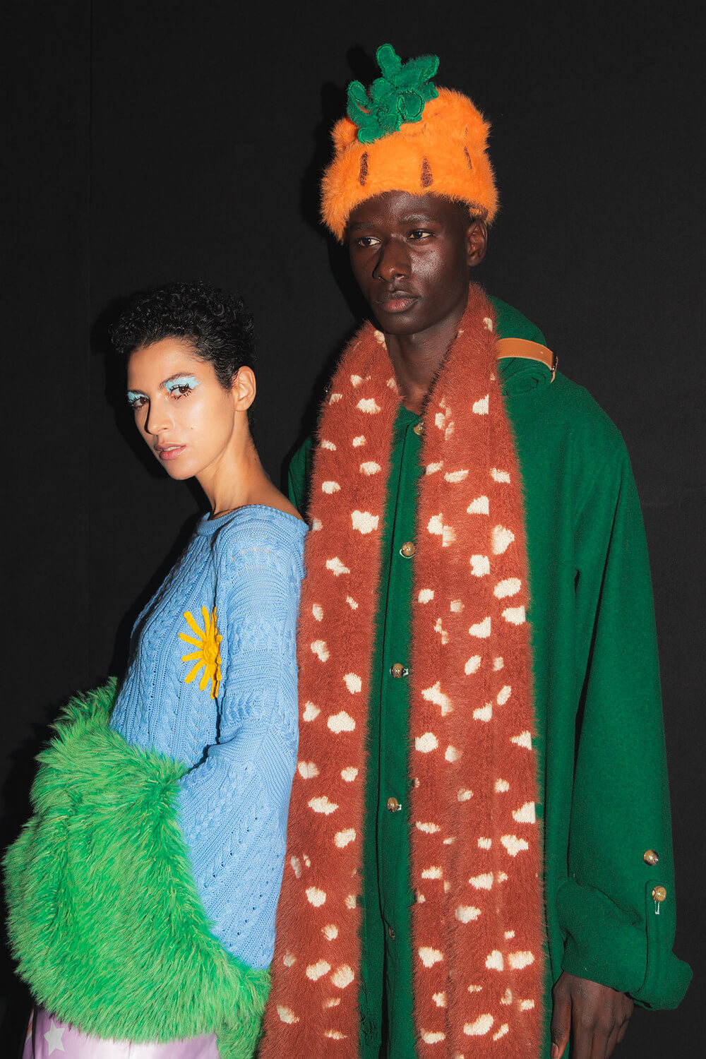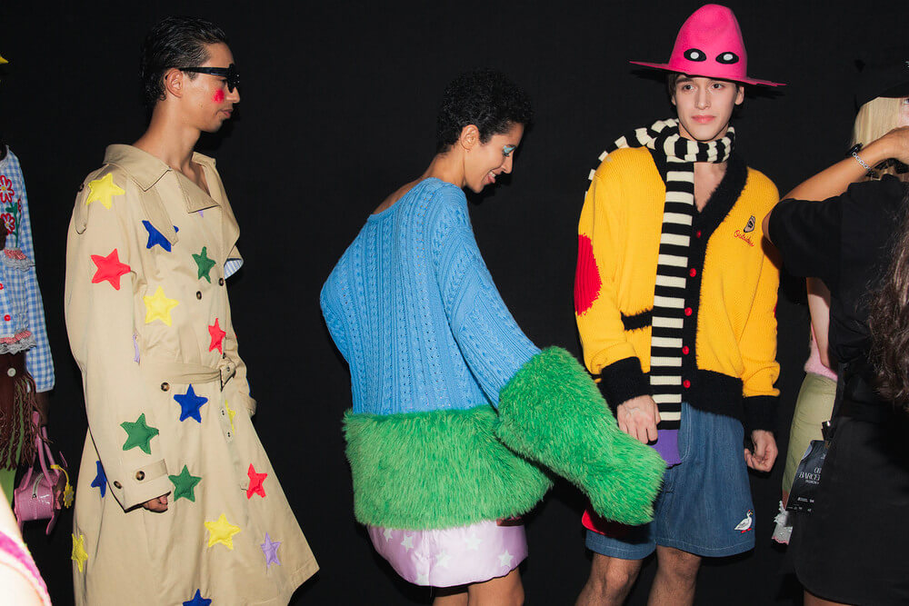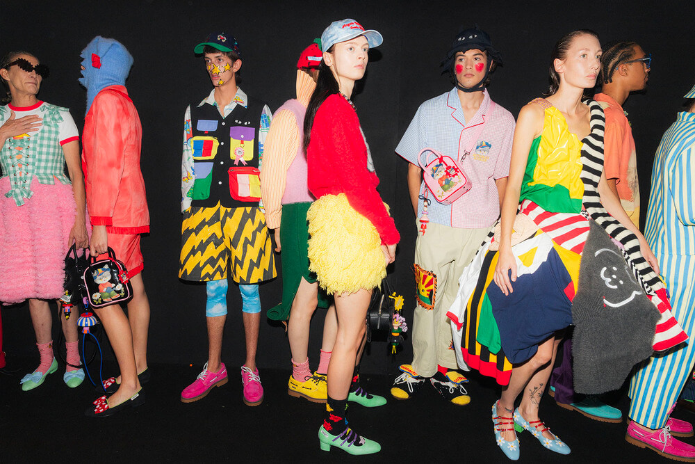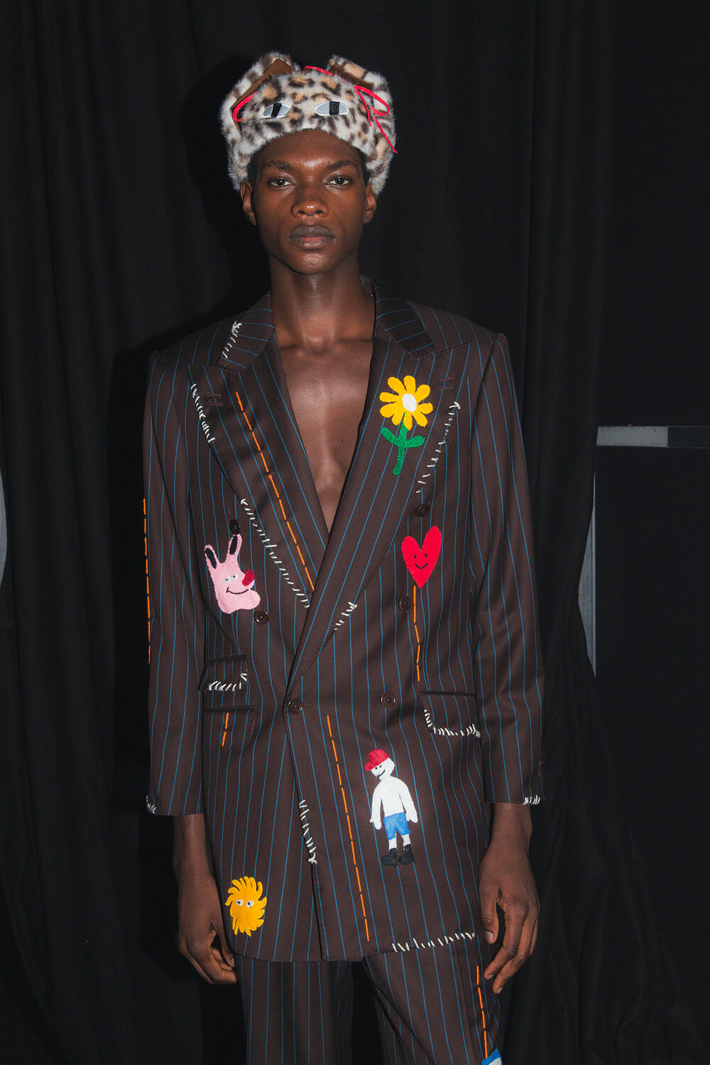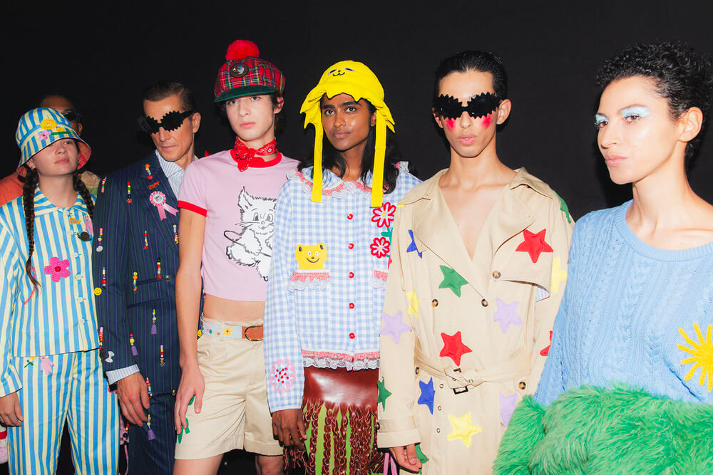 In one corner a model stood with a school-backpack silhouette turned adult-serious; in another, tweed jackets bore cartoon-like patches or oversized appliqués. The vibe is unmistakable: preppy meets punk, play meets polish. (They even label themselves “preppy-punk”.)
