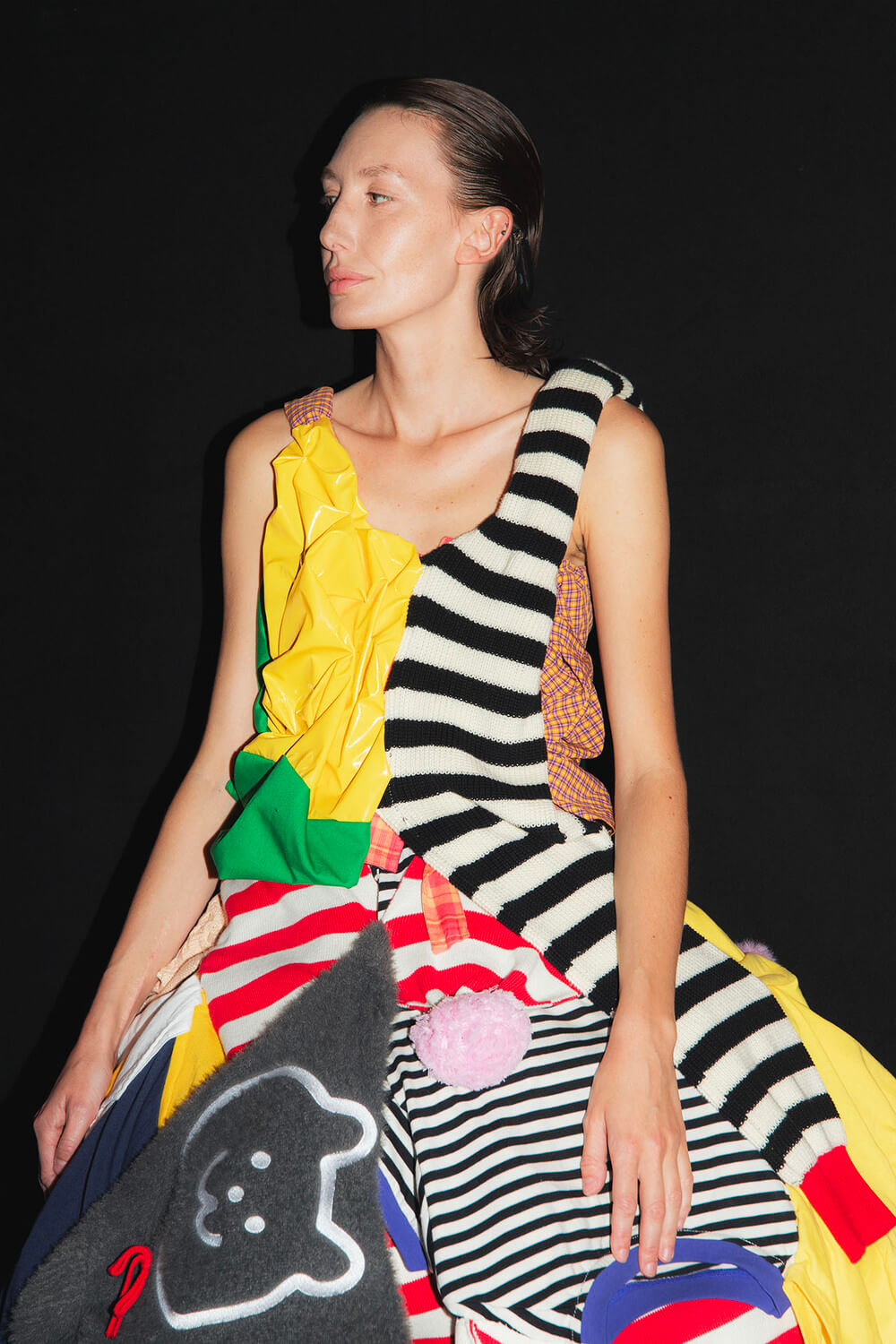 The spectrum here is bold: primaries (yellow, red, blue) crash into muted tweeds, classic plaids and adult tailoring. The materials ranged from school-uniform cottons to what looked like heavy vintage wool, denim patched up with toddlers’ game-print energy, and crochet or knit pieces spliced into structured coats.