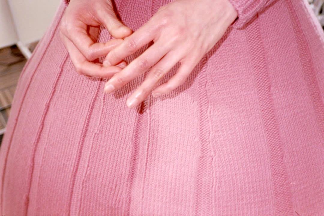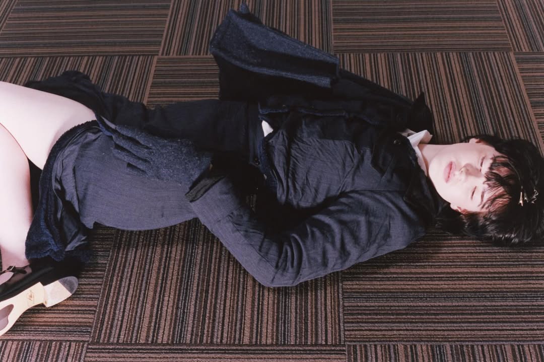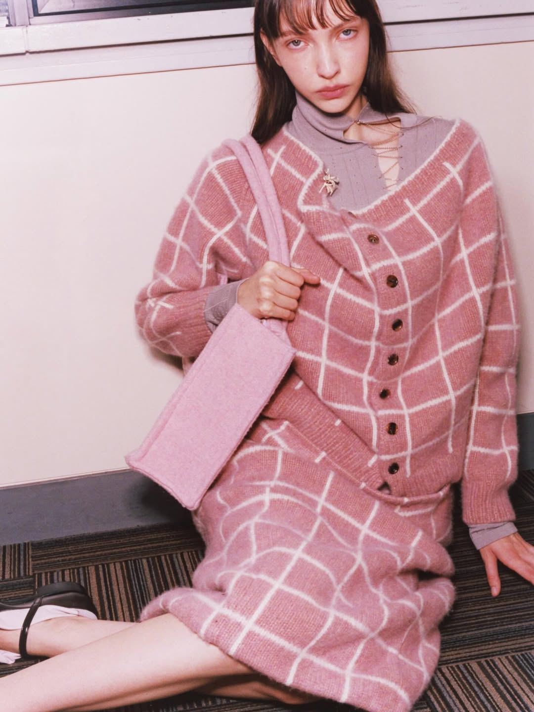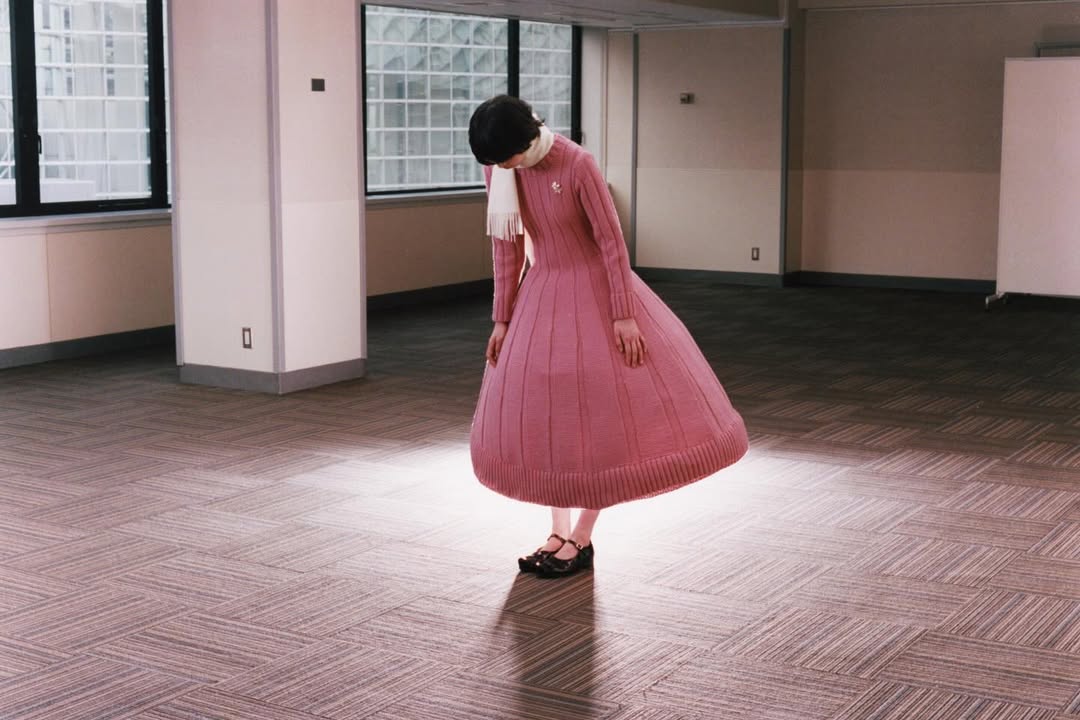 Staged in Tokyo, the show unfolded as a study in perception. The idea of observing clothing from a bird’s-eye view translated into silhouettes that felt sculptural yet intimate. Hand-knitted dresses were stretched over crinolines into princess shapes hovering between fairytale and everyday presence. Cardigans slouched asymmetrically, wool skirts gathered into deliberate crumples, and glossy leather held a cardboard rigidity, sharpening the tension between movement and restraint.