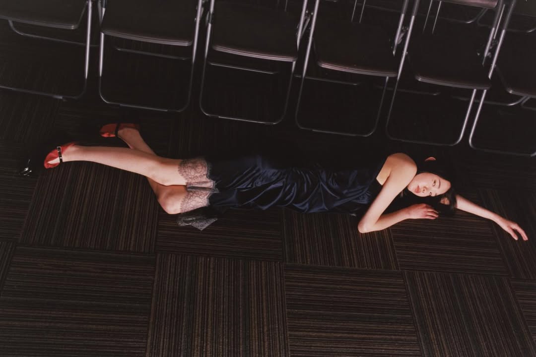 The title Landscapes gestures toward terrain, not only geographic but emotional. Office-like tailoring appeared alongside distorted knitwear, as if routine life had been gently tilted off axis. A striped knitted suit echoed the carpet of the venue itself, folding the outside world back into the garments. Clothing became a surface where interior states and external environments met.