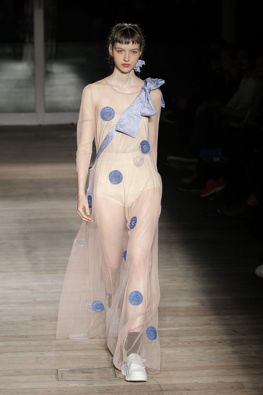 La combinación propuesta por Olimpia Davide de azules y grises con el amarillo fluorescente anunciaba una corriente galvánica que terminó por llenar el espacio de siluetas fluctuantes combinadas con formas asimétricas. Tanto las estructuras como los colores o los tejidos trataban de replicar algunos de los recuerdos que Olimpia tenía de su viaje a Turquía: paisajes urbanos llenos de mil tonalidades de un país moderno y exótico al mismo tiempo. En esta ocasión, fueron el cielo y la arquitectura de Oporto los encargados de enmarcar una colección repleta de contrastes.