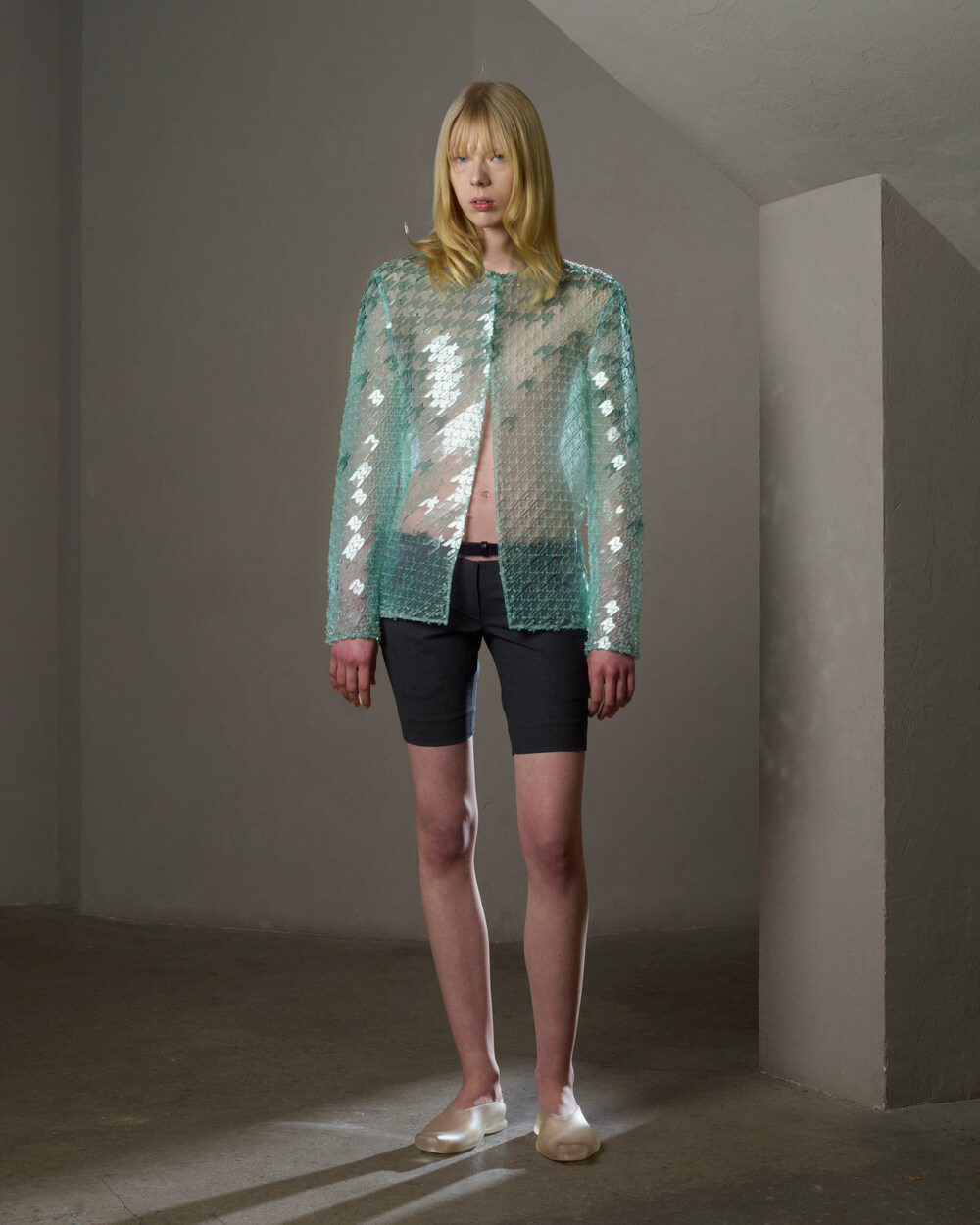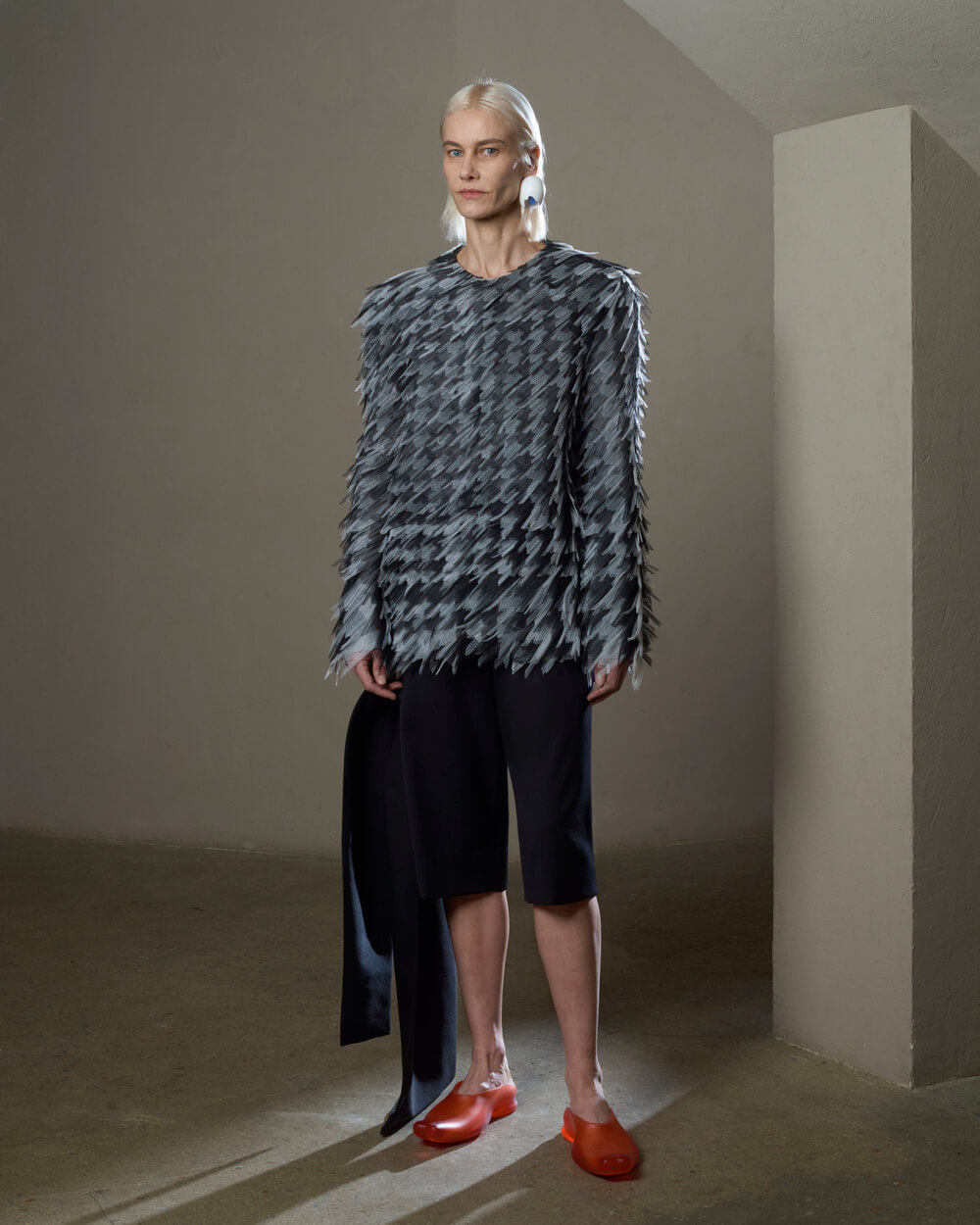Feathers, a recurring material language for LÙCHEN, return with renewed intention. Reimagined through simulated forms, they are cut from reclaimed sources, including leftover fabrics, deadstock, and regenerated plastics. Assembled into pixelated surfaces, this artificial plumage is built through accumulation, repair, and repetition, transforming waste into a new visual and tactile code.