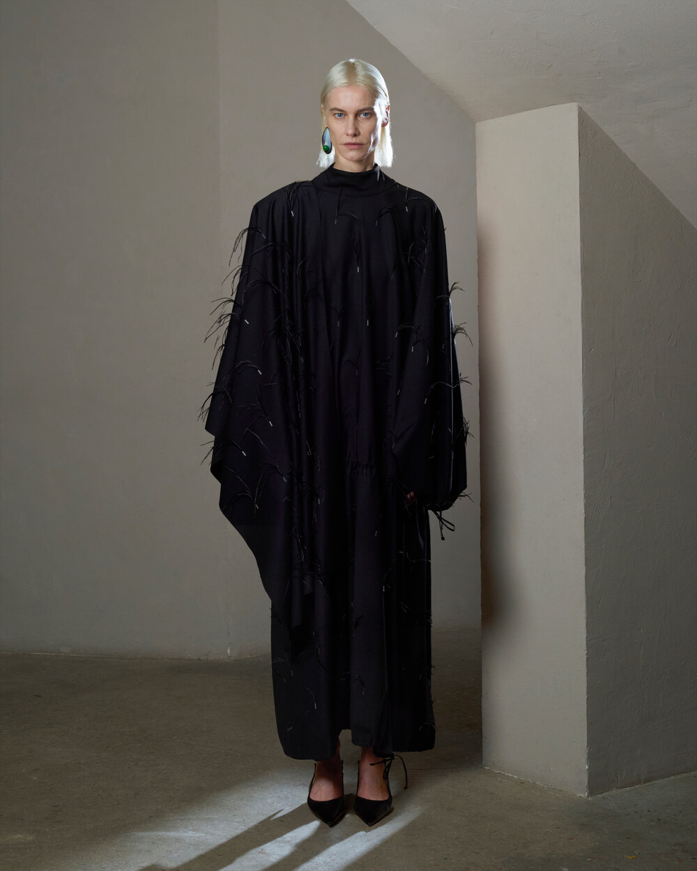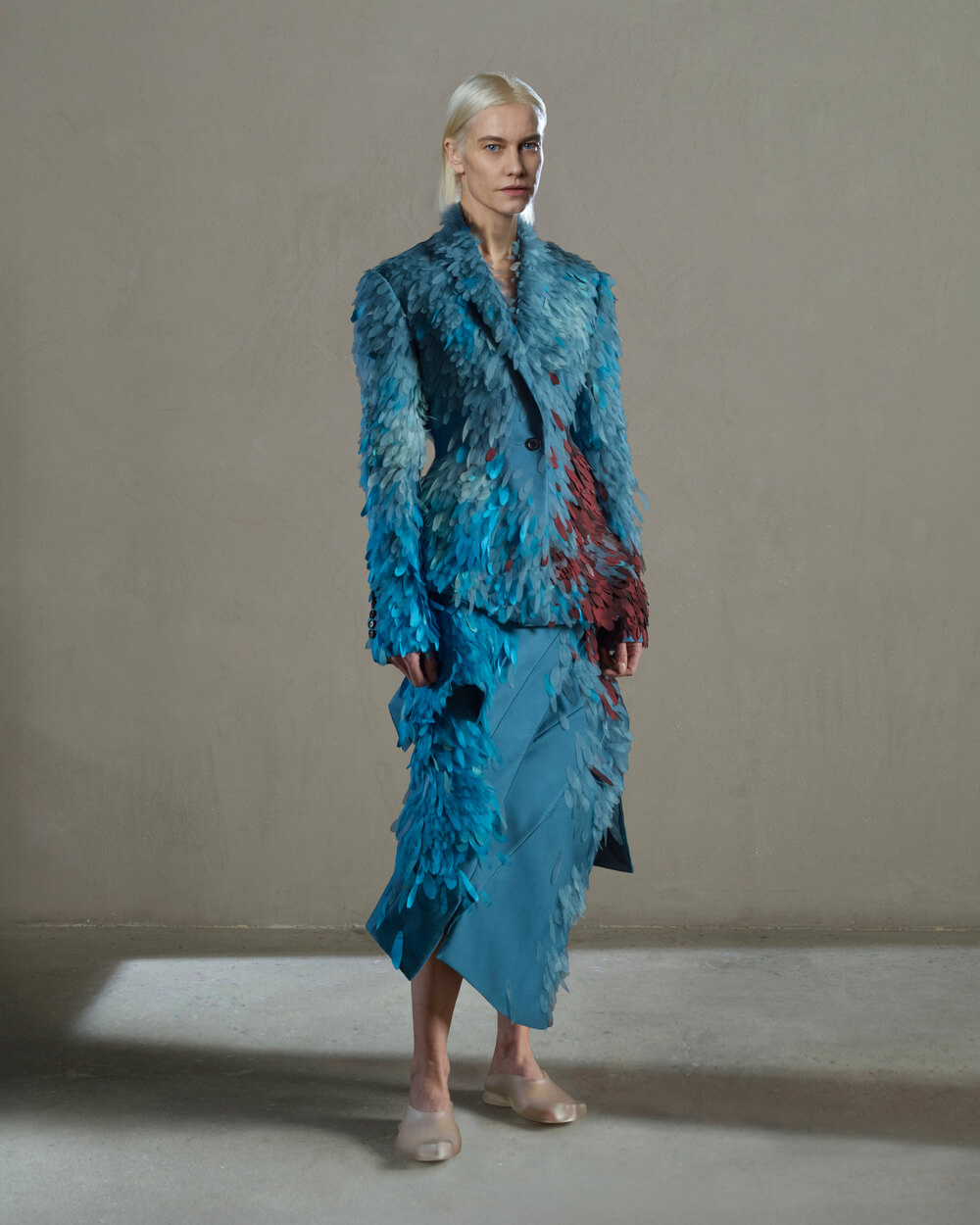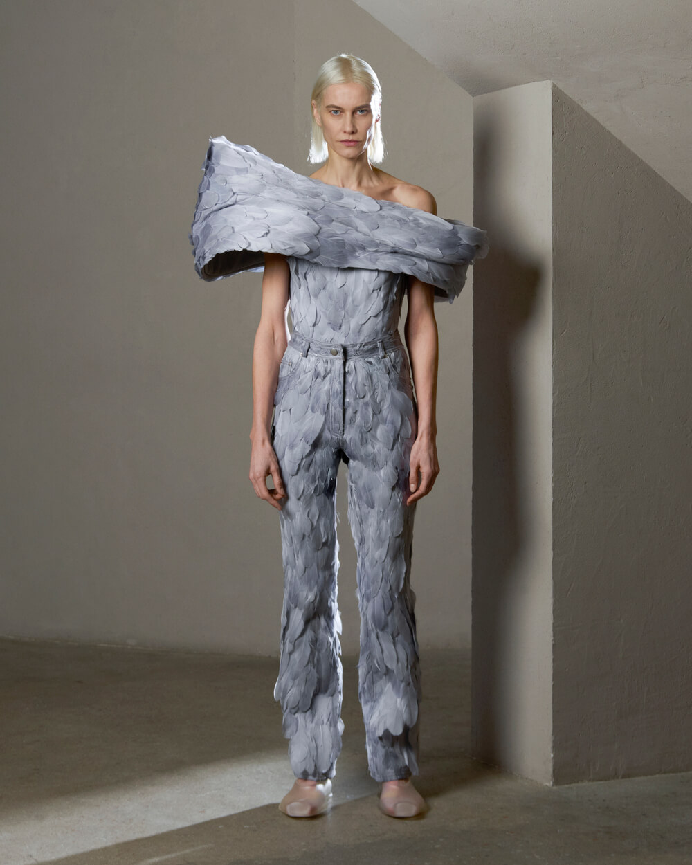 At the heart of the atelier is an evolving archive of recycled materials: remnants from past collections, deadstock fragments, and renewable matter, each carrying its own history. When brought together, these pieces form layered surfaces that record time and process. Set against this are real feathers, chosen for their fragility and impermanence, creating a dialogue between the natural and the constructed, the fleeting and the preserved. The collection expands this material investigation through recycled acrylic, elements derived from landfill waste such as eggshells and mussel shells, and objects displaced by time, like glass marbles. Throughout, the designs negotiate gravity itself, balancing suspended, rigid forms with weight-led drapery, establishing a rhythm between restraint and release.