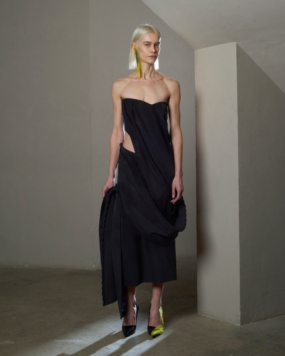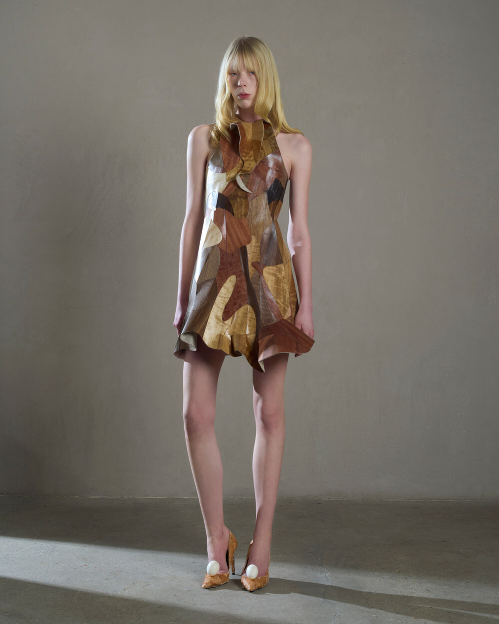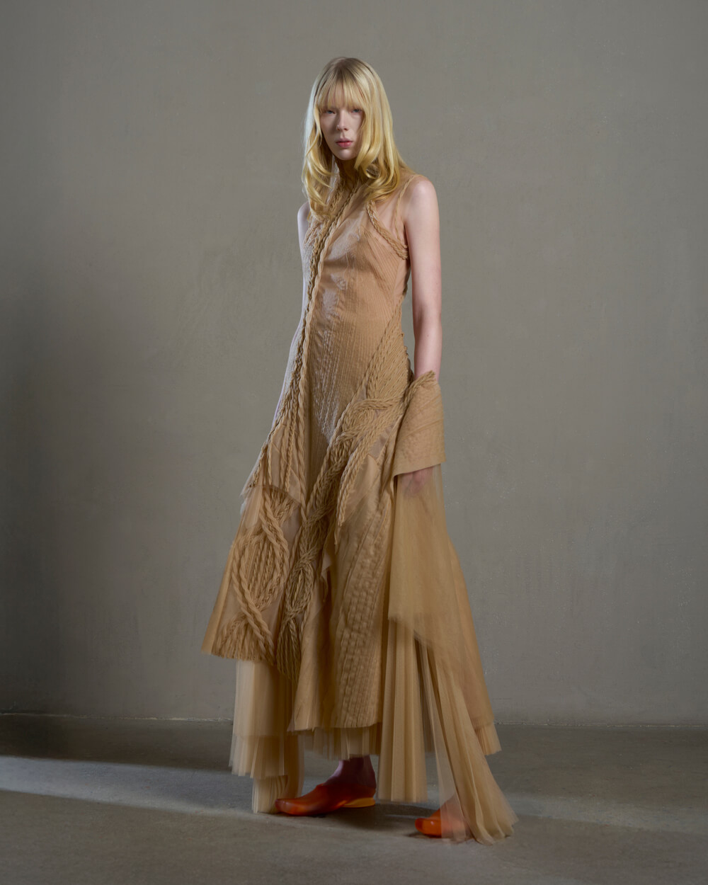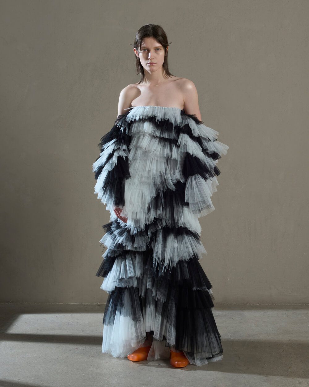 At the heart of the atelier is an evolving archive of recycled materials: remnants from past collections, deadstock fragments, and renewable matter, each carrying its own history. When brought together, these pieces form layered surfaces that record time and process. Set against this are real feathers, chosen for their fragility and impermanence, creating a dialogue between the natural and the constructed, the fleeting and the preserved. The collection expands this material investigation through recycled acrylic, elements derived from landfill waste such as eggshells and mussel shells, and objects displaced by time, like glass marbles. Throughout, the designs negotiate gravity itself, balancing suspended, rigid forms with weight-led drapery, establishing a rhythm between restraint and release.