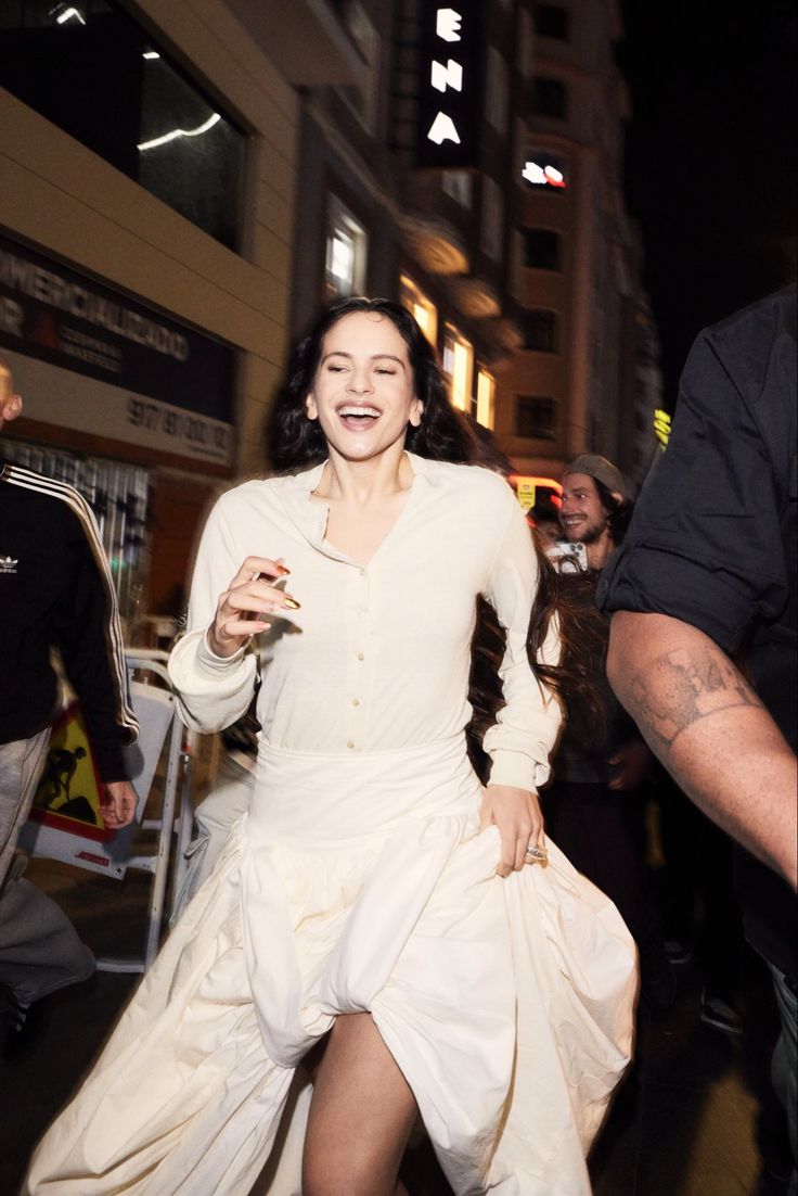 Rosalía wearing Paula Cánovas del Vas dress during the LUX album cover presentation, running down Gran Vía in Madrid. October 2025.