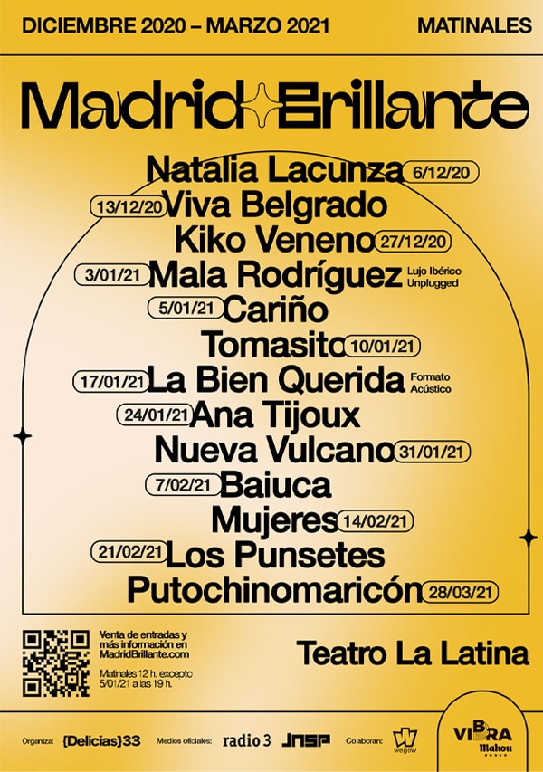 Madrid Brillante apuesta por el talento, por la diversidad y sobre todo por la cultura segura. El Teatro La Latina recoge a artistas como Mala Rodriguez, Los Punsetes, Kiko Veneno, Natalia Lacunza, La Bien Querida, Cariño o Dora, entre muchos otros. Mientrás que el emblemático Teatro Reina Victoria da cabida a Confeti de Oro, al flamenco de Soleá Morente, Triángulo de Amor Bizarro, a la electrónica de Óscar Mulero con su espectáculo “Monochrome AV” o Axolotes Mexicanos…Desde el mediodía podremos ser cómplices de la mejor música en directo de los artistas y grupos más versátiles del panorama actual. Además, el festival contará con las mejores medidas sanitarias para garantizar una experiencia única.