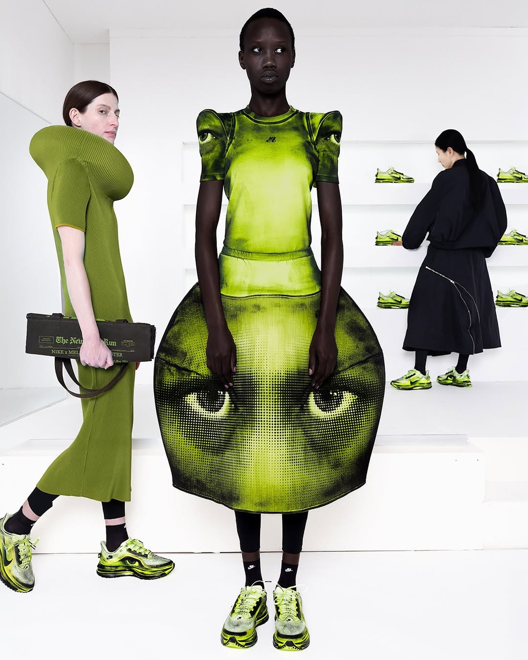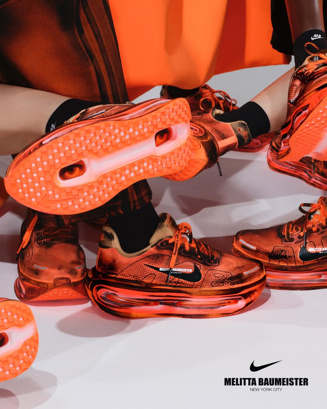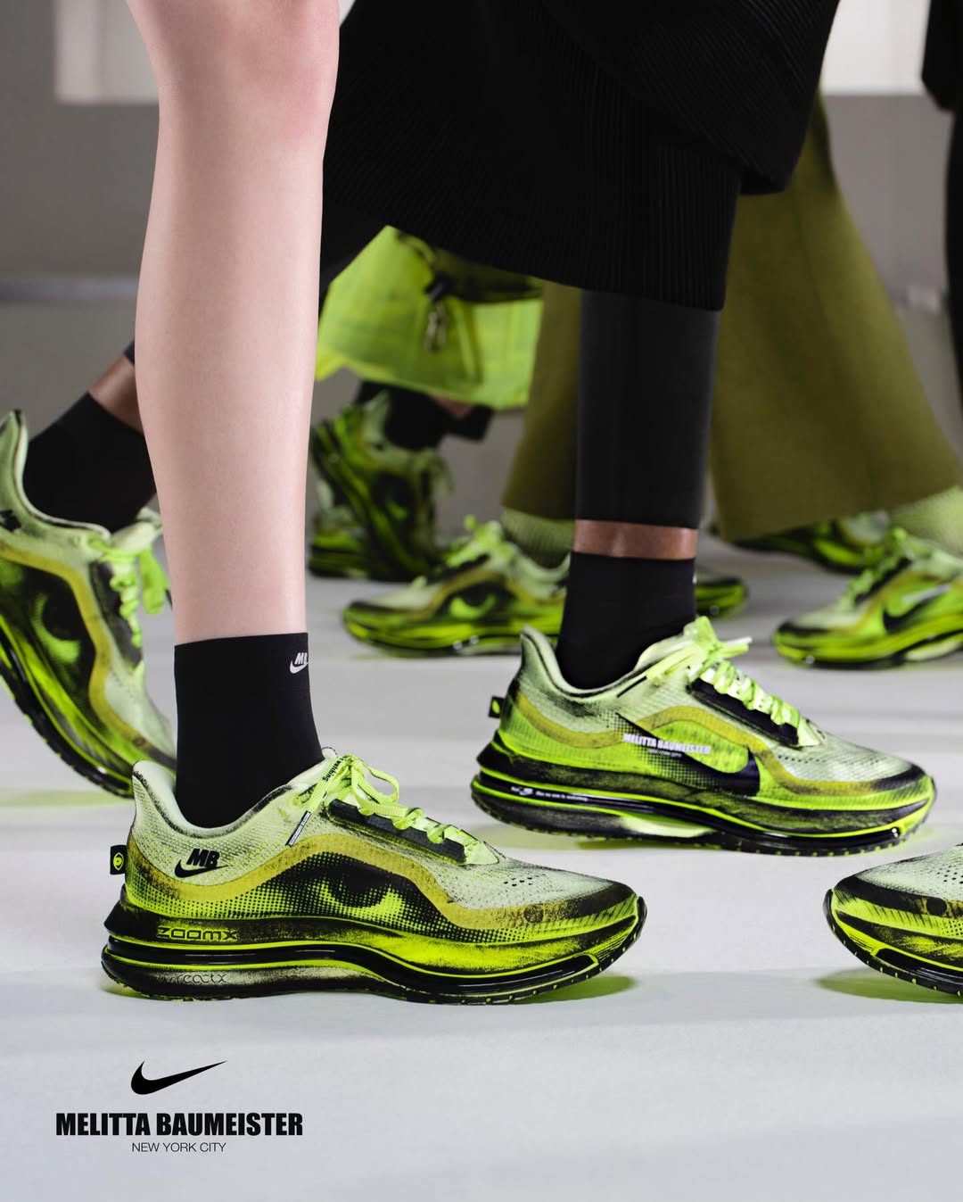 A shoe that first appeared in motion now enters circulation. When Melitta Baumeister presented her AW26 collection in New York, the collaboration with Nike extended her exploration of the body into footwear, introducing a reworked Vomero Premium defined by inflated volumes, molten surfaces and a radical sense of tactility. That runway moment becomes product with a dual timeline: first available on April 1 through her own platform, followed by a wider global rollout on April 8 via Nike and selected retailers.