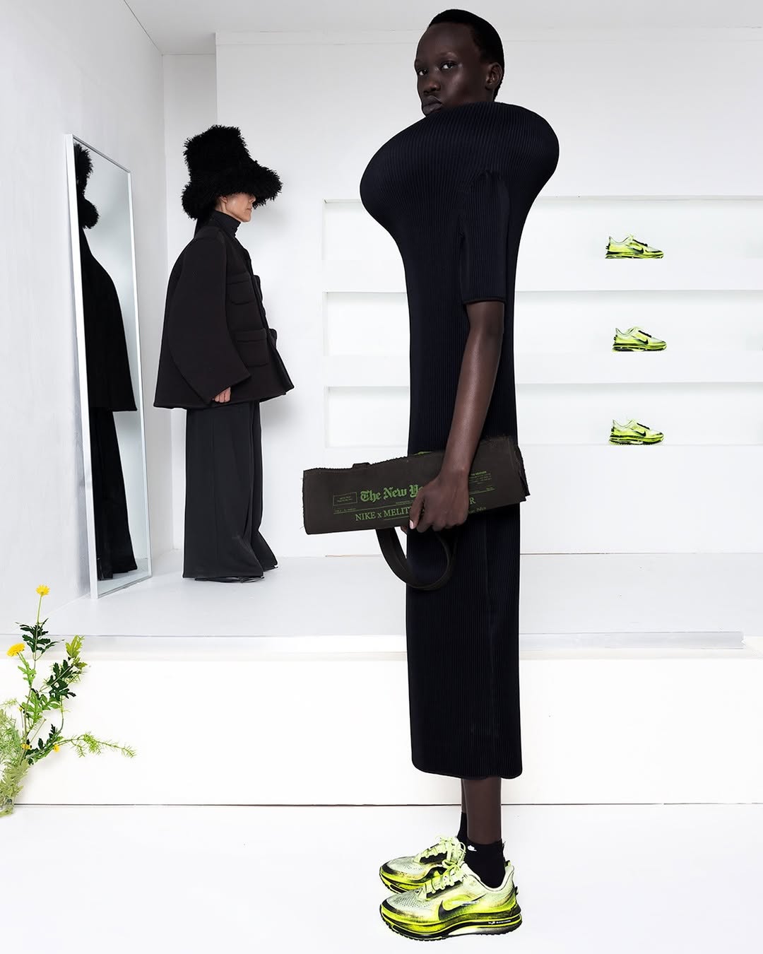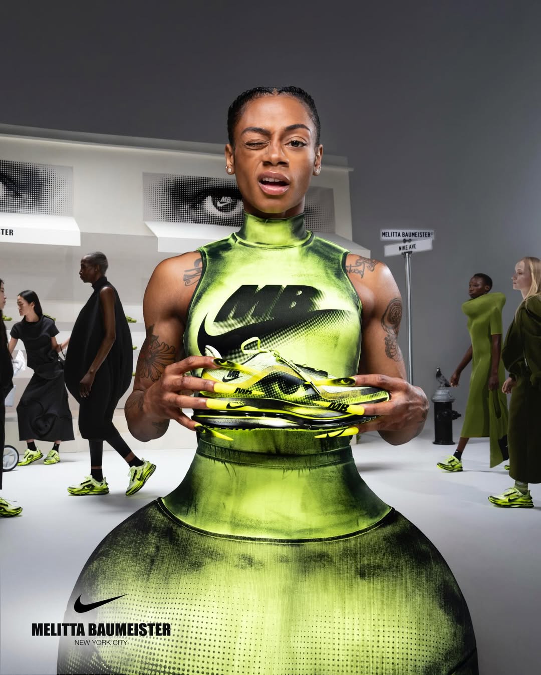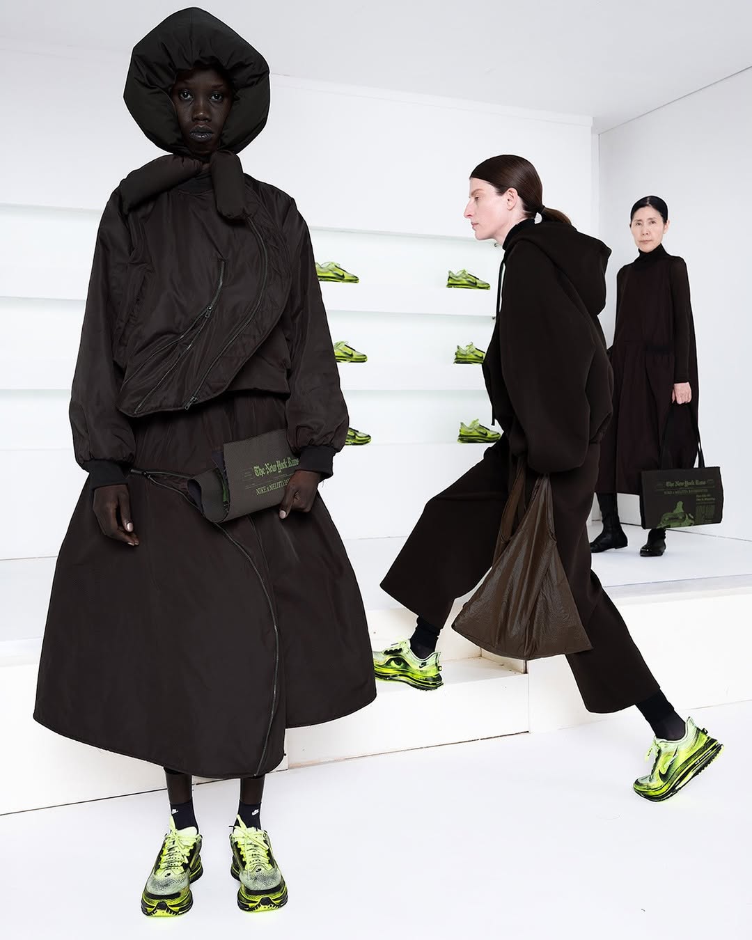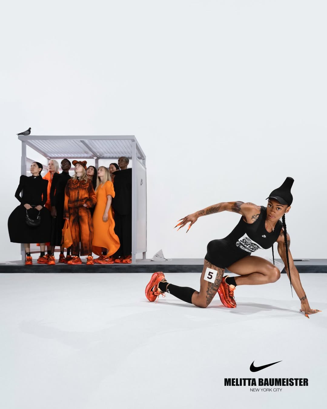 A shoe that first appeared in motion now enters circulation. When Melitta Baumeister presented her AW26 collection in New York, the collaboration with Nike extended her exploration of the body into footwear, introducing a reworked Vomero Premium defined by inflated volumes, molten surfaces and a radical sense of tactility. That runway moment becomes product with a dual timeline: first available on April 1 through her own platform, followed by a wider global rollout on April 8 via Nike and selected retailers.