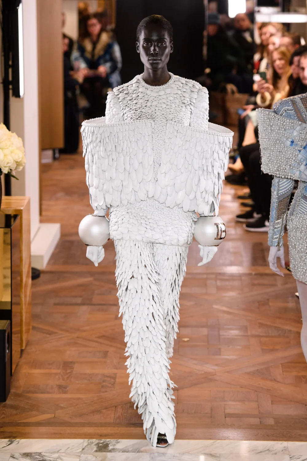 Haute couture became Rousteing’s laboratory of innovation. The Spring/Summer 2019 Couture collection brought Balmain back to the couture calendar with authority: 3D structures, unconventional materials—latex, transparent PVC, embedded crystals—and a narrative balancing future and tradition.