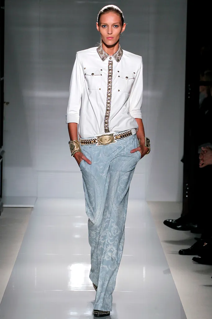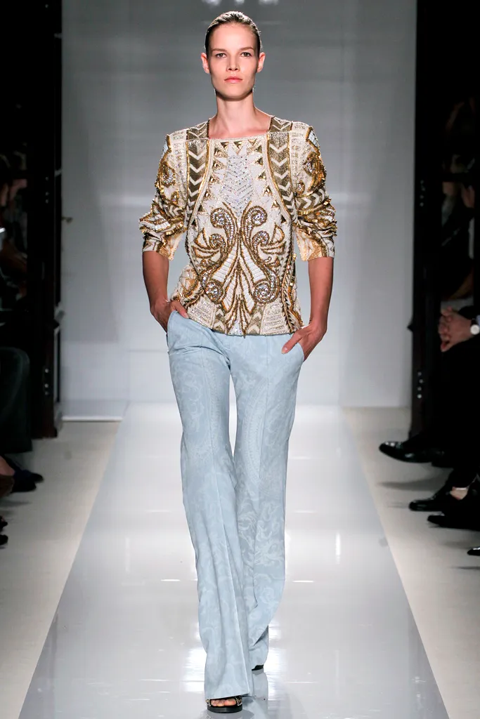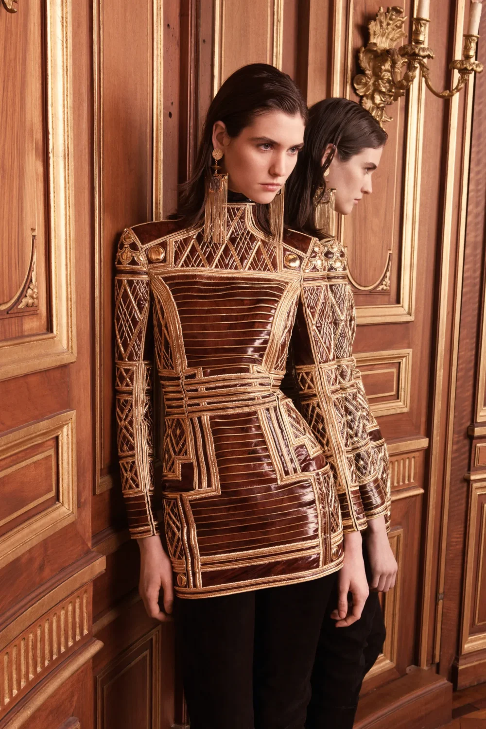 By 2013, Rousteing fully owned his creative voice. The Pre-Fall collection fused cultures, elevated craftsmanship, and embraced global aesthetics. Dresses resembled mosaic panels of patent leather; double-breasted metallic jacquard blazers; cuts reminiscent of Japanese bishops, paired with turbans and reimagined sarouel pants.