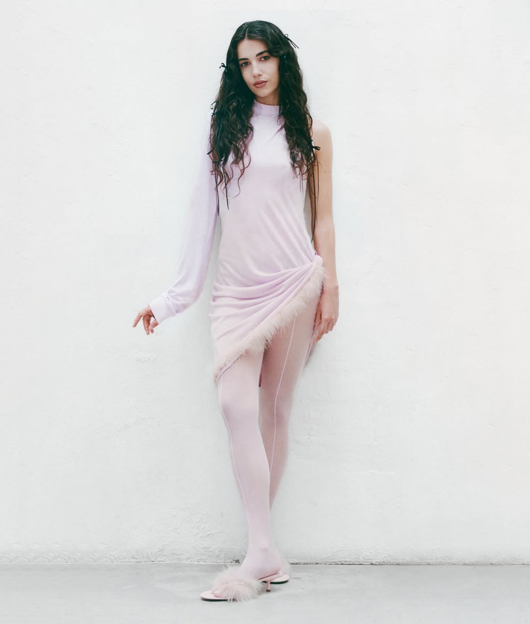 Visually, SS26 takes codes that can read as decorative or outdated and makes them feel sharp again. Feathers, florals, lace and velvet surface through twisted T shirts, mini skirts and diagonal cuts that reshape the silhouette with ease. Asymmetry adds sculptural tension while staying fluid, so the body leads and the garment follows. A unisex thread runs through the line via polo shirts with subtle embroidery and a discreet “miss you” printed across the back, a small detail that lands like a confession.