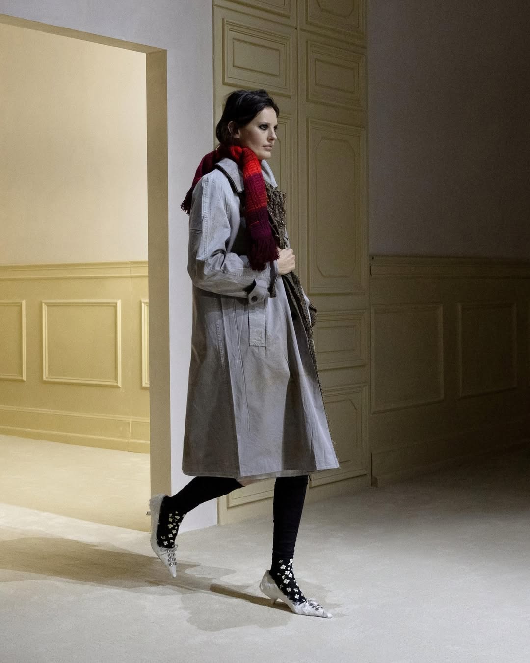 The show translated that idea into a clear structure: fifteen women, each returning four times, with looks that shifted as if time had passed between exits. A coat disappeared to reveal a knit, a knit gave way to a dress, a dress exposed a quieter base beneath. The runway became a sequence of decisions rather than a parade of isolated statements.