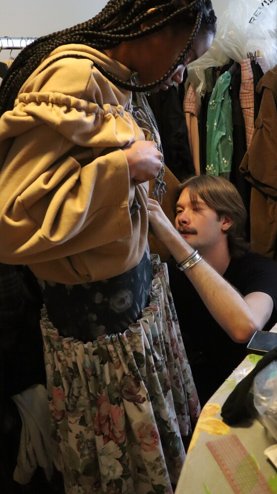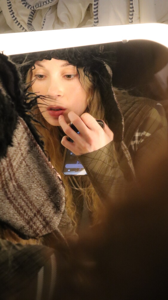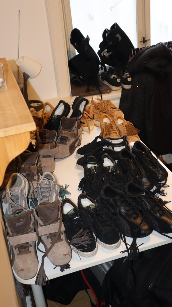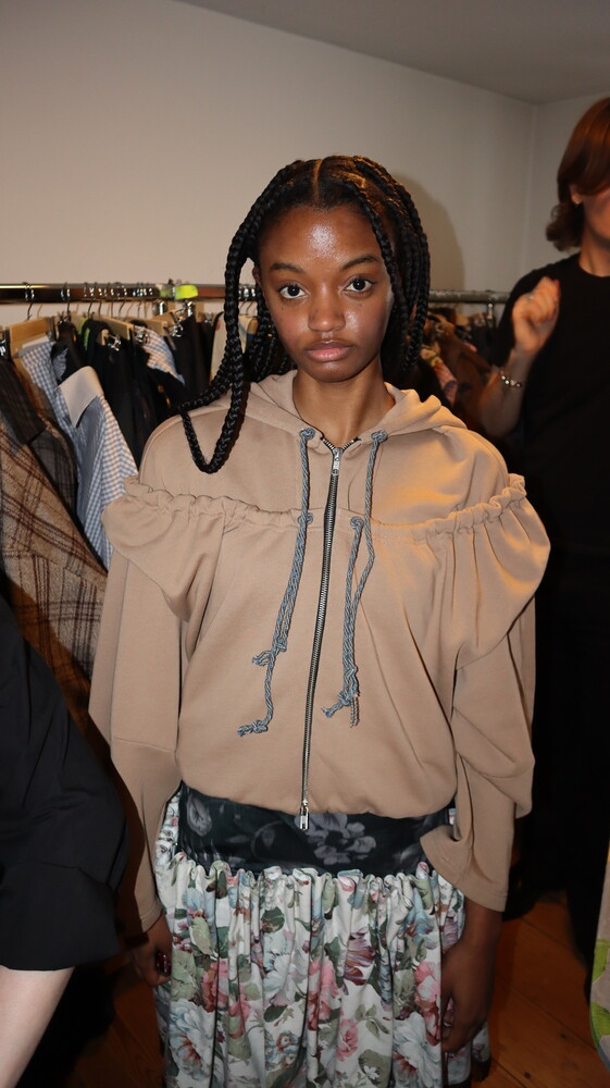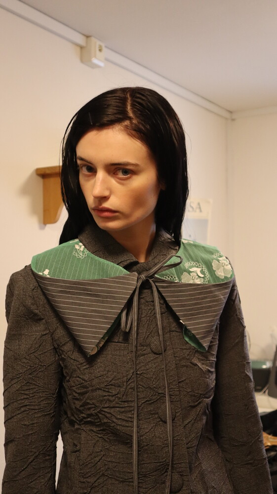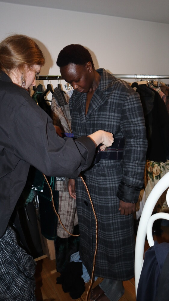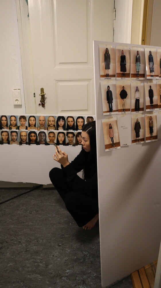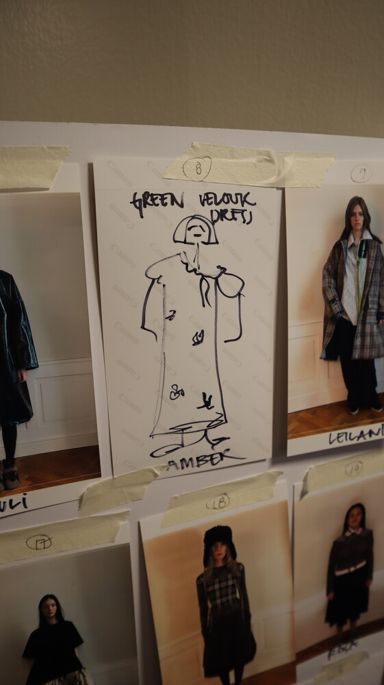Inside, it was like being in a dollhouse; everything was gloriously random. The living room doubled as the make-up centre, and the bathroom became a holding room where models awaited to be summoned from the kitchen. At its door, a mood board displayed every look; some of them were doodled by the team members, but they reminded us of children’s drawings because of the eyes and broad smiles. Two girls cross-checked each outfit and called the models in, while garments dangled from hangers and a team member quietly dictated who would go next—only two could squeeze into the fitting room at a time. The needles and pincushion lay on a shelf. On the kitchen table, a lineup of Puma sneakers stood displaced, effortlessly chic.