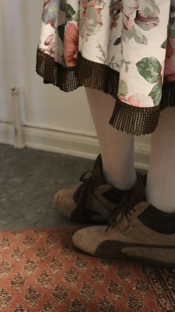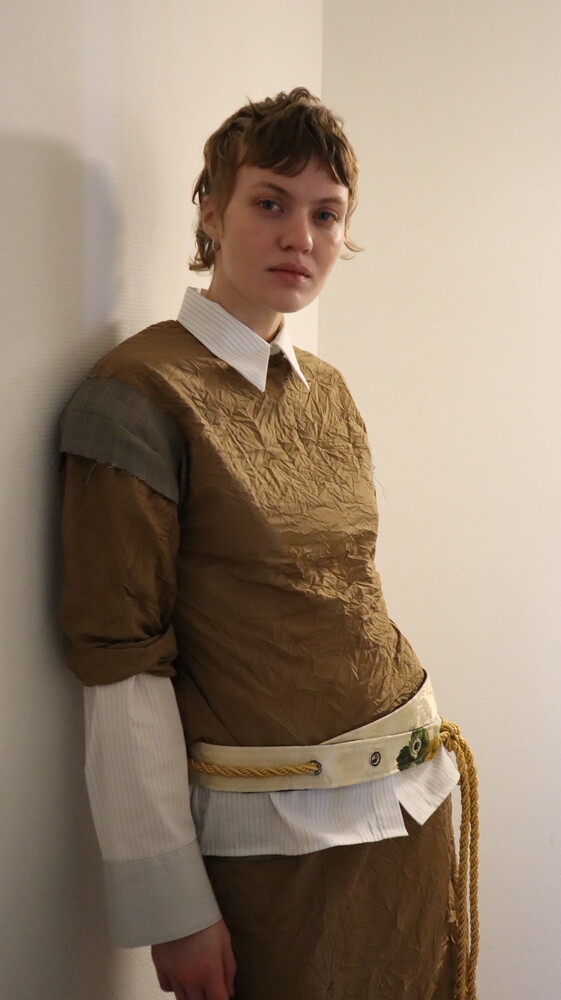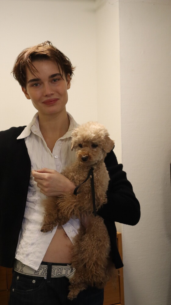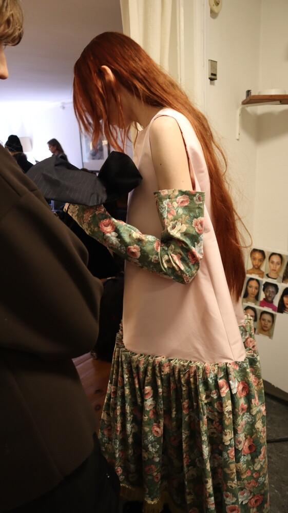 Fantastic people came out. Huge buttons, long sleeves, and a length that could be adjusted to any size by changing the buttons or adjusting the belts, which resembled curtain cords. A-line silhouettes and curtains hanging from dresses or skirts gave the impression of being lamps. The brand actually works with furniture fabrics, integral to its DNA, through the reuse of deadstock, vintage textiles, or discarded blankets. One model carried her little dog hanging from her arm. It was so still that at times I thought it was a stuffed animal.